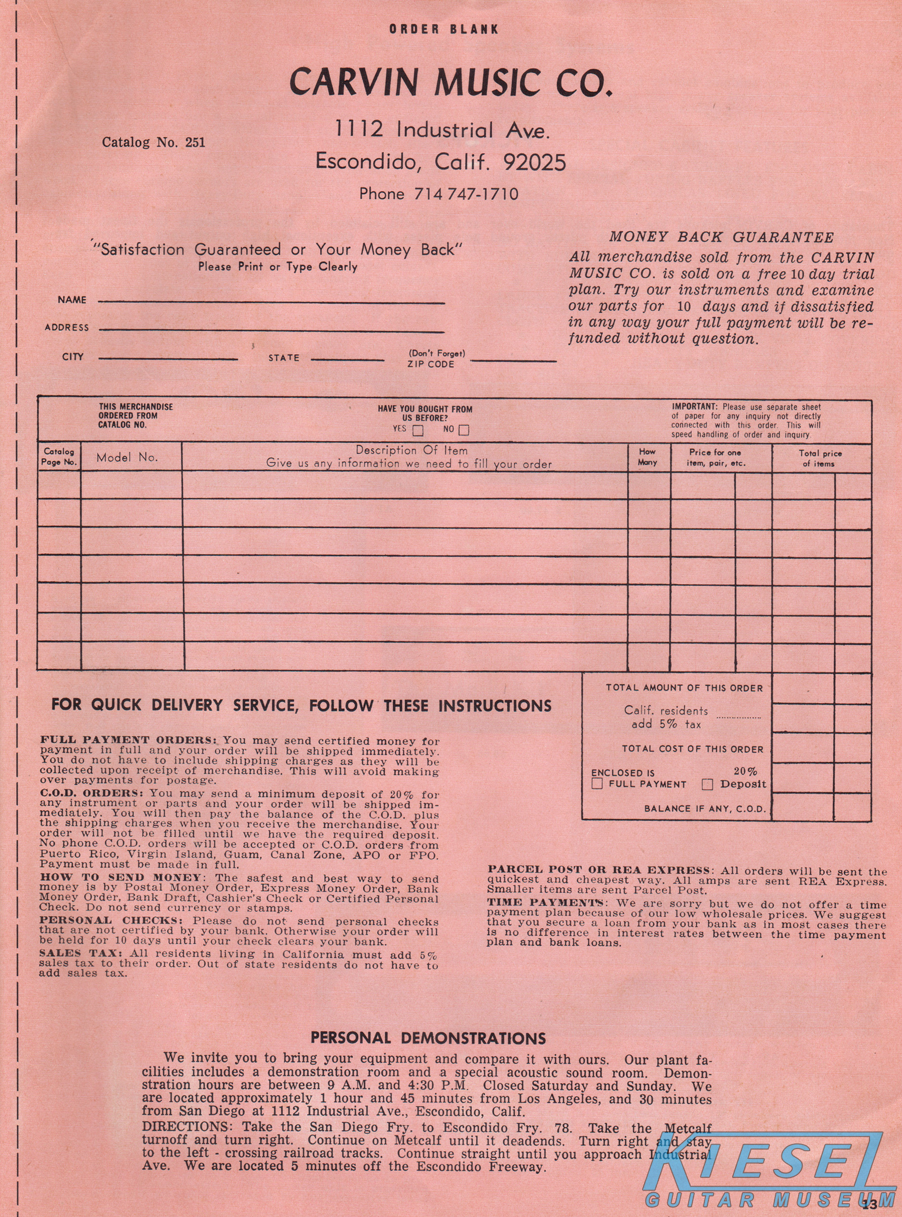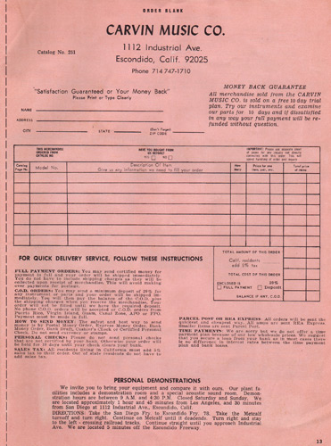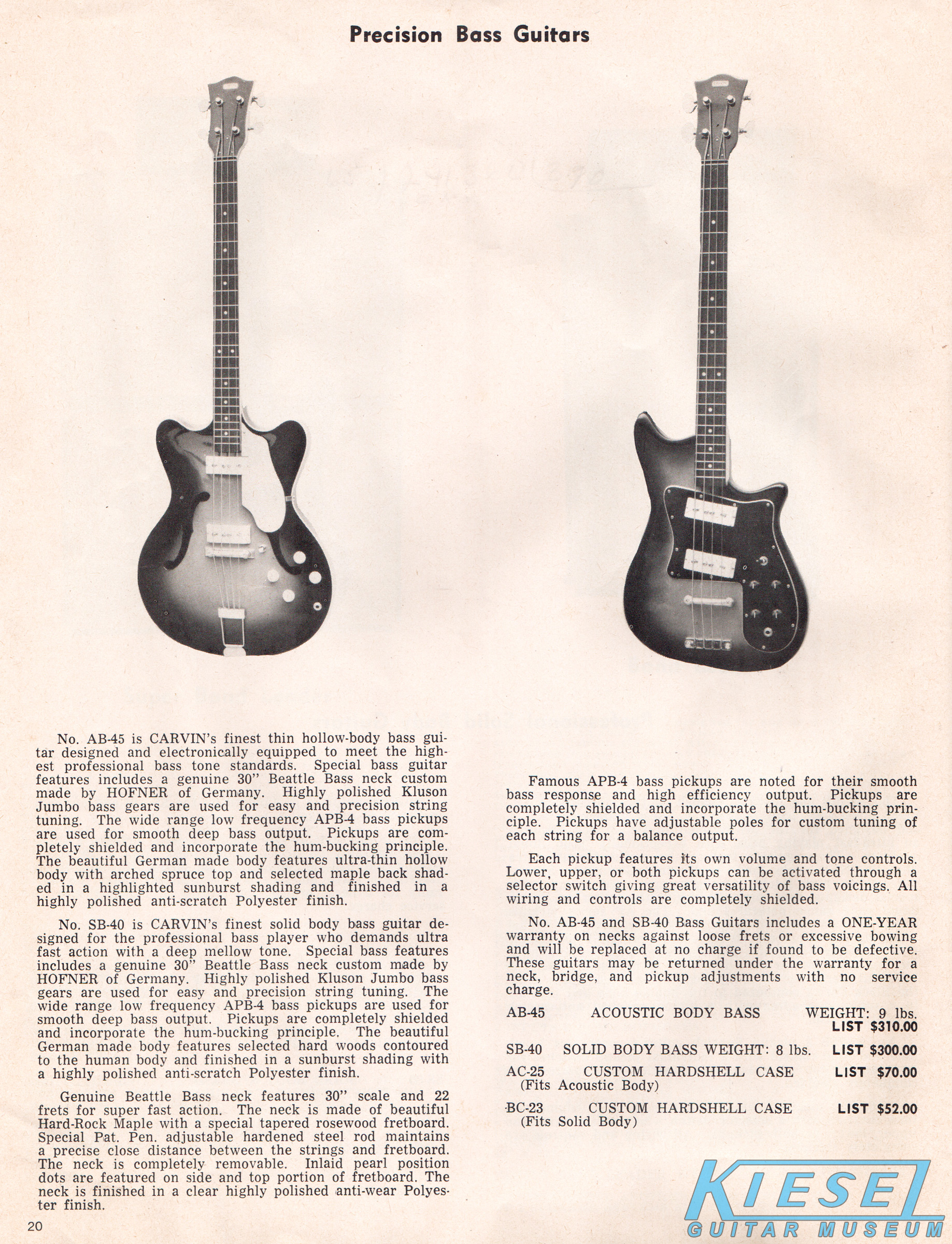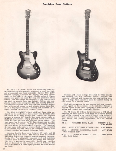 The hollow-body AB45 bass was available in sunburst finish, and was equipped with the standard 22-fret Hofner-made neck that would be a mainstay of Carvin basses until they began producing their own necks in the late 1970s. The catalog referred to the body as "German made", but did not specifically mention if this was also made by Hofner. However, the body looks identical to the Hofner 500/6 bass from the same era, so most likely, the entire instrument was Hofner-made, and assembled by Carvin in California. Other features of the AB-45 were Kluson tuners, rosewood fingerboard, pearl inlays, and APB-4 pickups with dual volume and tone controls, and a 3-way selector switch. Direct price on the AB45 was $155.00.