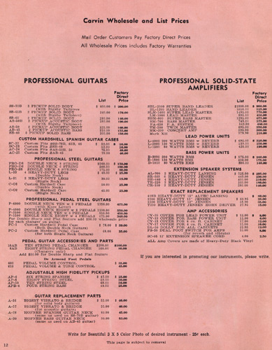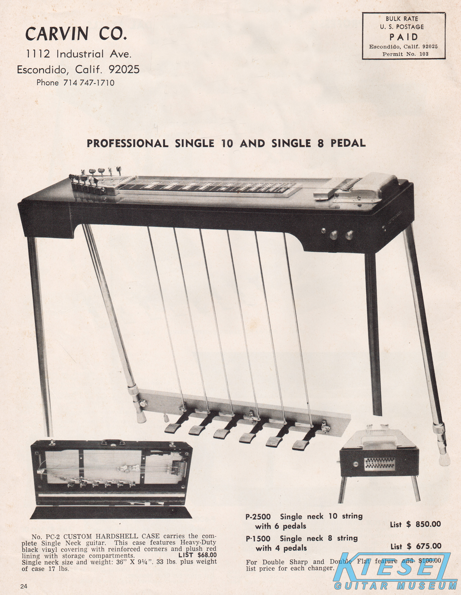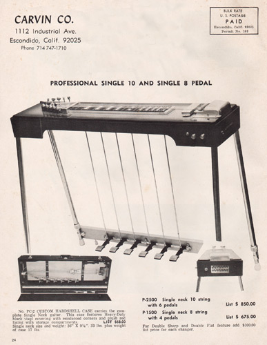 There were also a pair of single-neck pedal steel guitars offered in 1970, which were featured on the back cover of the catalog: the P2500 10-string with 6 pedals, and the P1500 8-string with 4 pedals. The construction materials and electronics were the same as the double-neck counterparts. The P2500 sold for $450.00, and the P1500 sold for $360.00.
