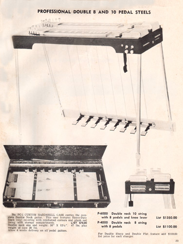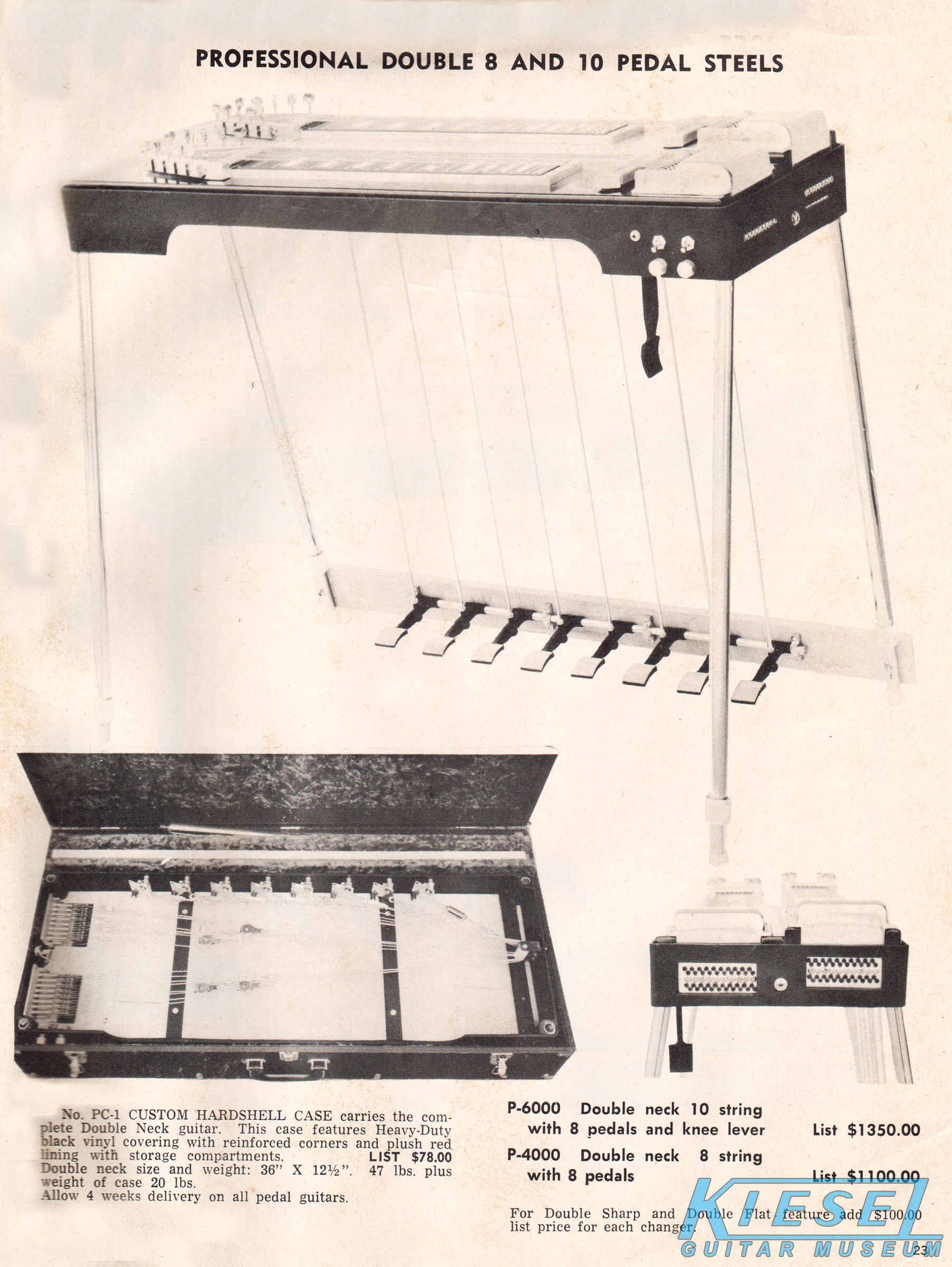 There were two doubleneck pedal steel guitars offered in 1970 - the P6000 double-ten and the P4000 double-eight. Both were constructed from Eastern hardrock maple, with standard 23" scale fingerboards and lacquered sunburst finish. Electronics consisted of an AP-8 or AP-10 pickup with a single volume and tone control. The P6000 with 8 pedals and knee lever sold for $675.00. The P4000 with 8 pedals sold for $550.00. A double sharp and double flat changer could be added for $50.00.