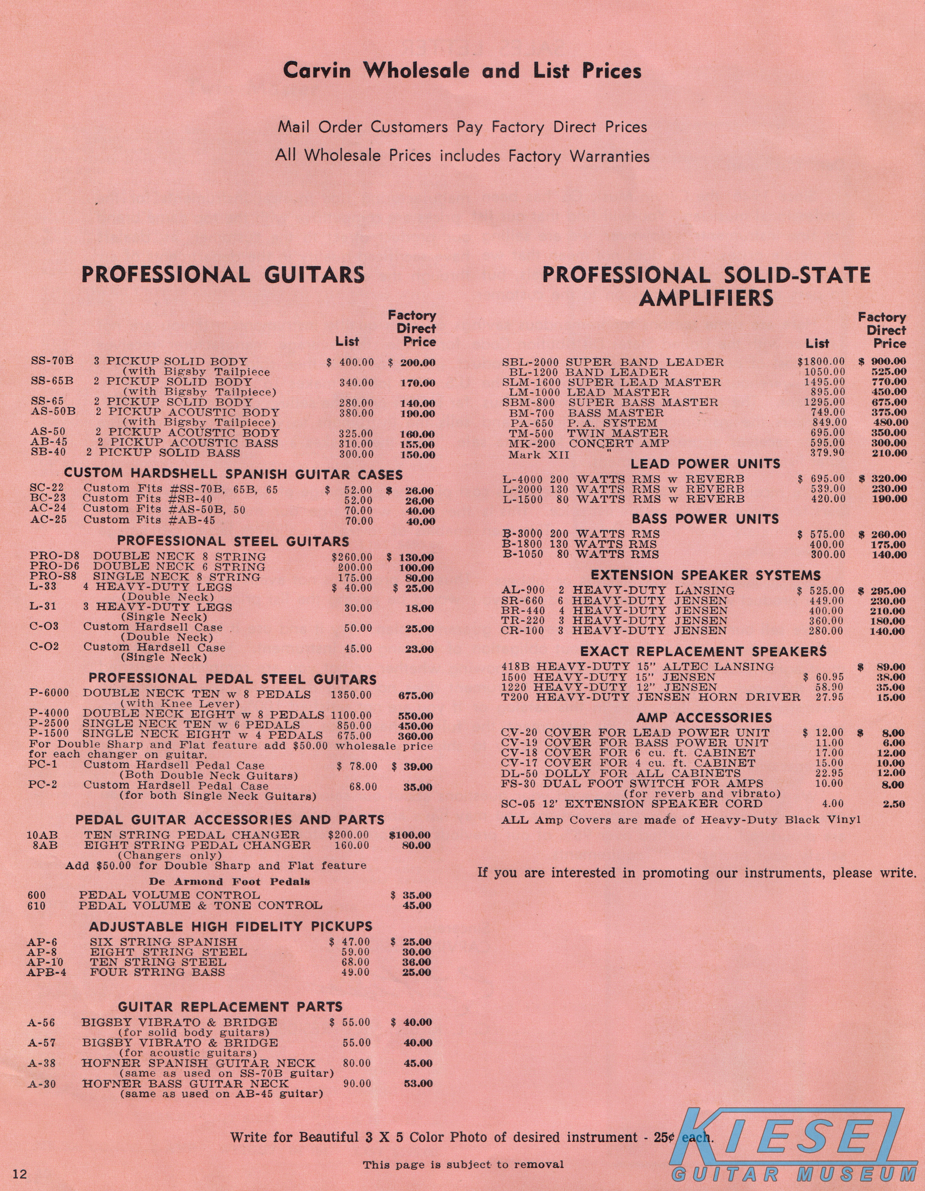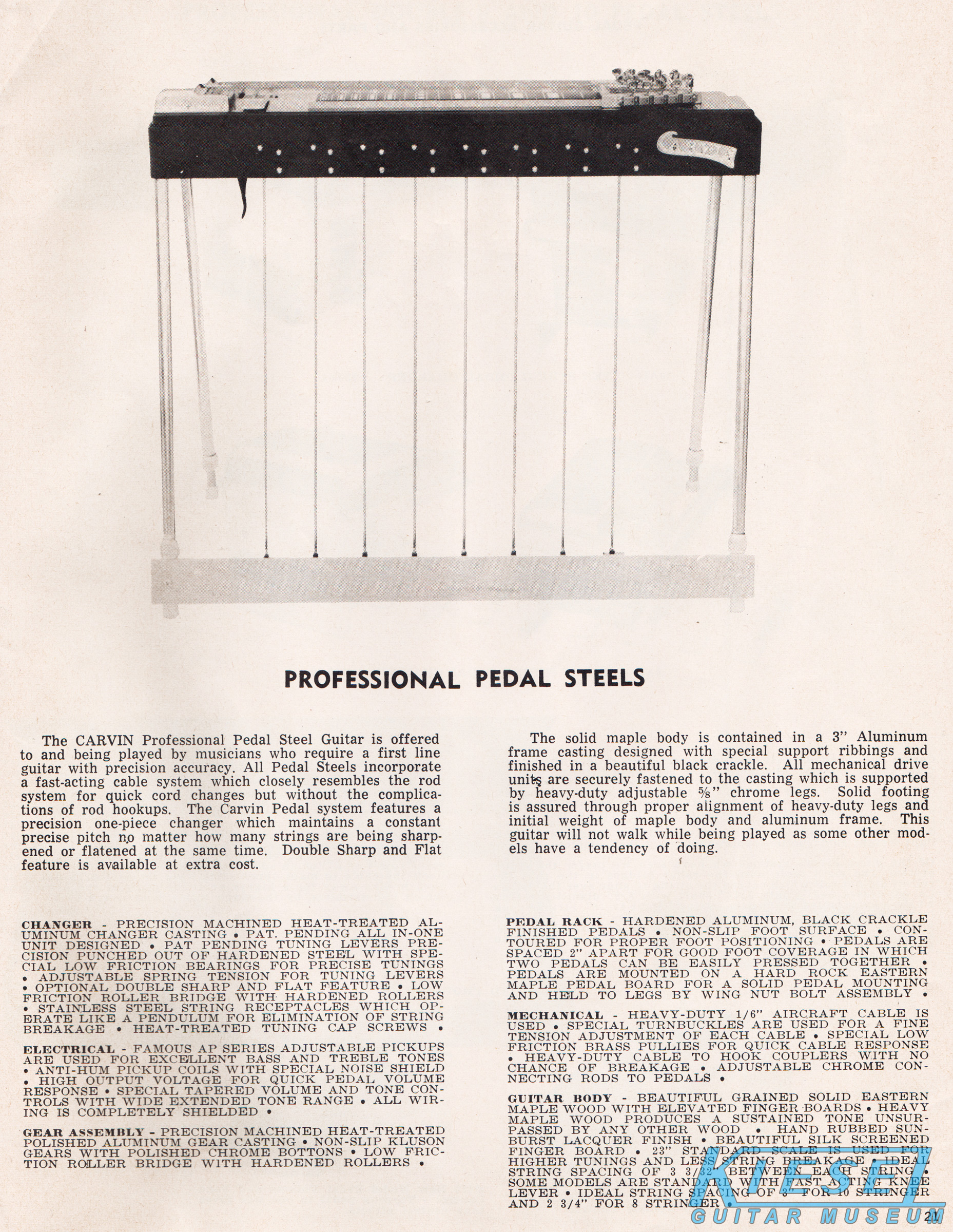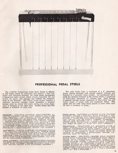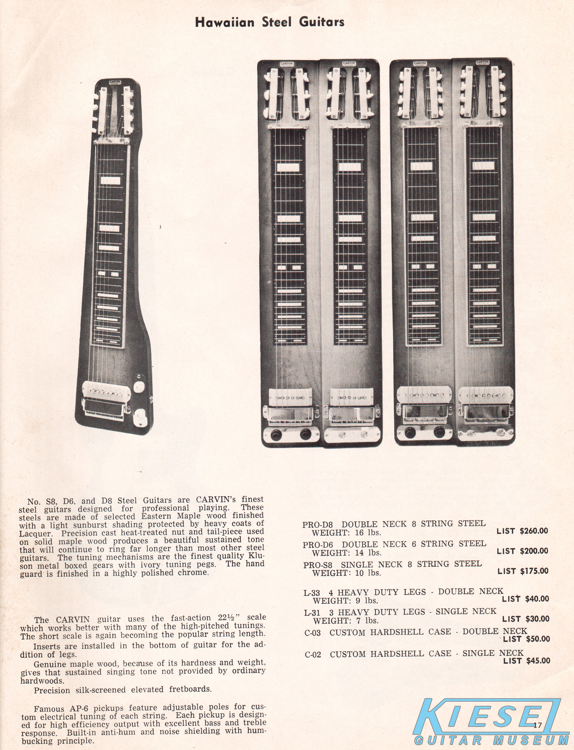 Carvin offered 3 lap steel guitars (also referred to as Hawaiian steel guitars) in 1970. The PRO-S8 was a single neck 8-string model with single AP-8 pickup and master volume and tone controls. It sold for $80.00. The PRO-D6 was a doubleneck 6-string model, with AP-6 pickups, and master volume and tone controls. It sold for $100.00. The PRO-D8 was a double-eight, with AP-8 pickups and master volume and tone controls. It sold for $130.00.
