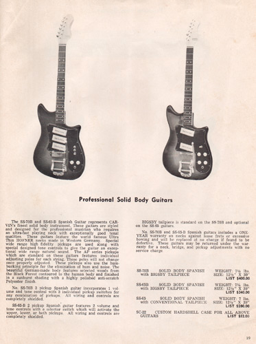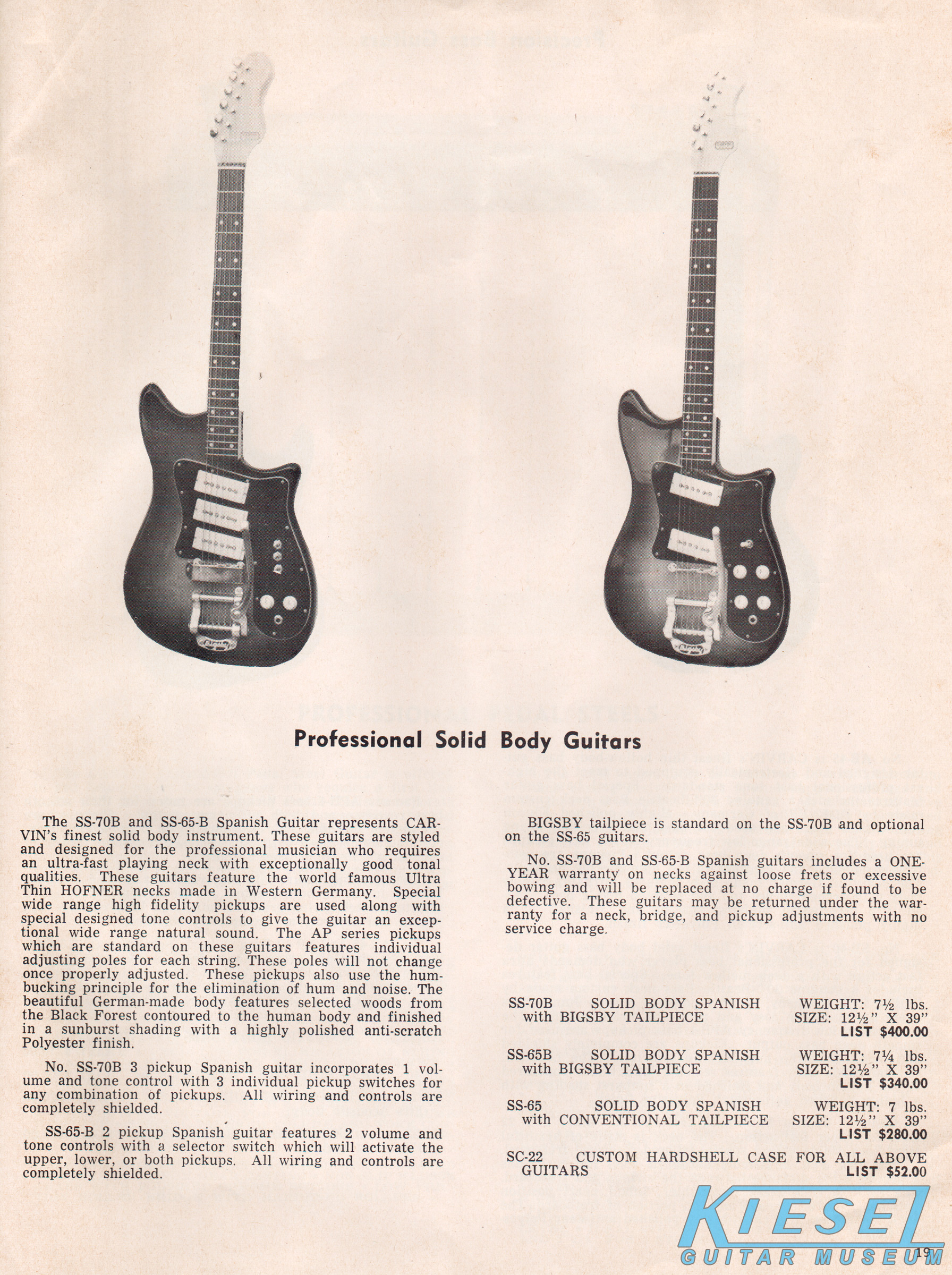 The SS65B guitar was identical to the 1969 #35-SGC, but with a new name. As in 1969, this model was constructed from a maple Hofner neck with rosewood fingerboard and Kluson tuners. The body was made from "select woods from the Black Forest" with a sunburst finish. Electronics consisted of a pair of Carvin AP-6 pickups, with dual volume and tone controls and three-way selector switch. The Bigsby tailpiece was optional (indicated by the "B" following the model number). Price on the SS65 was $140.00, and price on the SS65B was $170.00.