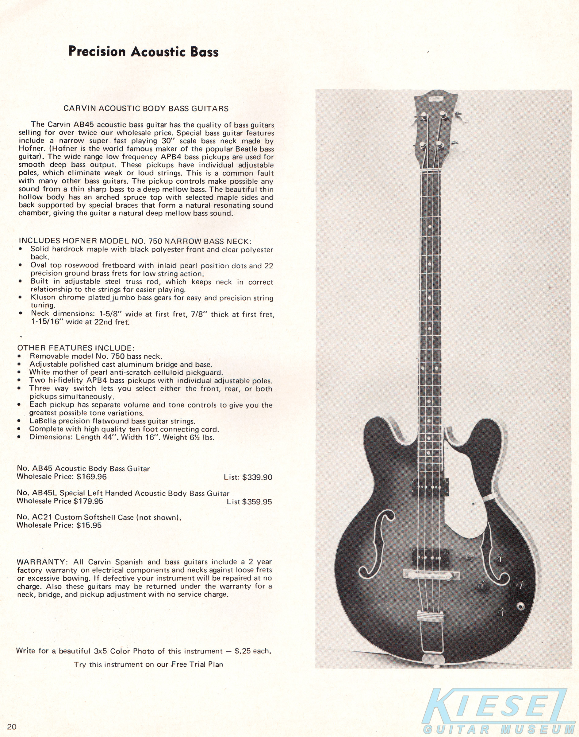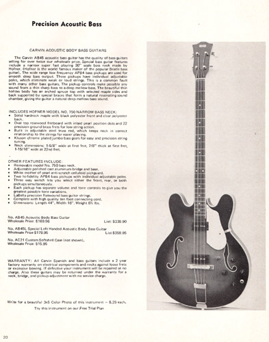 The AB45 bass was a 30" scale acoustic/electric model with inlaid pearl dot rosewood fingerboard, Kluson tuners and a Hofner-made hardrock maple neck with black polyester front and and clear polyester back. It also featured 2 APB4 bass pickups with individual volume and tone controls with 3-way switch, polished cast aluminum bridge, brass frets, and MOP pickguard. It was also available in a left-handed model, the AB45L. Direct price on the AB45 was $169.96, or $179.96 for the lefty. The AC21 soft case was also offered for $15.95.