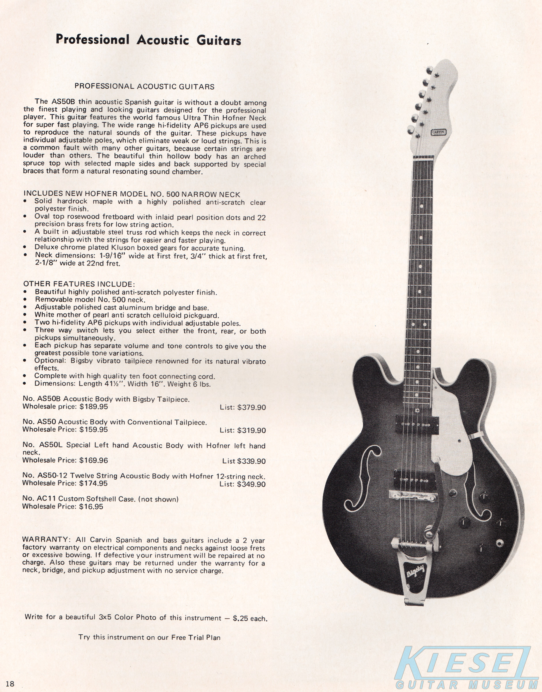 The AS50 was one of Carvin's two flagship guitars for 1972. Although there was a guitar called the AS50 in 1971, the 1972 model was totally different. As were other Carvin archtops of the 60's and 70's, this was actually made by Hofner, with a Hofner neck ("world famous Ultra Thin Hofner Neck") and body, and Carvin electronics and badging, and assembled and set up by Carvin in Southern California. Electronics consisted of a pair of Carvin AP-6 pickups, which were black in '72 (versus white in '71). The AS50B (with Bigsby vibrato) sold for $189.95, and the AS50 with standard tailpiece sold for $159.95. It was also offered as the AS50L (left-handed) for $169.96, and as the AS50-12 (12 string) for $174.95.