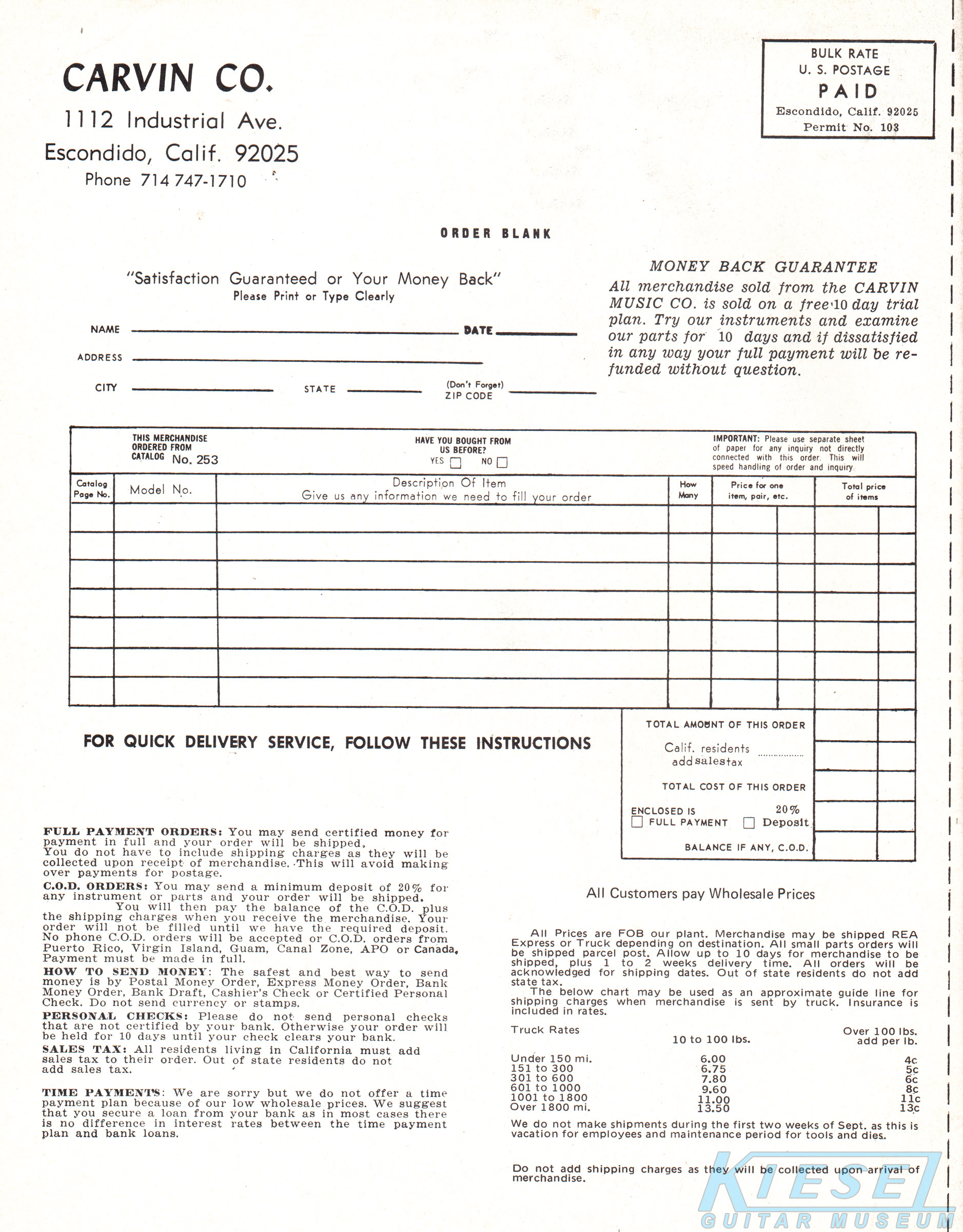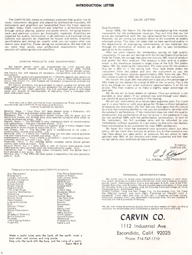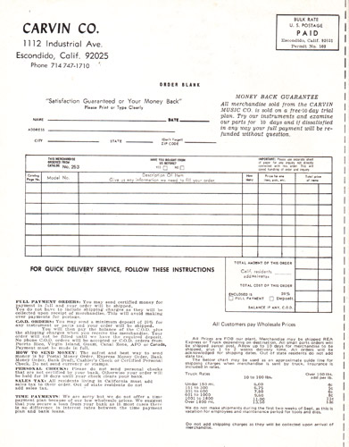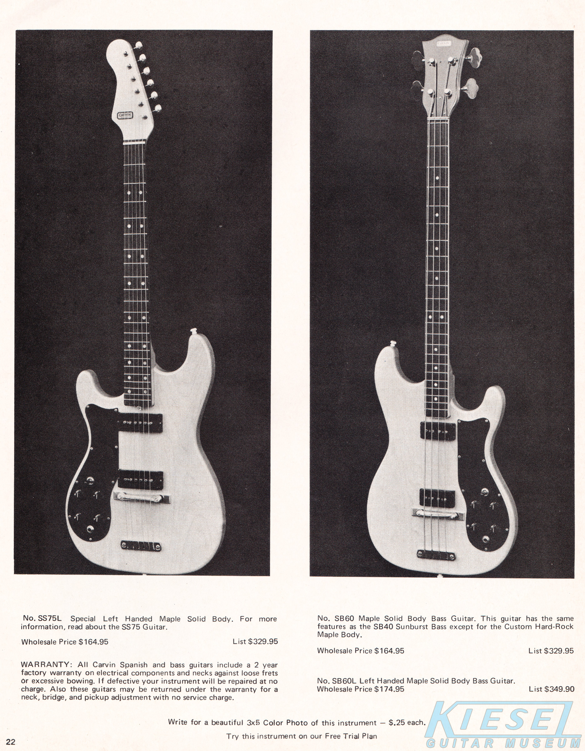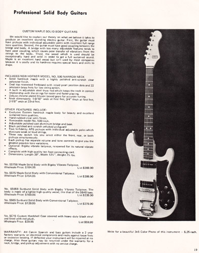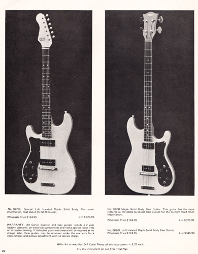 The all-new SS75 replaced the SS65, and was Carvin's premiere solidbody guitar for 1972. It used the same Hofner #500 maple neck as the AS50, in a solidbody design that was very reminiscent of the Fender Strat. The body was also made of maple, and the fingerboard was rosewood. The electronics layout was the same as the AS50, with dual AP-6 pickups with dual volume and tone controls and 3-way selector switch. The SS75B (with Bigsby) sold for $184.95, and the SS75 with conventional tailpiece was $154.95. Also offered, but not pictured in the catalog, was the SS65 and SS65B. These guitars were made from "lighter high quality wood" (possibly alder or poplar) with a sunburst finish. The SS65 sold for $139.95, and the SS65B sold for $169.96. The SS75 was also offered in a left-handed model, the SS75L. This had the same features and construction as the right-handed model, and sold for $164.95.