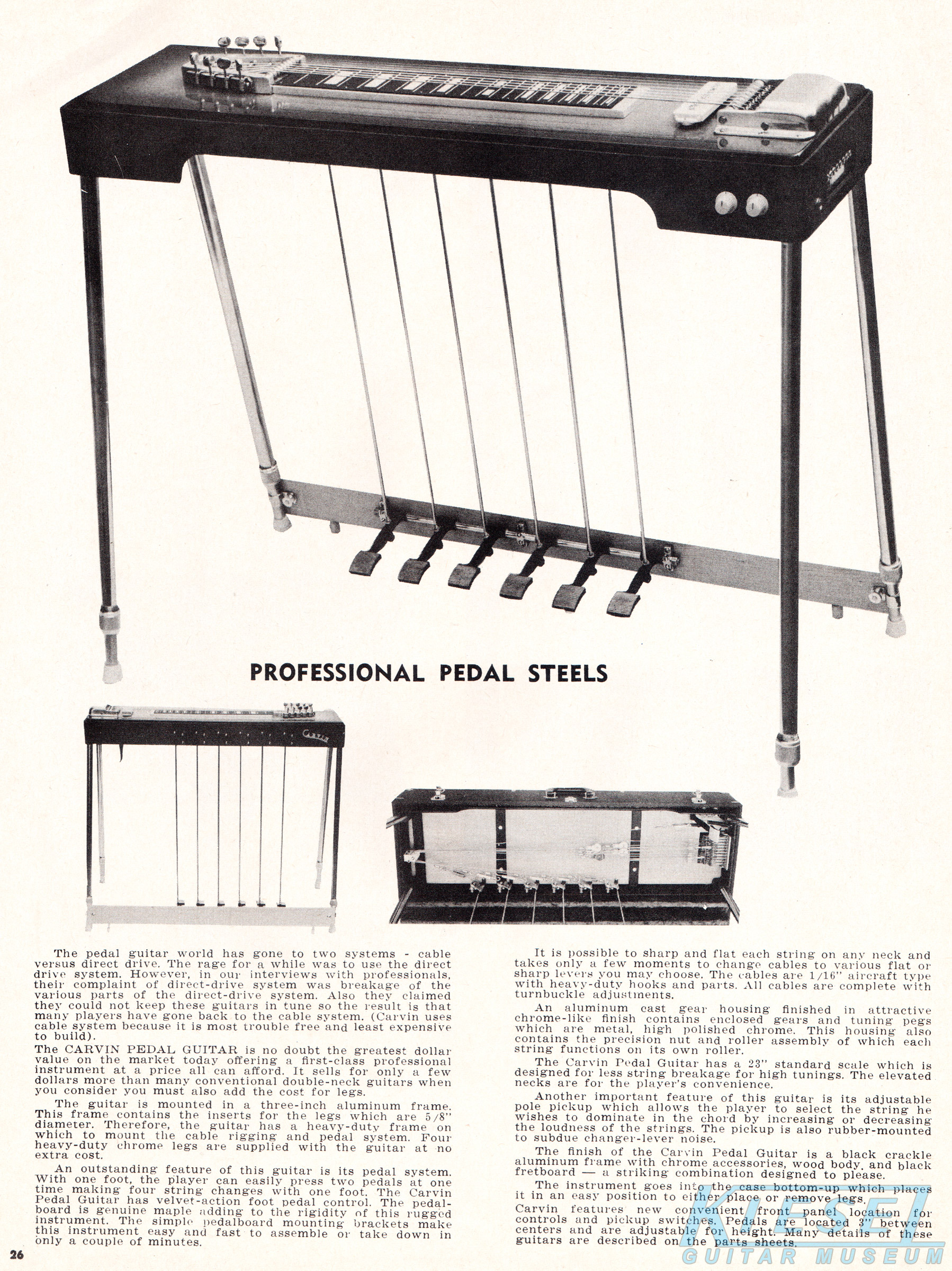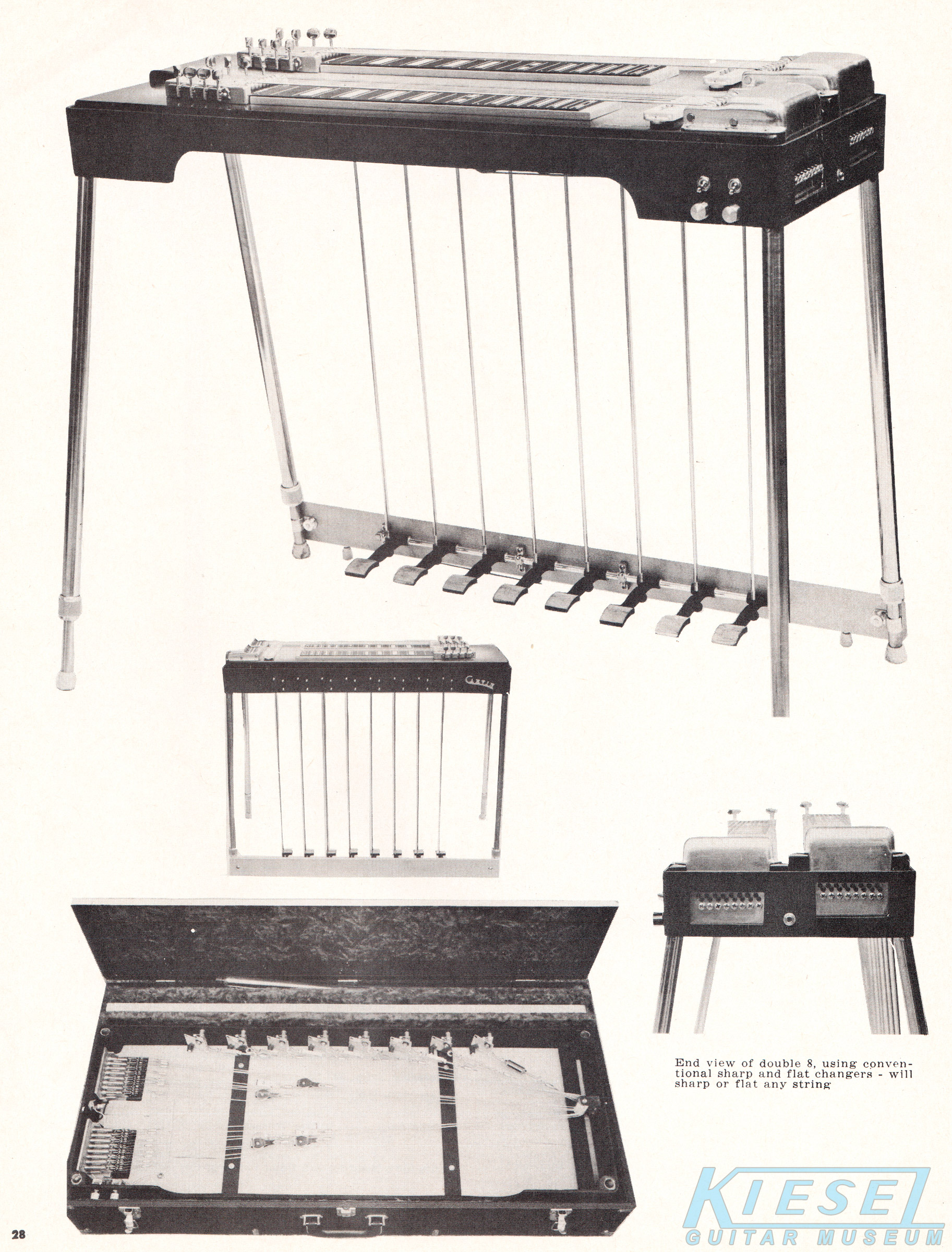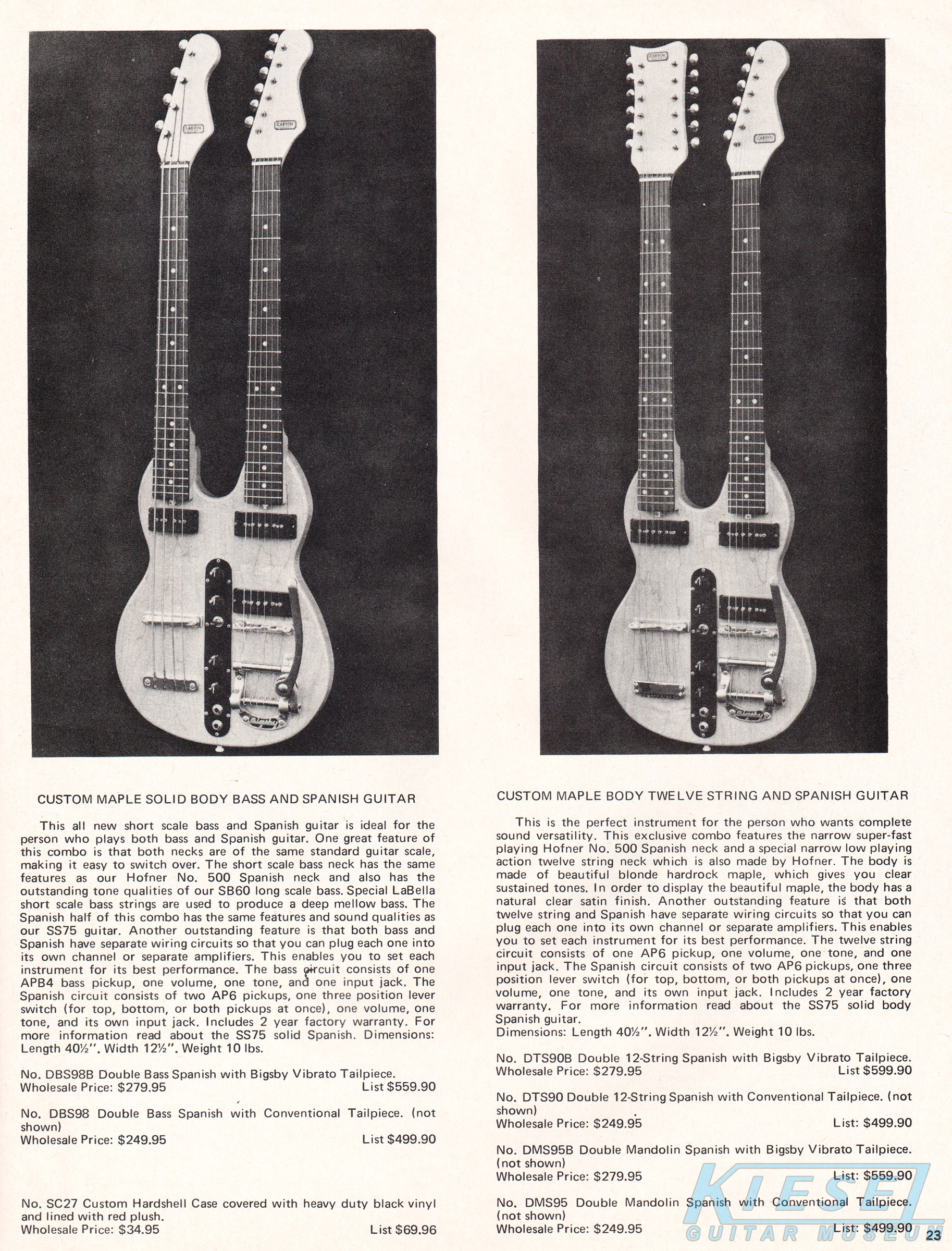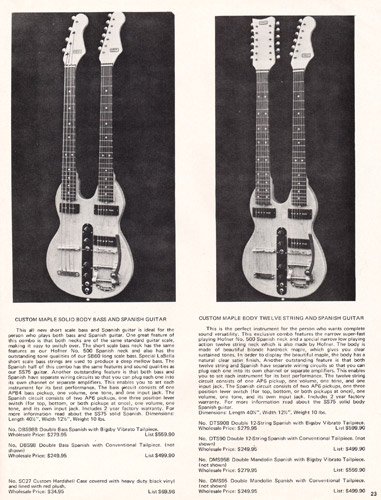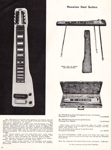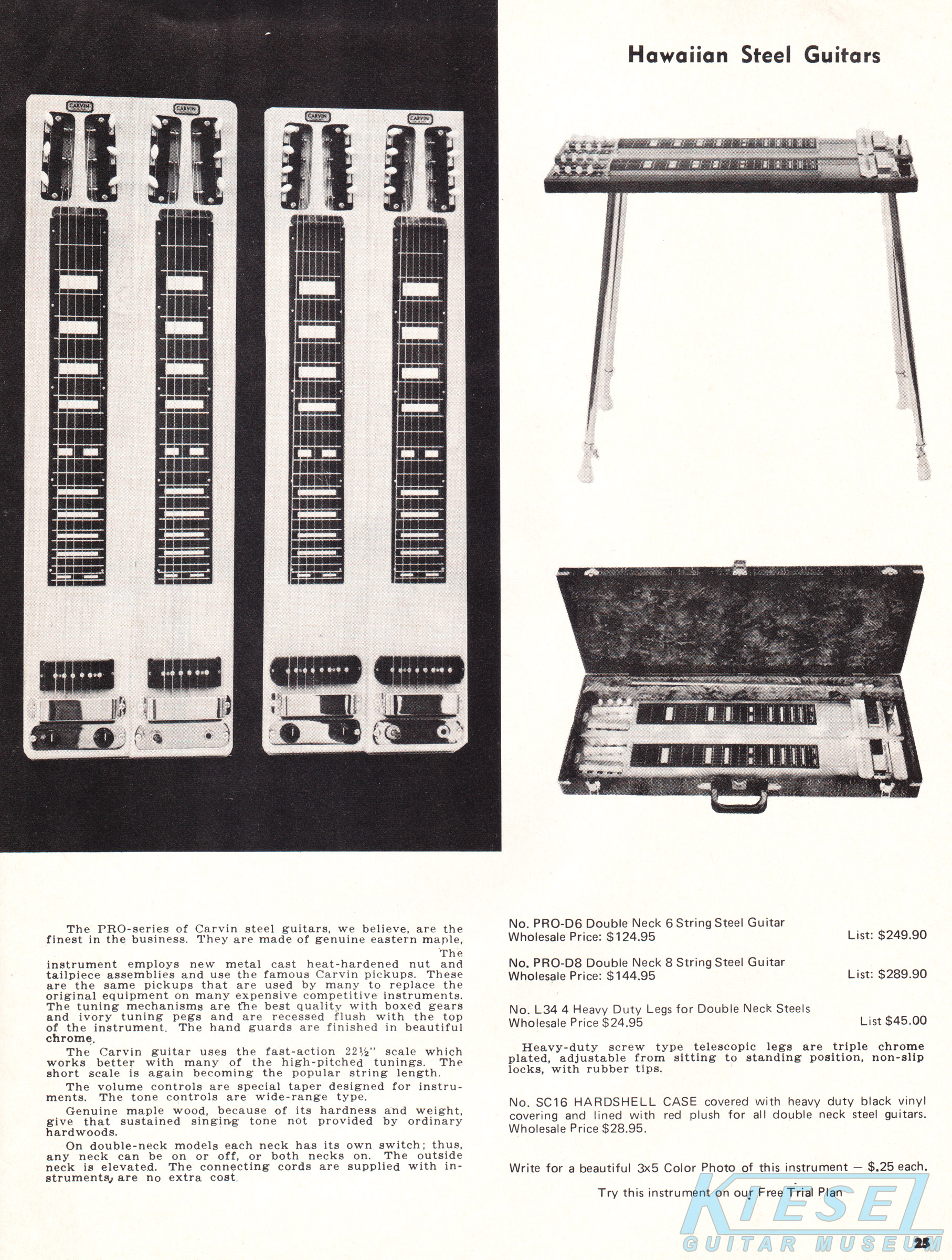 Carvin's PRO-D8 and the PRO-D6 steel guitars were also unchanged. These double-six and double-eight guitars had the same construction and features of the single-neck PRO-S8 and PRO-S6, with an elevated outside neck for easier playability. Both models increased in price, to $124.95 for the PRO-D6, and $144.95 for the PRO-S8.