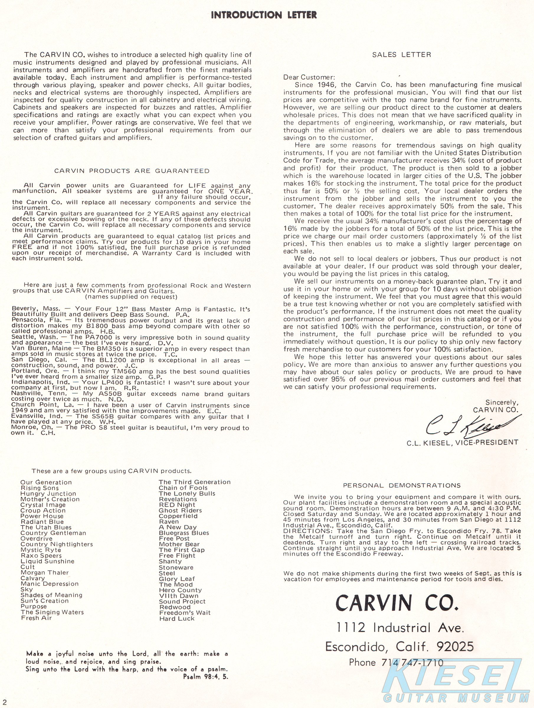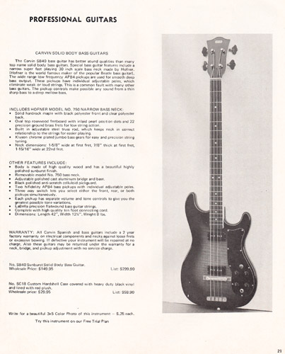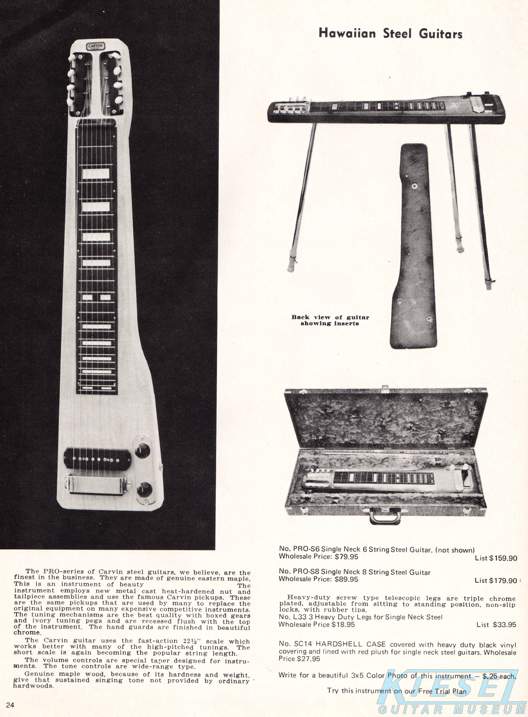 The PRO-S8 steel guitar was unchanged for 1972, however, a 6-string model, the PRO-S6 was added to the lineup. Both were made from Eastern maple with chrome hardware and ivory tuning pegs, and had optional chrome legs. The PRO-S6 wasn't pictured in the catalog (in fact, it was never pictured in any Carvin catalog), and the PRO-S8 used the same picture as in 1971. The price on the PRO-S8 increased slightly, to $89.95, and the PRO-S6 was priced at $79.95.