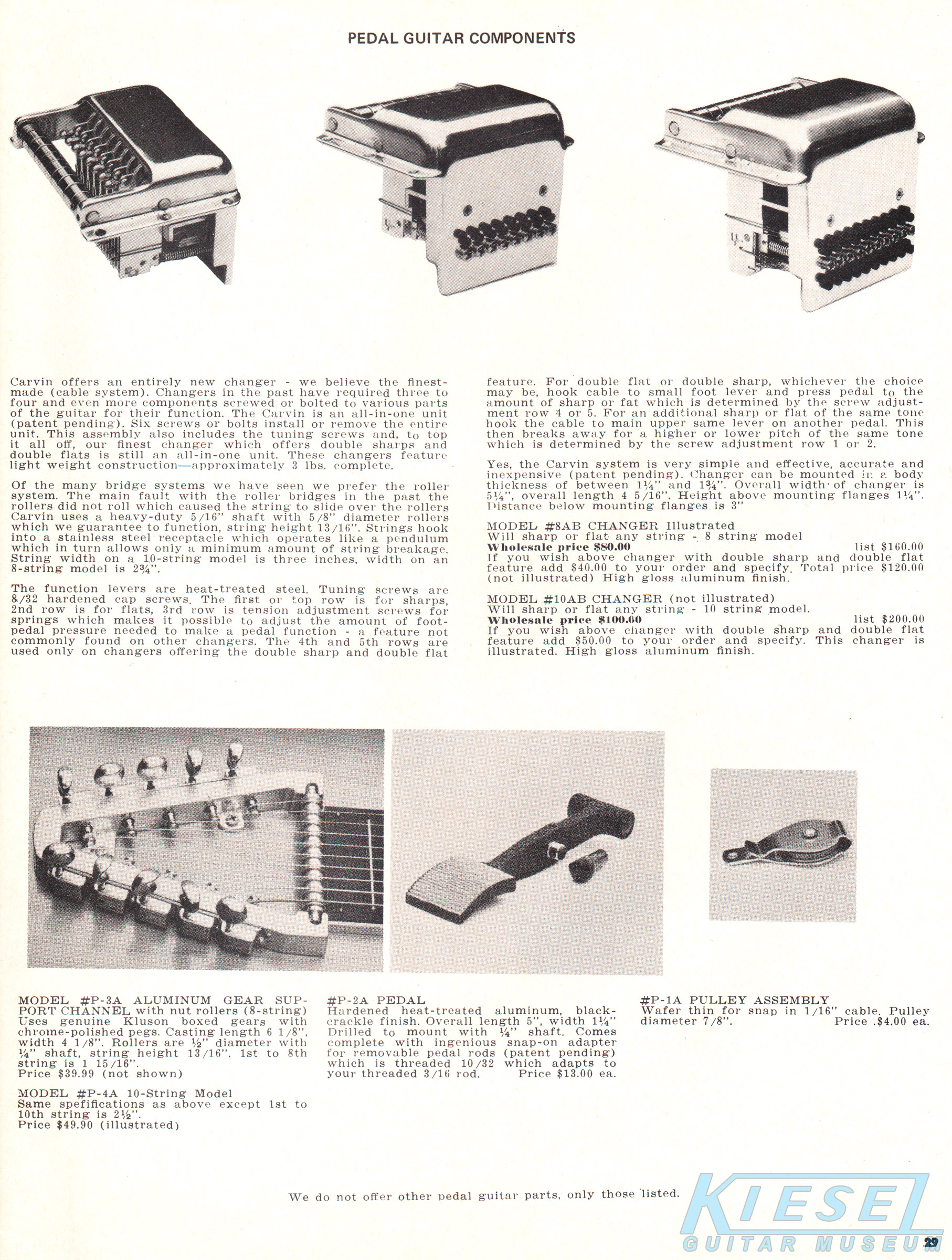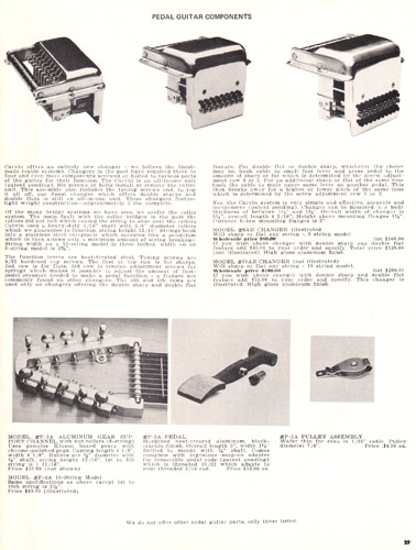 Carvin also offered a wide assortment of steel guitars parts. These included replacement pulleys (for the pedal cables), string changers, tuner assemblies, pedals, and AP-Series pickups.