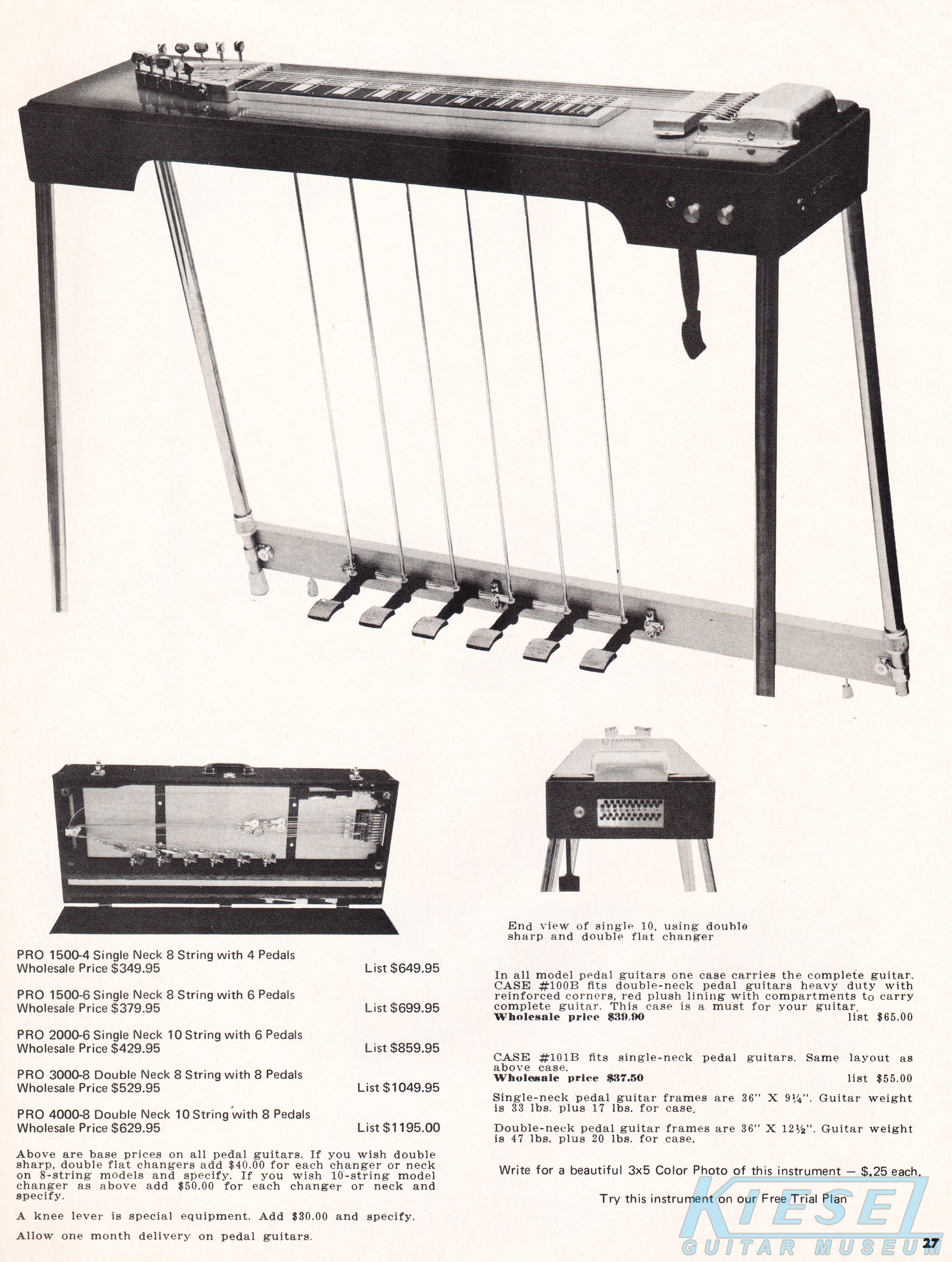 Carvin offered the PRO 1500-4 singleneck 8-string with 4 pedals for $349.95. The PRO 1500-6 8-string with 6 pedals was $379.95. The PRO 2000-6 singleneck 10-string with 6 pedals was $429.95. The PRO 3000-8 doubleneck 8-string with 8 pedals was $529.95, and the PRO 4000-8 doubleneck 10-string with 8 pedals was $629.95.