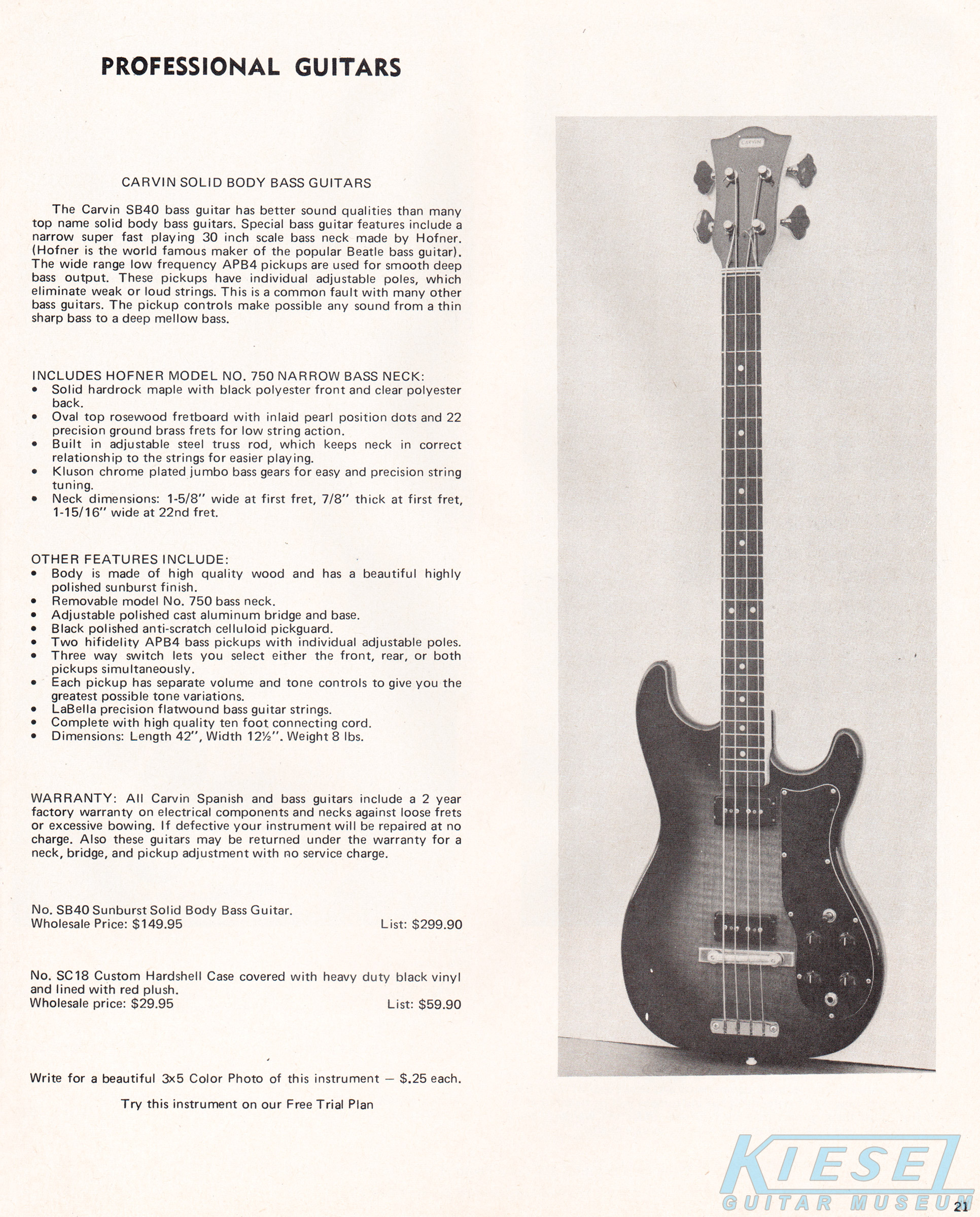 The SB40 solidbody also featured a Hofner neck that had all the same appointments of the SB60. This bass was made of "high quality wood", and was only available in a sunburst finish. The pickups and electronics were the same as the AB45. This model was only available in a right-handed version, and sold for $149.95. The SC18 hardshell case was available for $29.95.
