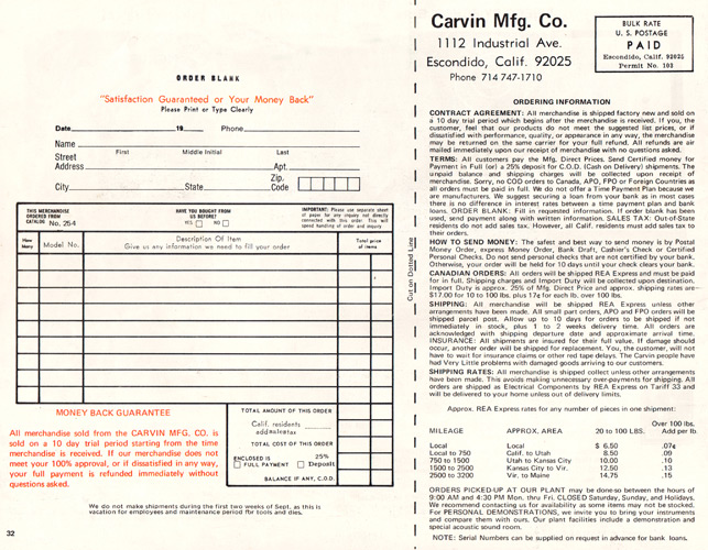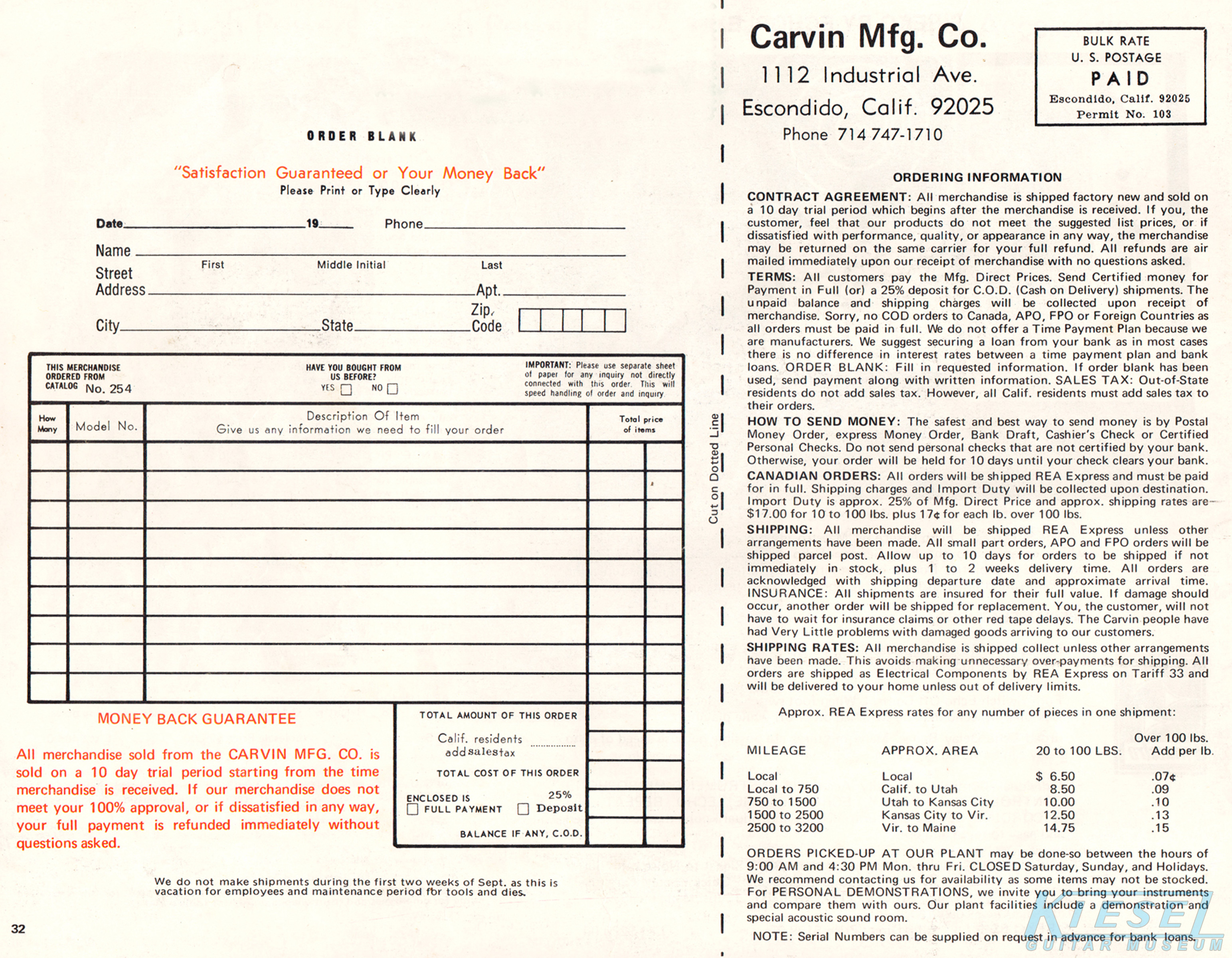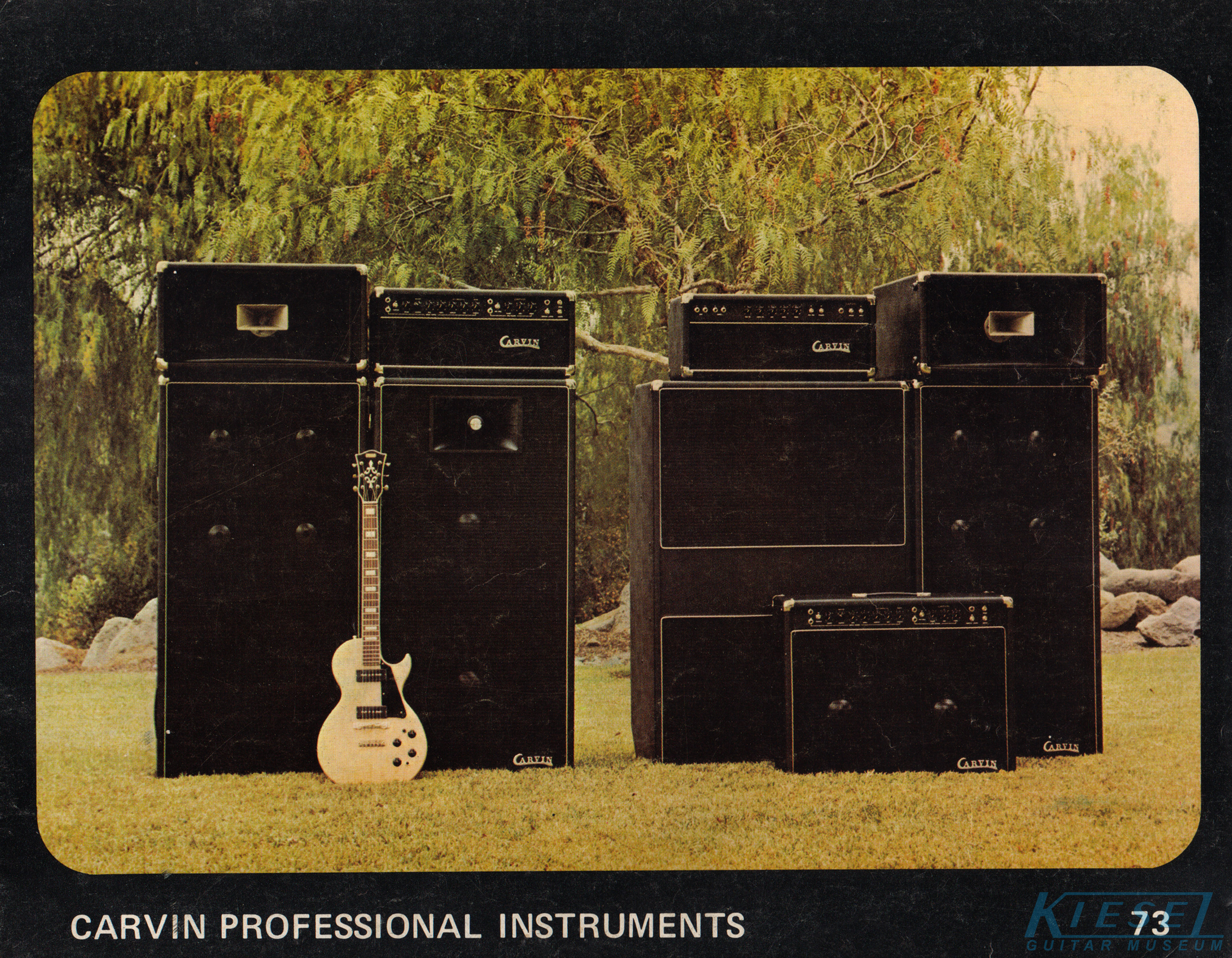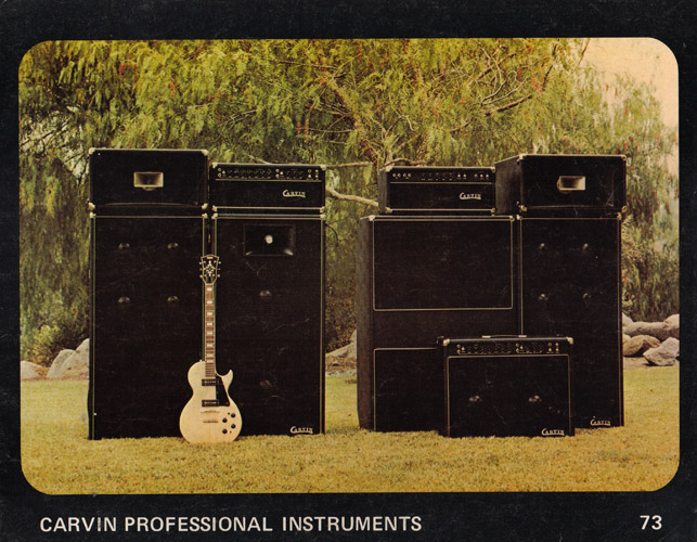The center spread featured all of Carvin's guitar and bass models for 1973. Notice the wide variation of styles, most of which were similar in one way or another to instruments made by other manufacturers. On the guitar side, the AS50B, which was similar to a Gibson ES-335. Next, the CM95, which had obvious similarities to the Les Paul, and the SS75B & SS65B, which were similar to the Fender Strat, all the way down to the headstock.