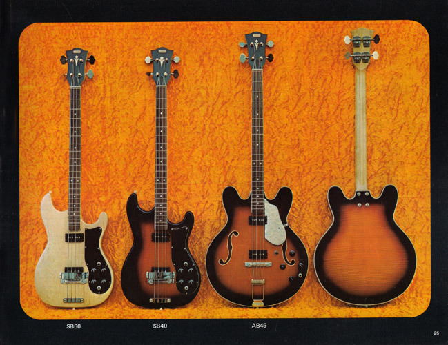 The SB40 had similar changes from the 1972 model as the SB60. This model sported the same electronics and neck of the SB60, but was made from unspecified wood, and was finished in sunburst. The SB40 sold for $149.95, and wasn't available in a left model.