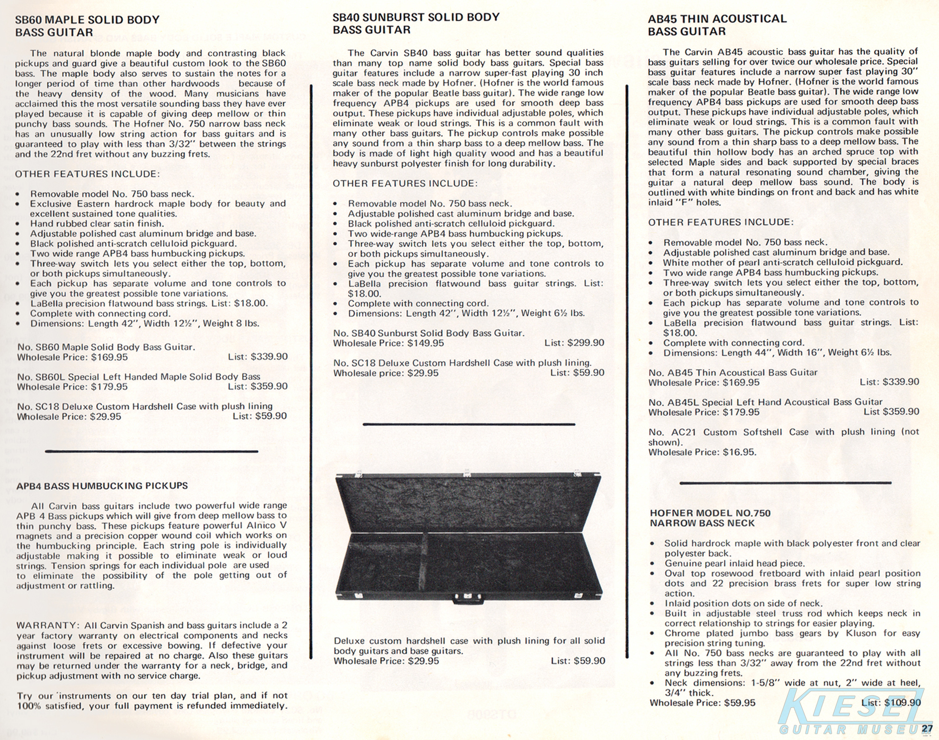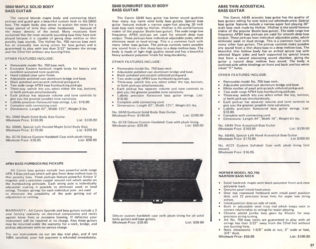 The AB45 semi-hollow bass was unchanged from 1972, with the exception of the headstock inlay. This bass also featured the same Hofner neck and electronics of its solidbody counterparts, with aluminum bridge and tailpiece, MOP pickguard, and sunburst finish with white binding. The AB45 sold for $169.95, or $179.95 for a left-handed model (AB45L). The AC21 softcase was $16.95.