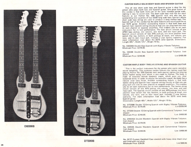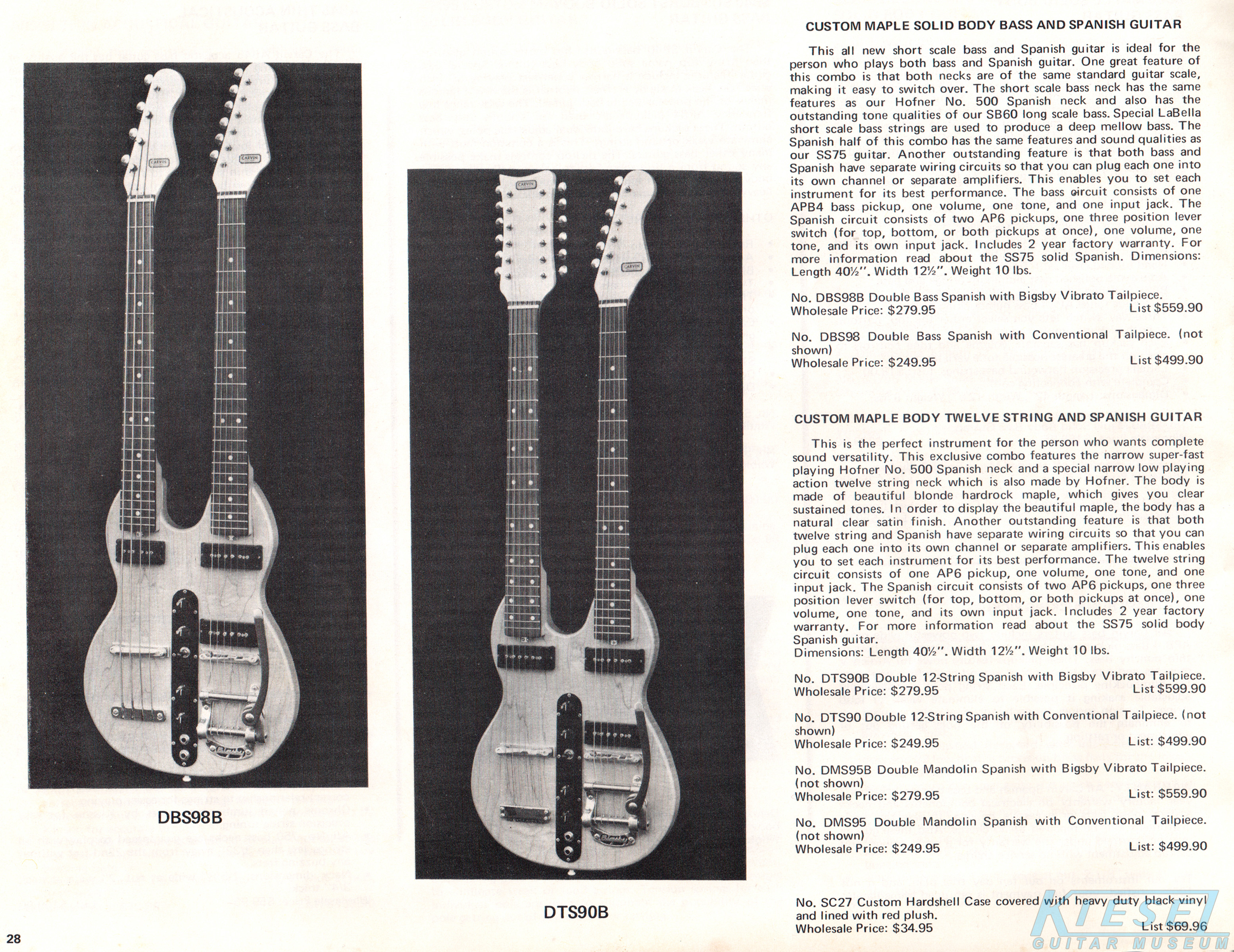 The DTS90 doubleneck, which was a combination 12-string and "Spanish" guitar, and had been in production under a variety of model names and shapes since the early 60's. The features of the DTS90 were basically the same as the SS75 guitar - that is, Hofner bolt-on necks with rosewood fingerboards, AP6 pickups with 3-way selector switch. Additionally, the necks were wired independently of each other, so each neck could be plugged into a different amp. The 6-string neck was available with or without the Bigsby vibrola. It was not included in the color spread in the catalog. The DTS90 sold for $249.95, and the DNS98B (with the Bigsby) sold for $279.95. A left-handed model was not available. The SC27 hardshell case was $34.95. Not shown was the DMS95 and DMS95B, which were 6-string guitar/mandolin doublenecks. The DMS95 sold for $249.95, and the DMS95B (with Bigsby) sold for $279.95.