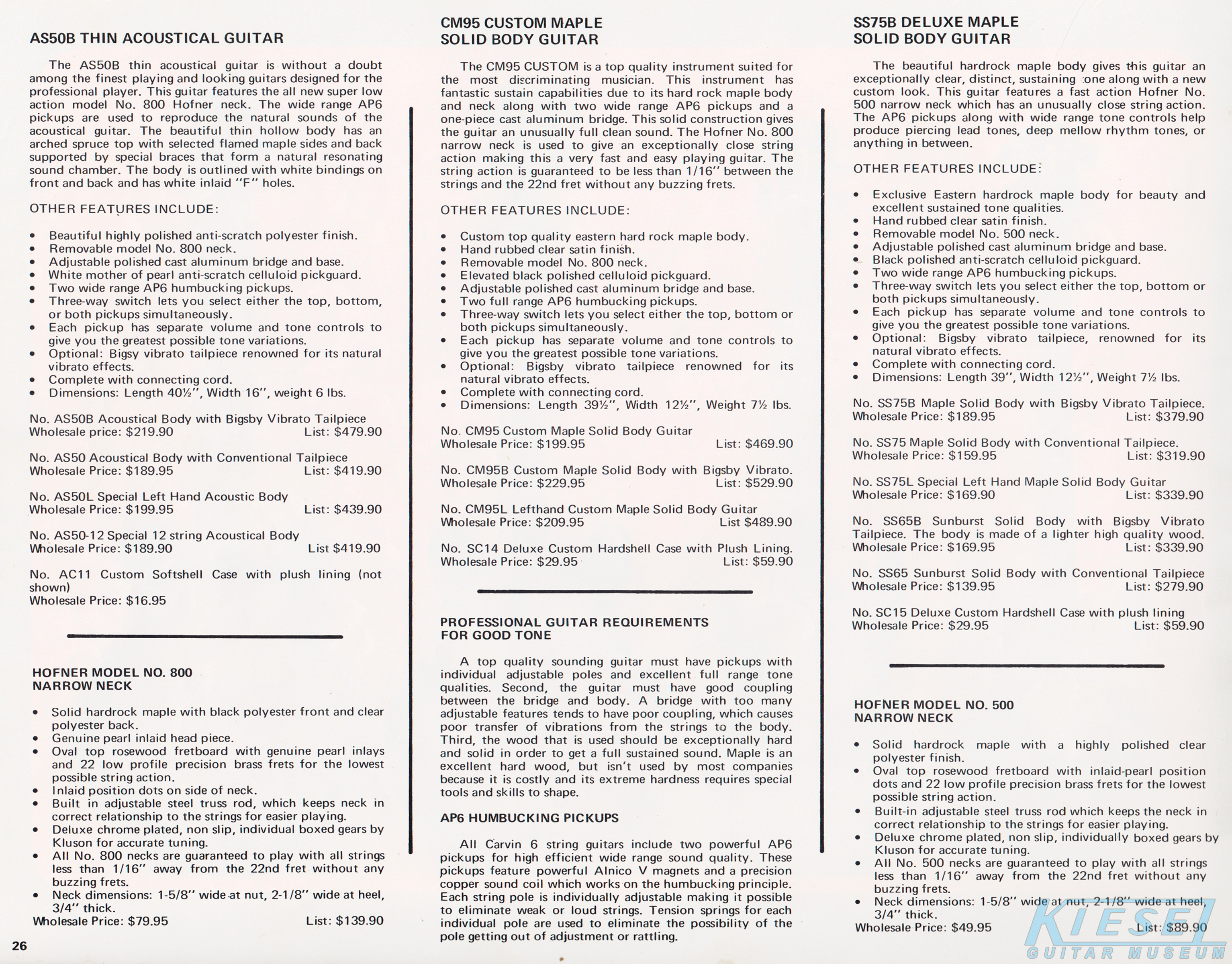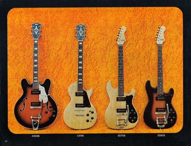 The SS75 and SS65 were essentially the same instrument, unchanged from 1972, with the only difference being the construction and finish. The SS75 was made of solid maple, with a clear satin natural finish and Hofner model #500 neck. The SS65 was made of "lighter high quality wood" with sunburst finish. Both models had otherwise the same amenities as the CM95. The SS75 sold for $159.95, or $189.95 with Bigsby tailpiece (SS75B). A left-handed model was available for $169.90 ((SS75B). The SS65 sold for $139.95, or $169.95 with Bigsby tailpiece (SS65B). A left-handed model was not offered. The SC15 hardshell case was $29.95.