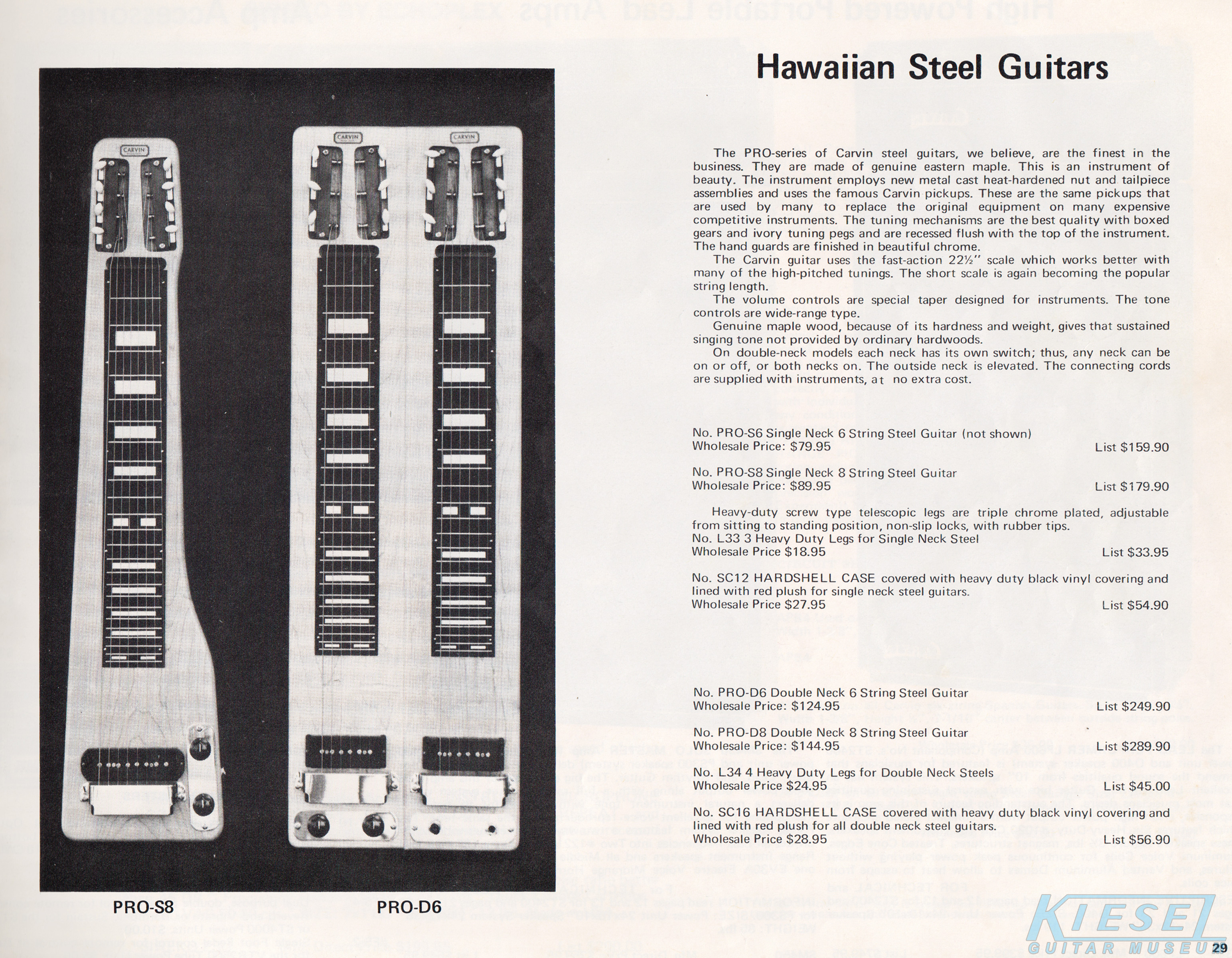 In 1973, Carvin still offered Hawaiian steel guitars, but the pedal steel guitars that had been a mainstay during the 60s and early 70s were gone. Within a few years, all steel guitars would be gone from the lineup forever, but at the time, there were 6-string, 8-string and doubleneck models available, all short scale (22 1/2") instruments. These were made of solid hardrock maple, with Carvin pickups (which were used on many other brands of steel guitars), ivory tuning pegs, chrome hand guard, and volume and tone controls.