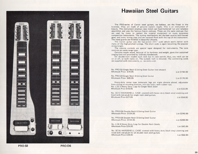 The PRO-S8 8-string sold for $89.95. The PRO-D6 doubleneck 6-string sold for $124.95. Also available was the PRO-S6 6-string model for $79.95, and the PRO-D8 doubleneck 8-string, which was $144.95. A set of telescoping chrome-plated screw-in legs was available for $18.95, and the SC12 hardshell case sold for $27.95.