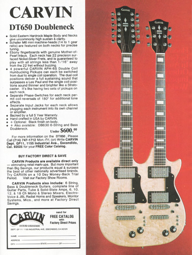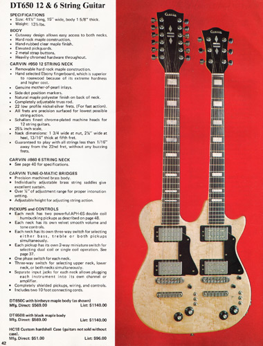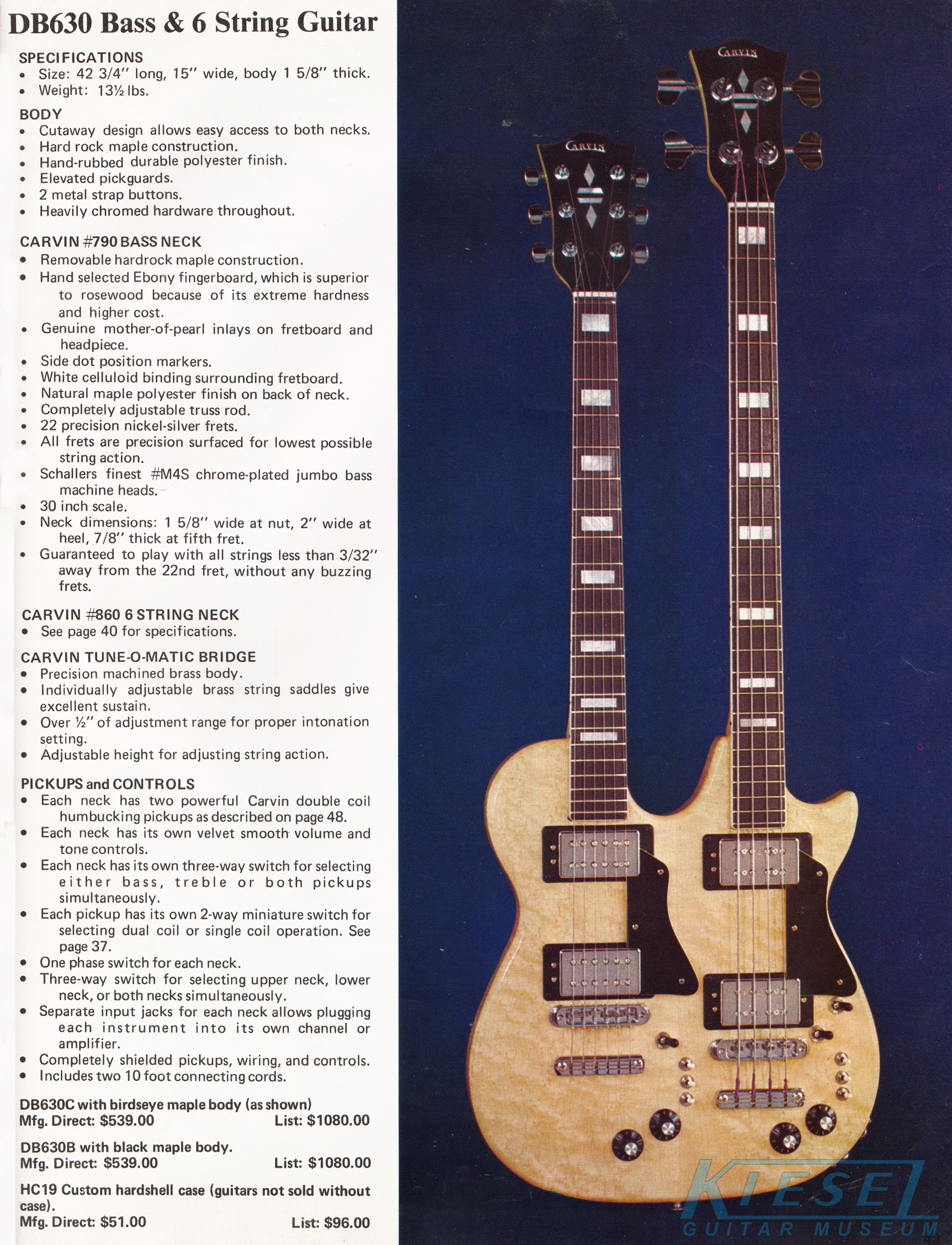 The DT650 doubleneck 12/6 string was completely redesigned for 1977. It had a larger body, and more conventional controls, which consisted of a master volume and master tone control with phase switching and coil splitters for each neck. The ebony necks had white binding and mother-of-pearl block inlays. It was offered in black (DT650B) for $569.00, or in Birdseye maple (DT650C) for $569.00. Like the DT650, the DB630 bass/6-string doubleneck was dramatically different than the '76 model. The bass neck was moved to the bottom, so that the instrument would be better balanced, and the body itself was wider. Each neck had a master volume and master tone control with phase switching and coil splitters. The bolt-on maple necks had ebony fretboards with MOP block inlays and white binding. It was offered in a clear finish on birdseye maple (DB630C) or black on standard maple (DB630B) - either model was $539.00, plus $51.00 for the HC19 hardshell case.