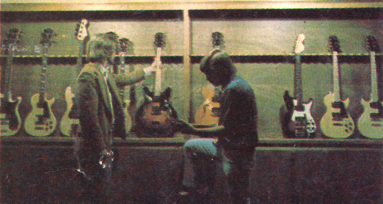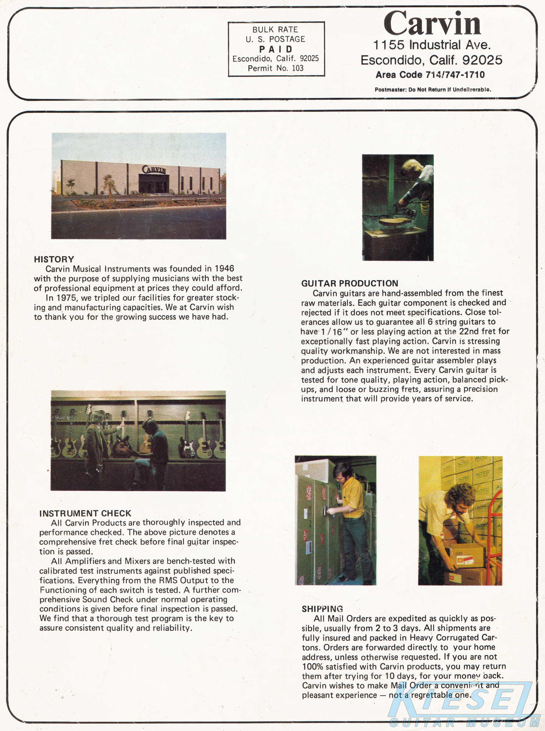 The photo below appeared on the back cover of the 1977 catalog. It shows Jon Kiesel (left) and current Kiesel Guitars president Mark Kiesel (right) with