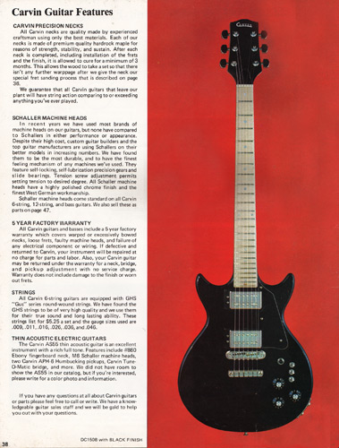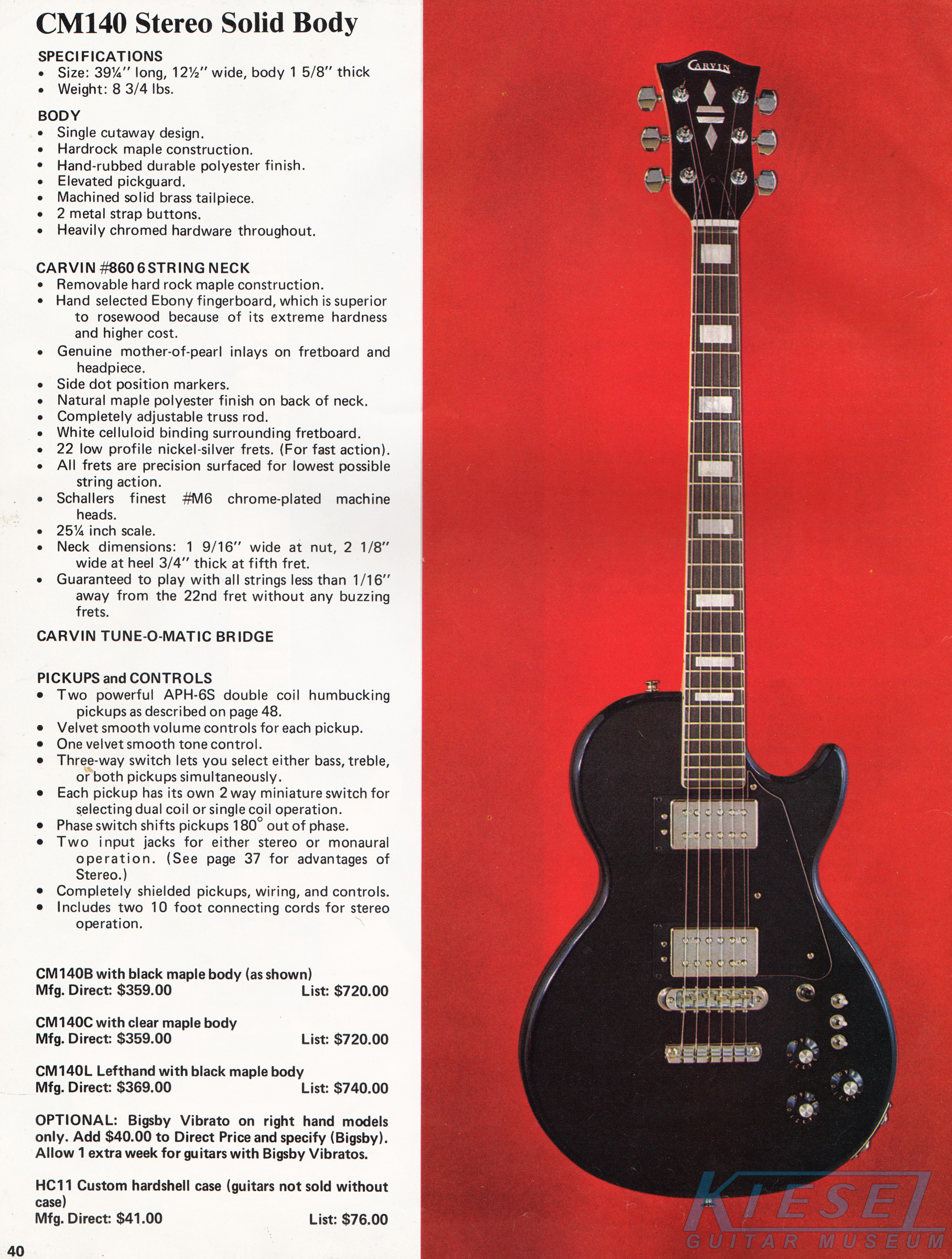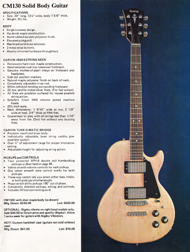 The CM130 and CM140 were based on the CM96 from 1976. However, these models had the same changes as the DC150 - pickup covers, a 3-knob layout, and new bridge/tailpiece. The CM130 used the Hofner #820 neck with rosewood fingerboard, and had more simplified electronics consisting of a phase switch in addition to the pickup volume, tone and selector controls. The CM140 used the Hofner #860 neck with ebony fingerboard and mother-of-pearl headstock and block inlays. It was stereo wired (schematic), with coil splitters in addition to the pickup controls. The necks on both models were made by Hofner, and the headstock inlays were the same as the ones used by Hofner. The CM130 has a decal resembling a sword, with a decal Carvin logo with MOP dot inlays; the CM140 has an MOP inlaid Carvin logo with the double-diamond logo that would be used until the late 1980's (and is still used by Hofner to this day). Essentially, the higher quality neck with an ebony fingerboard used in the MOP inlays, while the rosewood fingerboarded-neck used decals. The CM130 sold for $249.00, and the HC11 hardshell case was an additional $41.00. It could be ordered with a Bigsby vibrato for an additional $40.00. There was no left-handed model offered, and it was only available in clear. The CM140 was $359.00 in black or clear finishes, and was offered in a left-handed model for #369.00. A Bigsby could also be ordered for it.