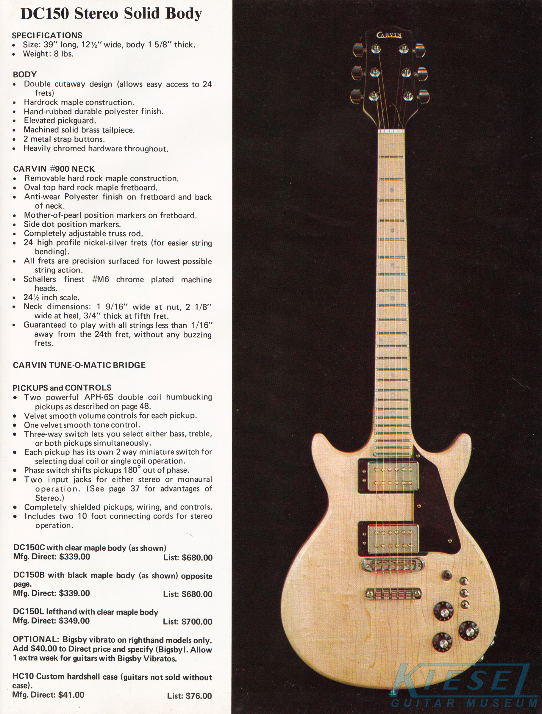 The DC150 moved into 1977 relatively unchanged. It did sport the new chrome pickup covers on APH-6S pickups, and the new bridge/tailpiece, but it had the same body shape and neck features. The electronics changed slightly, with a 3-knob layout (versus the 4-knob layout of 1976) that included volume controls for each pickup and master tone and updated knobs. Coil splitters and phase switch were standard, as was a 3-way pickup selector switch and stereo wiring. Lastly, the strap button was moved from the tip of the upper horn to the neck plate. The DC150 was offered in black for the first time with a maple fingerboard as the DC150B or in clear with a maple fingerboard (DC150C). Either model was $339.00. A left-handed model was offered (DC150L) which had a clear finish and maple fingerboard, and sold for $349.00. A Bigsby vibrato could be added for $40.00. The HC10 hardshell case was $41.00.