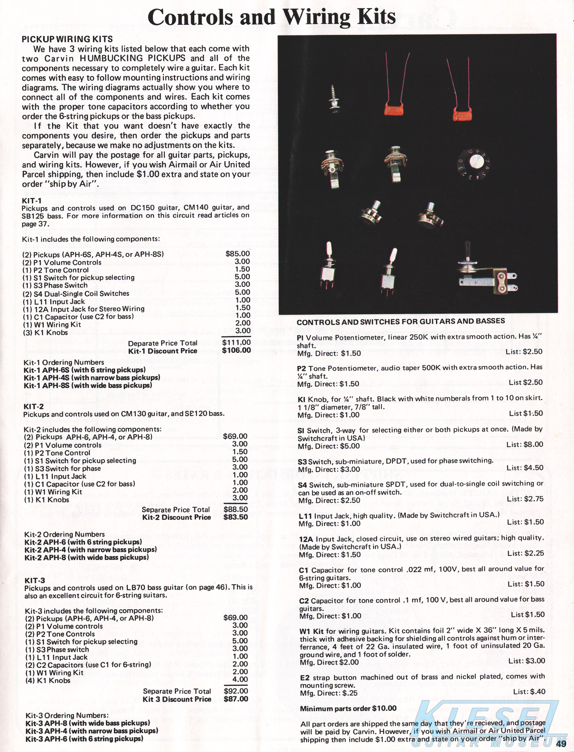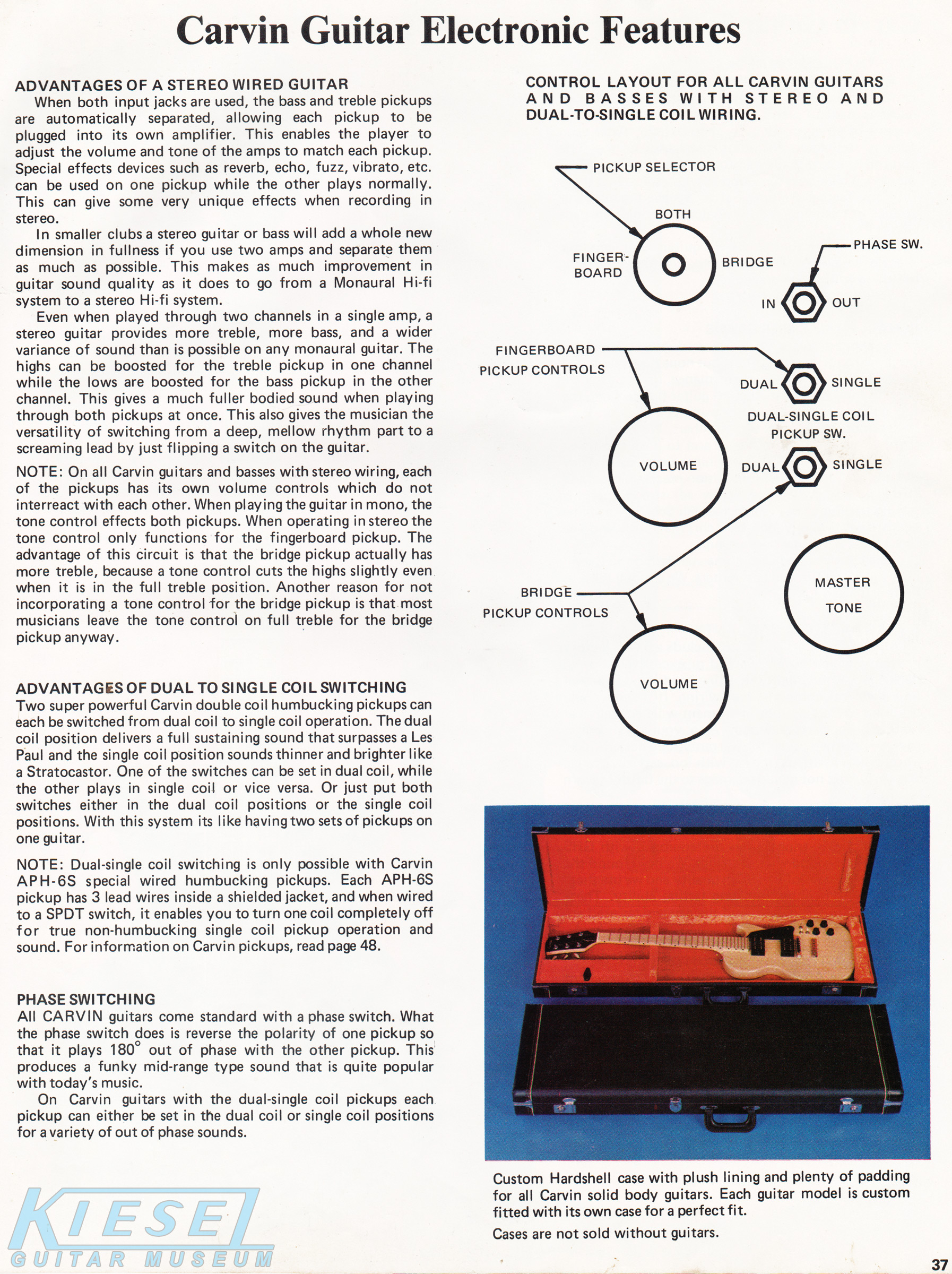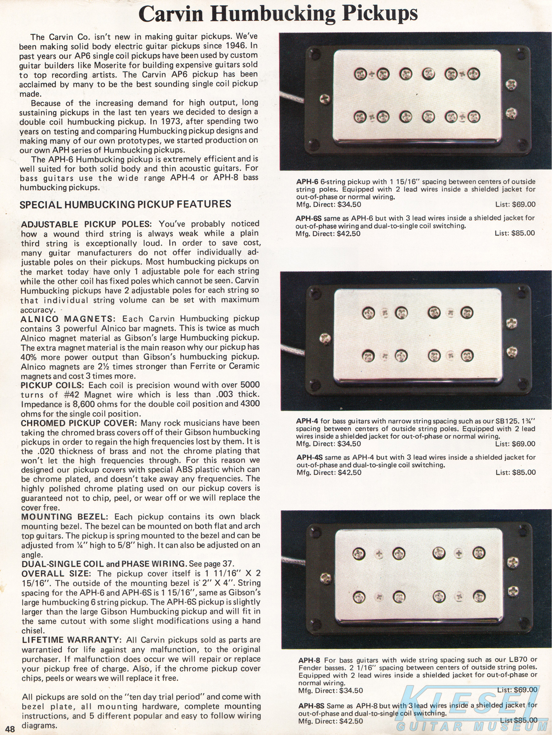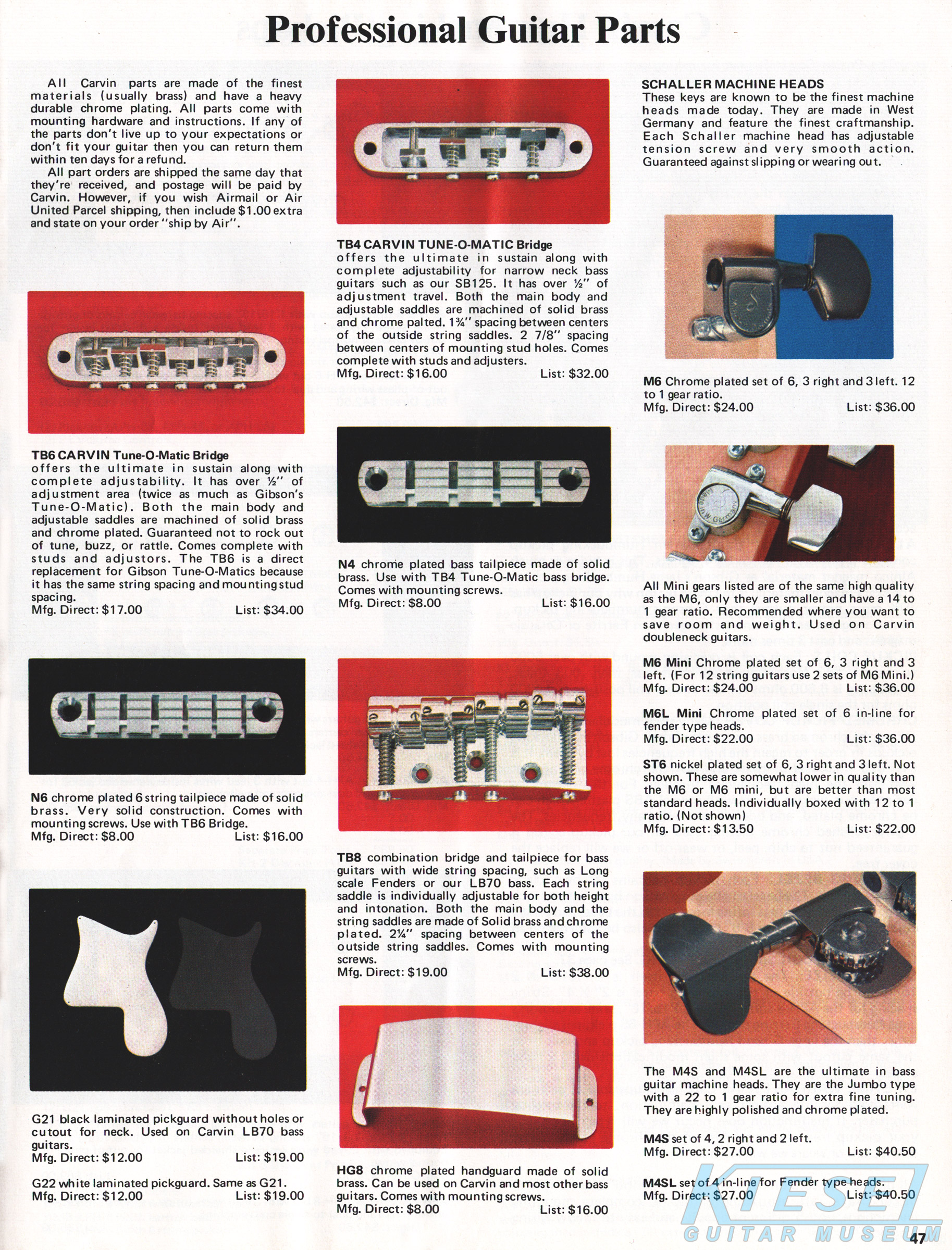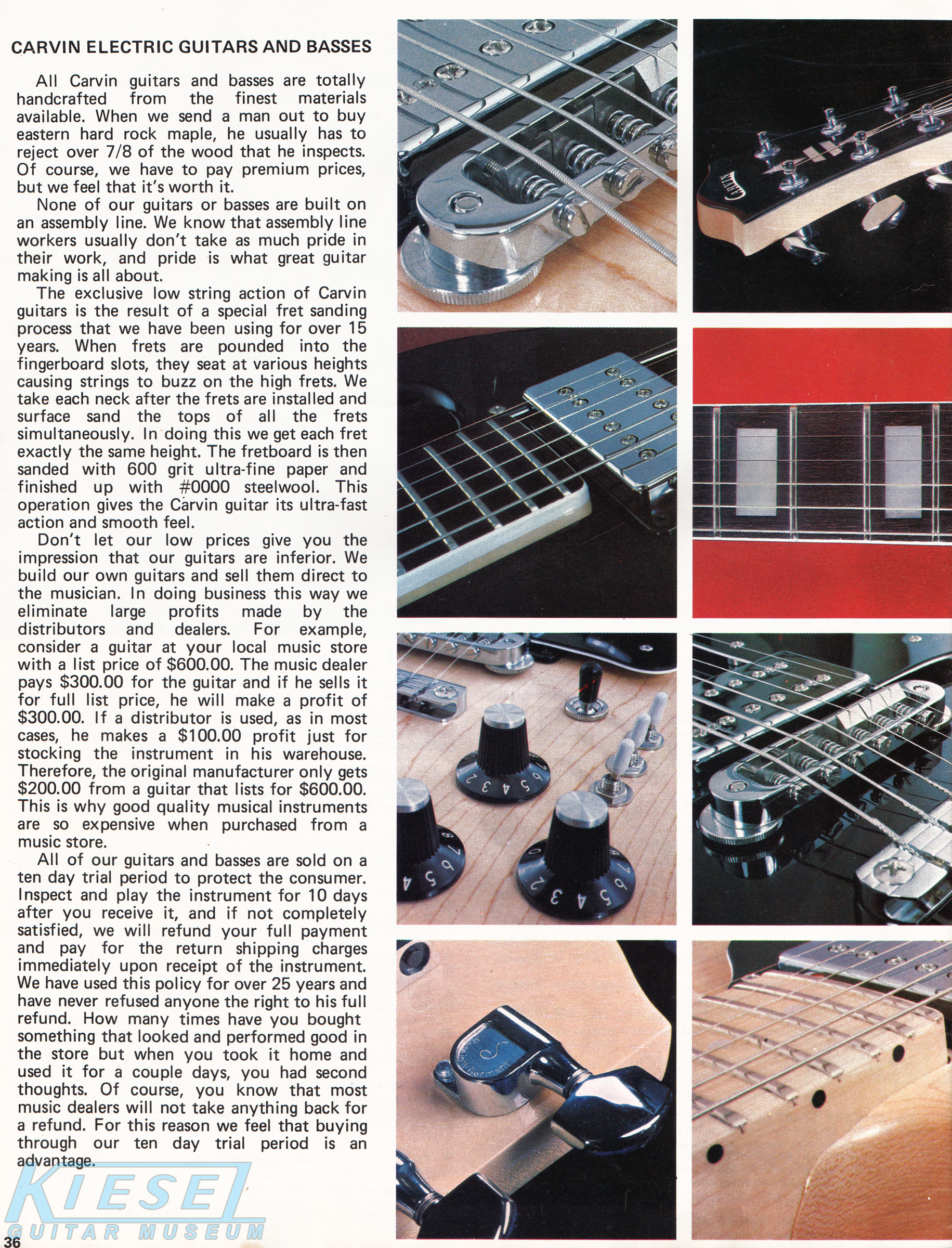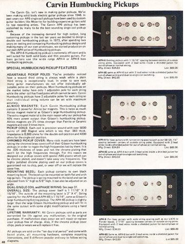 The most obvious change on all Carvin guitars and basses for 1977 was the addition of chrome pickup covers on all AP-series pickups. This one feature makes it easy to identify a 1977 model - the '76 models had black pickups (without covers), and in 1978, the new 22-pole M22 pickups would be introduced. Therefore, any Carvin guitar or bass with chrome pickup covers is a 1977 model. In addition to the pickups covers, a new tune-o-matic bridge and tailpiece were put into use in 1977. Although not specified in the catalog, these were most likely made by Schaller.