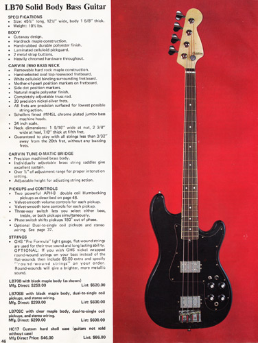 The LB70 bass was one of the longest-running model designations used by Carvin. The LB70 model name debuted in 1976, disappeared from 1978 - 1987, was reintroduced in 1988, and finally retired for good in 2021. Like the initial 1976 model, this bass was similar to the Fender Precision, especially the headstock. The neck was the same scale length as a Fender Precision bass (34") and the body shape is also very similar. It was equipped with two APH8 pickups with dual volume and tone controls, phase switching and 3-way pickup selector. Coil splitters and stereo wiring were optional. Other features included an oval rosewood fingerboard with binding and Schaller #M4SL tuners. It was offered in black (LB70B; the model shown in the catalog) for $259.00, or in black with coil splitters and stereo wiring (LB70SB) or clear with coil splitters and stereo wiring (LB70SC) for $299.00. To accomodate the additional switches and second jack, the stereo models only had 3 controls; two volume and one tone. The HC17 hardshell case was $46.00.