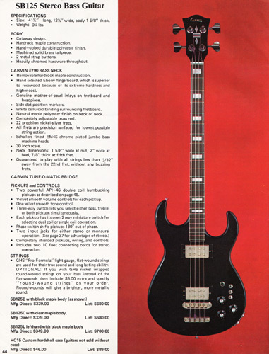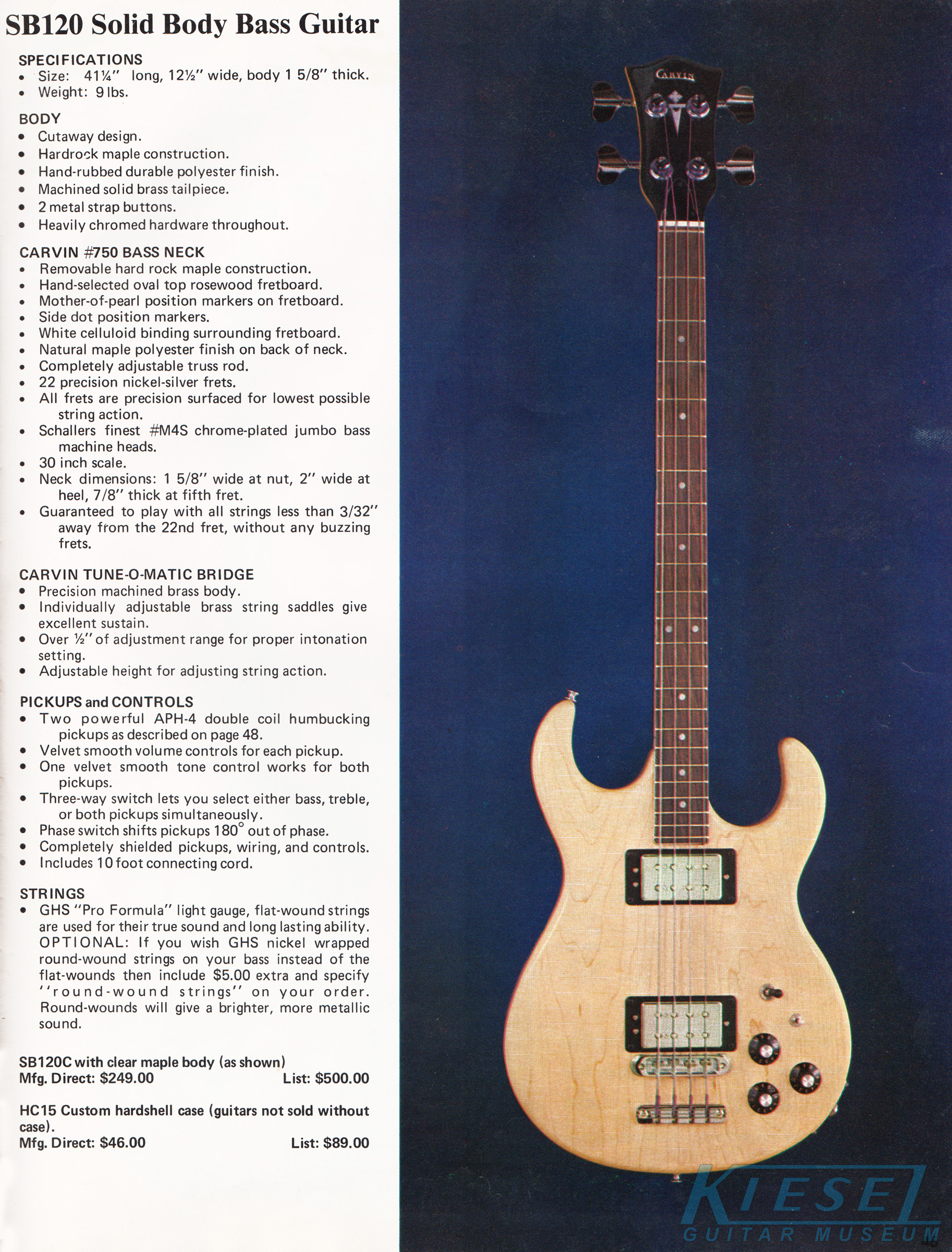 The SB120 bass featured a bound short-scale 30" rosewood fretboard, dot markers and dual APH4 pickups with dual volume controls, master tone control, pickup selector switch and phase switch. Tuners were Schaller #M4S jumbos, and the bridge was a Carvin tune-o-matic (probably also made by Schaller). It was only offered in a clear finish, and sold for $249.00, plus $46.00 for the HC15 hardshell case.