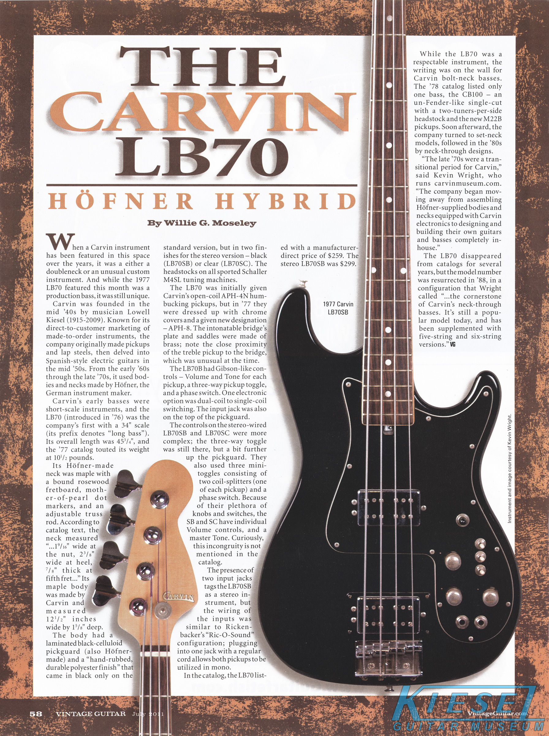The LB70SB below is owned by the Curator, and appeared in Vintage Guitar in July 2011. Click the picture for a larger version.
