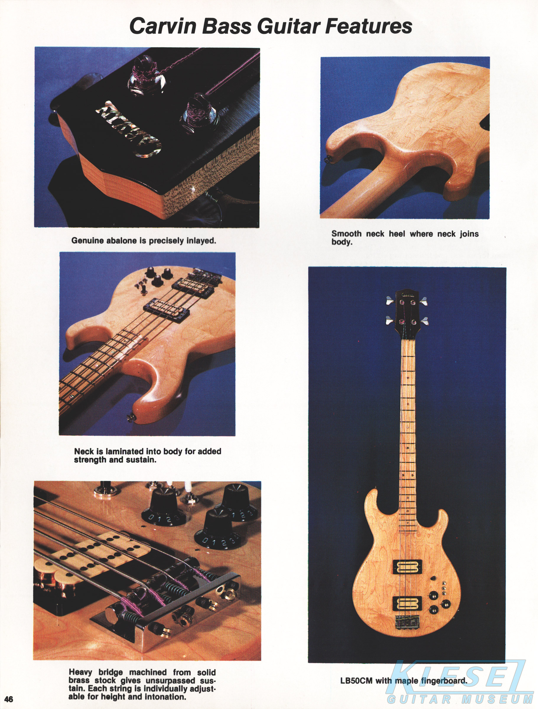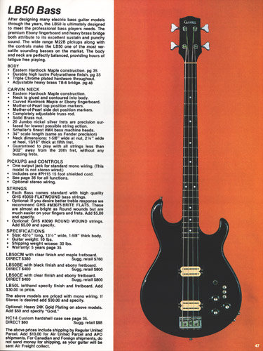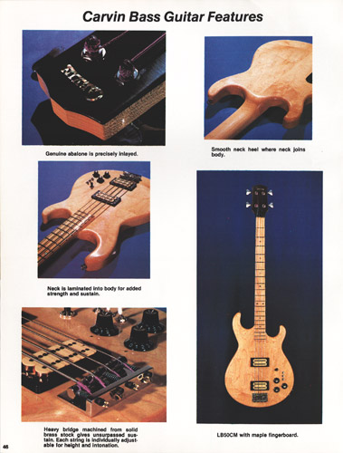 Like 1979, Carvin's only bass was the LB50, and it's variants. It was available as the LB50BE, which featured a black body and ebony fingerboard, the LB50CM, which featured a maple body and maple fingerboard, or the LB50CE, which featured a maple body and ebony fingerboard. All models had standard chrome hardware, MOP dot inlays, Schaller #M4 tuners and a 34" scale, 20-fret neck, and M22B humbucking pickups. While the upscale LB60 from 1979 wasn't mentioned, it was most likely still available on special order.