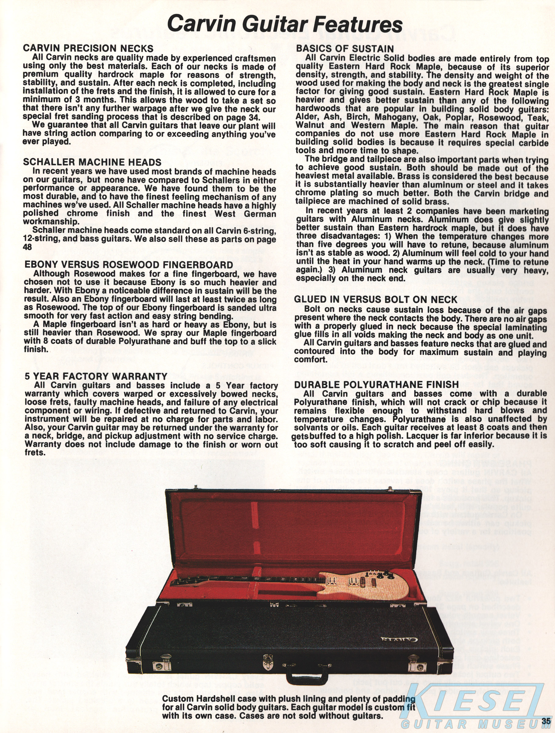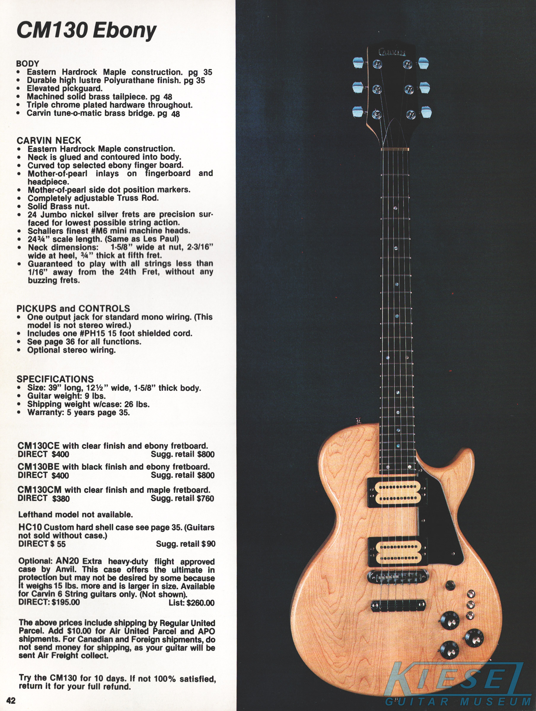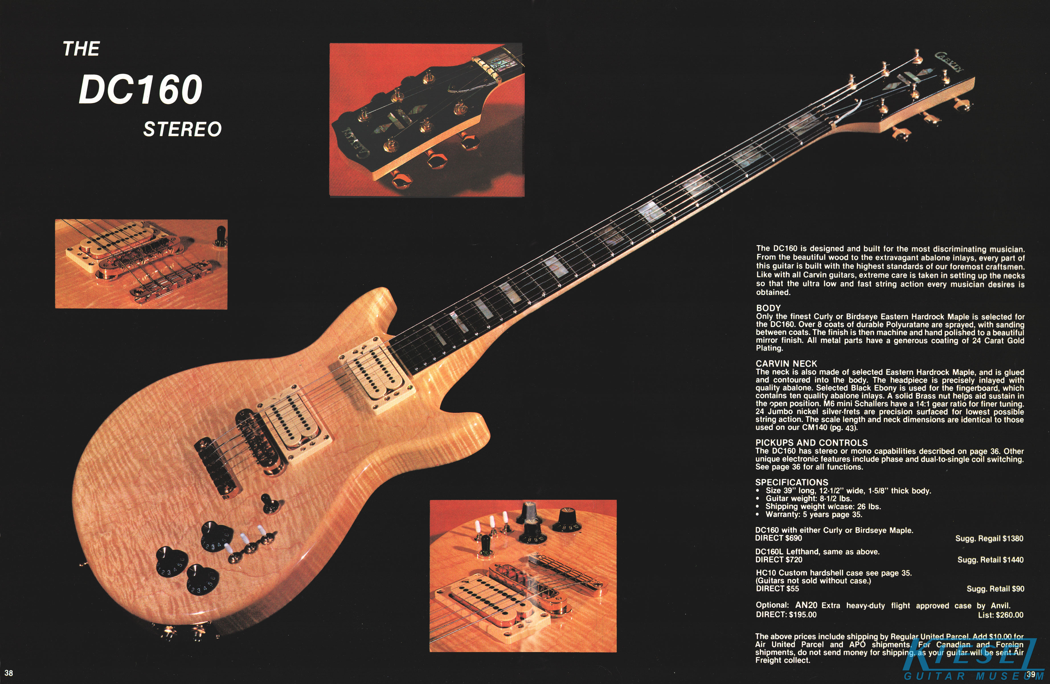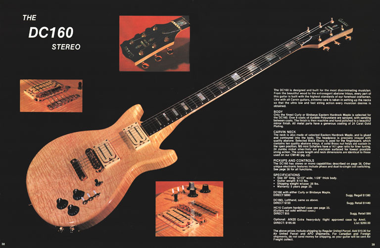 Although the LB60 bass was no longer featured in the catalog, the DC160, made from curly or birdseye maple, with abalone block inlays, abalone headstock inlay and 24K gold hardware as standard features continued to get a two-page spread. Electronics were the same as the DC150. The pickguard found on all other Carvin models was noticeably absent, allowing the wood to show - a feature that would soon be standard on most Carvin guitars. The DC160, in curly or birdseye maple, sold for $690, or $720 for a lefthanded model. In addition to the HC10 case, the Anvil AN20 flight case was available for $195. The Anvil case would only be offered in 1980.