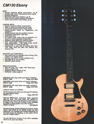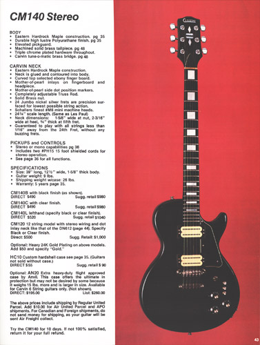 The CM130 was also available in the same 3 configurations as the DC150, and featured mono output, in a Les Paul style body shape. Pickups and controls were hte same as the DC150. The CM130BE and CE sold for $400, and the CM130CM sold for $380. A lefthanded model was not offered. The CM140 was a slightly upscale CM130 (although not as extreme as the DC160). It was stereo wired, and included MOP block and headstock inlays. A maple fingerboard was not offered, but a left-handed version was available. The CM140, in black or clear finish, sold for $490. The lefthanded model was $520. Gold hardware was an additional $50. The HC10 case for any of the CM models was $55, and the Anvil AN20 flight case was also offered for $195. Not shown in the catalog was the CM120, a twelve-string version of the CM140, which was omitted from the 1979 catalog, presumably to be redesigned from the '78 version. It was available in the same finishes of the CM140, with stereo wiring and MOP dot inlays on the same neck as the DN612. It sold for $500.