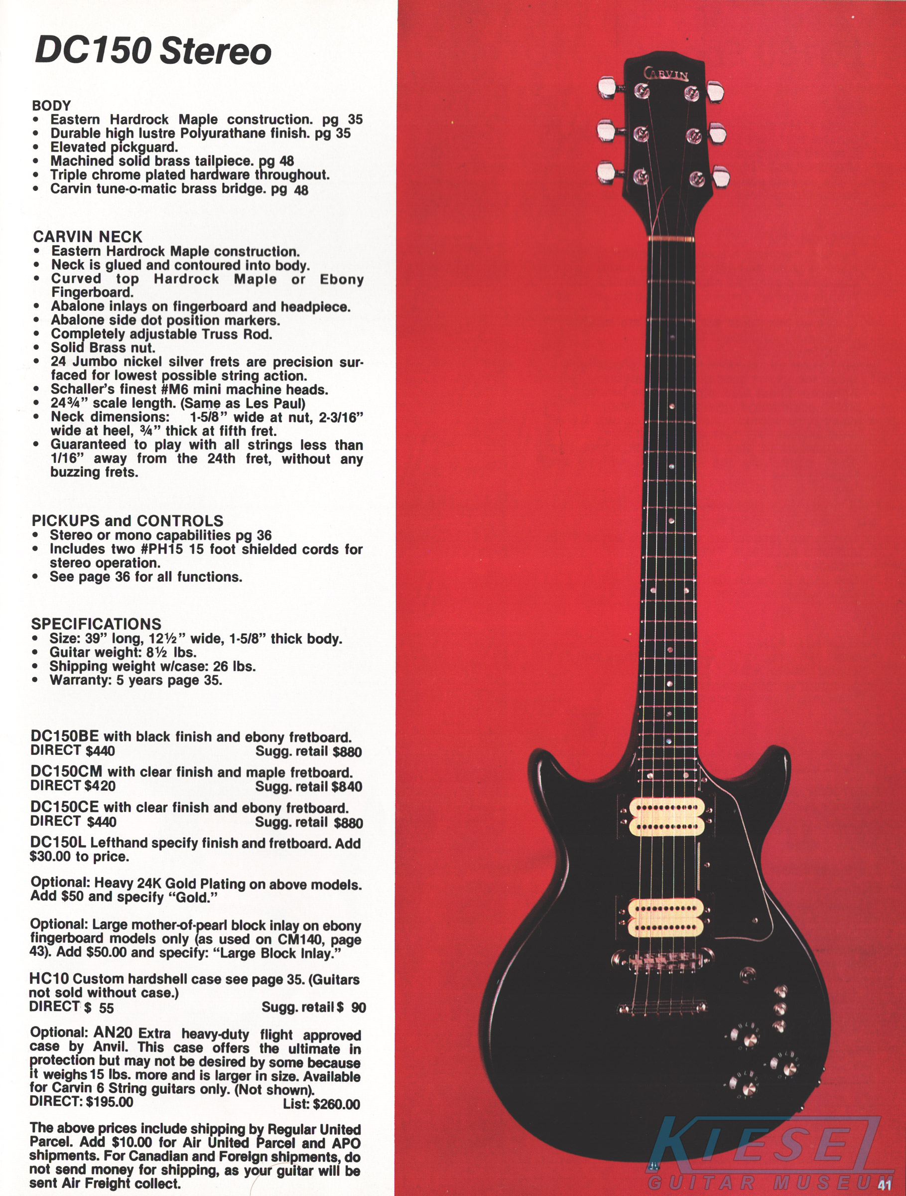 The DC150 was available in 3 configurations: clear finish on maple body/neck with maple fingerboard (DC150CM), clear finish on maple with ebony fingerboard (DC150CE), and black finish on maple with ebony fingerboard (DC150BE). All three models were stereo-wired, with dual M22 humbuckers, dual volume controls, single tone control, and coil splitters and phase switches. Abalone dot inlays and chrome plated Schaller tuners and bridge/tailpiece assemblies were also standard. Optional gold hardware was available for an additional $50, and MOP block inlays were available on the ebony fingerboard for an additional $50. A left-handed model was available for an additional $30. The DC150CM sold for $420, the DC150BE and DC150CE sold for $440. The HC10 hardshell case sold for $55.