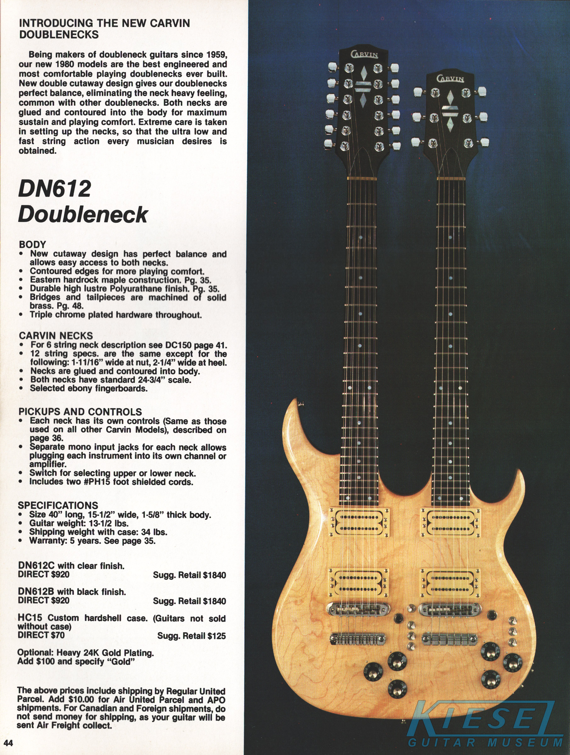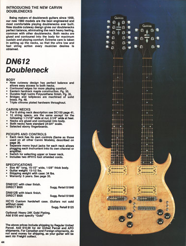 1980 saw the return of doublenecks to Carvin's lineup, both of which were entirely different from their 70's counterparts, sporting sleek looks, set necks, and a standard scale 20-fret fingerboard on the bass side. These were the first bespoke Carvin doublenecks; they were not clones of another manufacturer's instrument, and they didn't look like earlier Carvin doublenecks that appeared to be cobbled together from spare parts. Interestingly, the DN series featured the body style that would be the template for the hugely popular DC200 series of guitars that would be introduced in 1981, and the redesigned LB60 bass that would appear in 1986. The DN612 was available in black or natural finishes, both with ebony fingerboards, MOP dot inlays, chrome hardware and mono wiring, with an input for each neck. In another first for Carvin, cream bezels were shown installed on the M22 pickups. Cream bezels had been mentioned as available when M22s were ordered as parts, but they had never been shown on a factory-built instrument. Price on the DN612 was $920.00 (either finish), and optional gold hardware was an additional $100.00. The HC16 case was an additional $70.00.