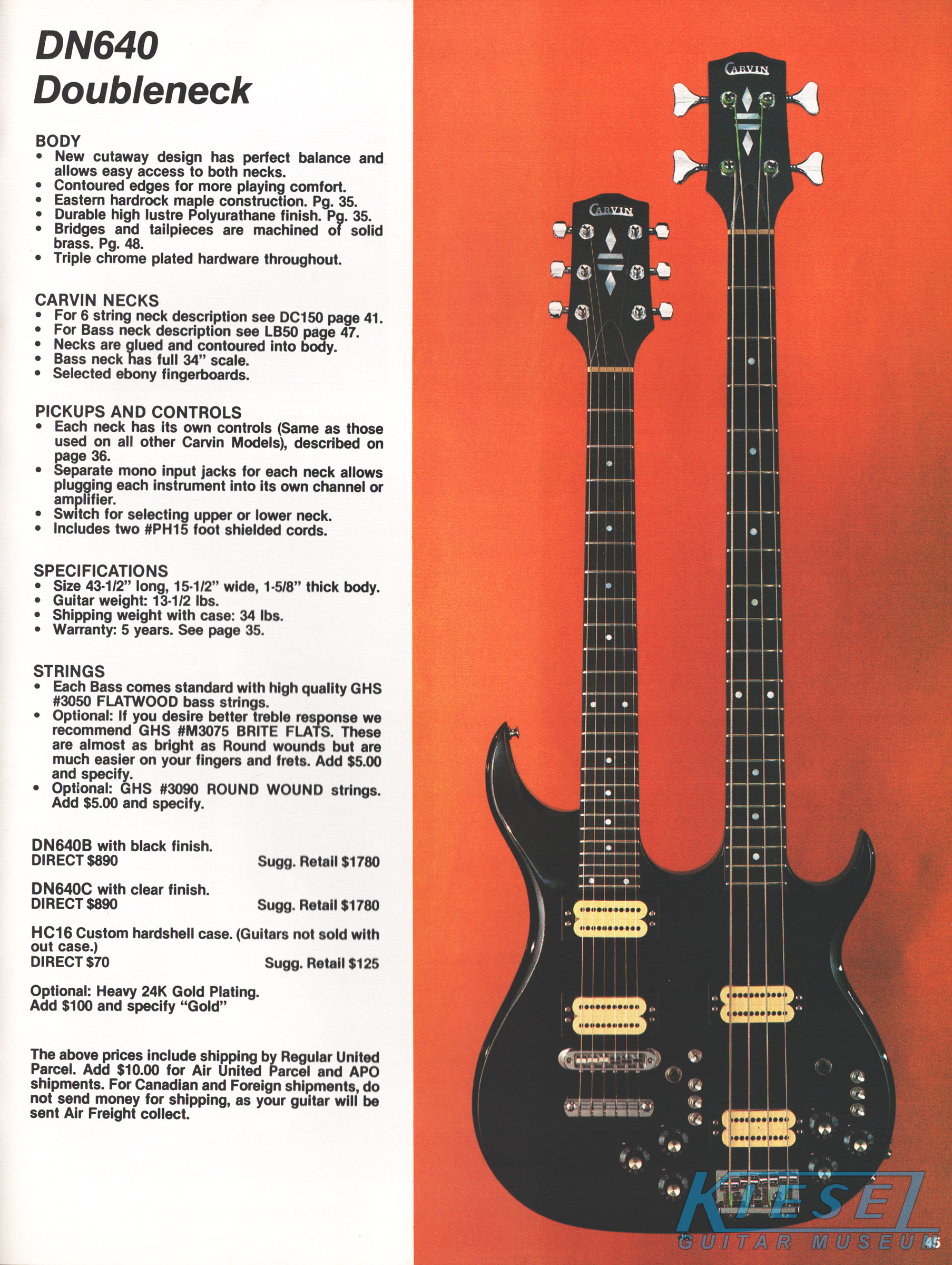The DN640 doubleneck bass/6-string guitar was available in black or natural finishes, both with ebony fingerboards, MOP dot inlays, chrome hardware and mono wiring, with an input for each neck. Price on the DN640 was $890.00 (either finish), and optional gold hardware was an additional $100.00. The HC16 case was an additional $70.00. Like the new DN612 doubleneck, the body shape was completely new, and very reminiscent on the DC Series guitars that would bow in 1981.