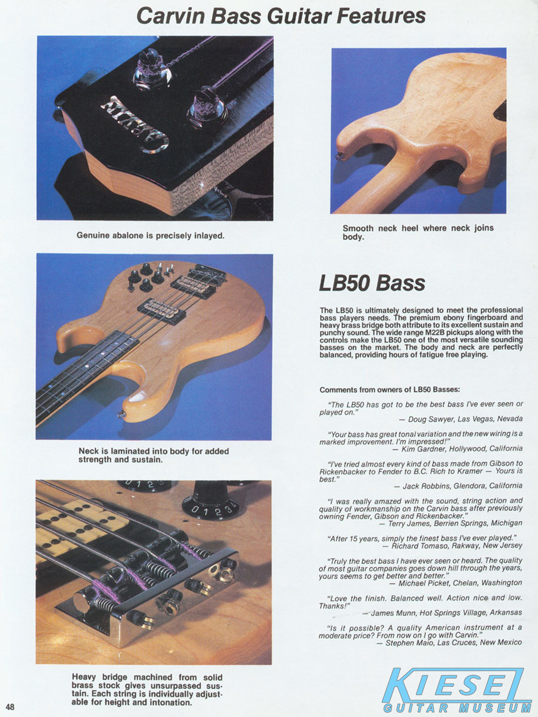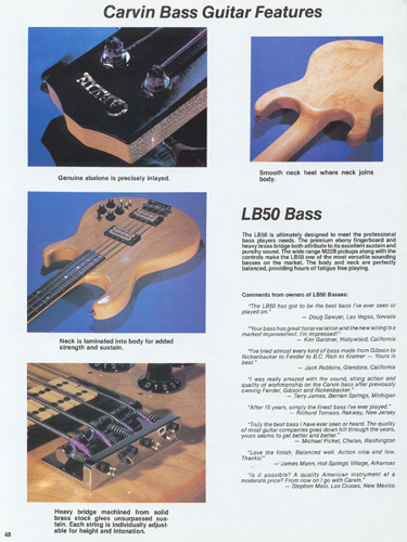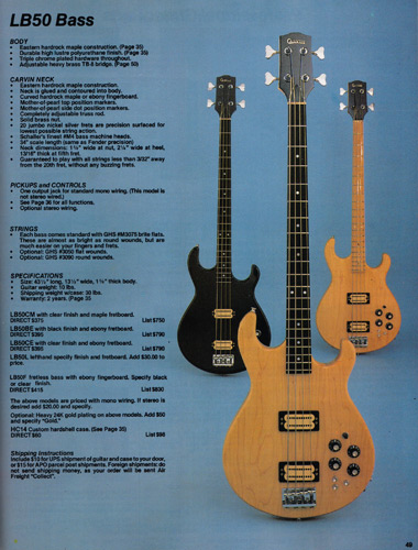 The 1981 catalog sported new photography for the LB50 - instead of just describing the 3 variants, all 3 models were shown in a single photograph. There were some changes to the LB50 from the previous year - it now sported dual volume and dual tone controls, versus the one master tone control of the '79 and '80 models (a great way of narrowing down the year of a particular instrument). To facilitate this additional control, the coil splitters and phase switch was moved to a position behind the volume and tone knobs (they were in front of the controls in previous years, like the DN640). As in 1980, the LB50 was available in black with an ebony fingerboard (LB50BE), clear maple with maple fingerboard (LB50CM) or clear maple finish with an ebony fingerboard (LB50CE). Any of these could be ordered with stereo wiring and/or gold hardware, and the LB50BE and LB50CE could be ordered left-handed. The LB50CM sold for a very reasonable $375, and the BE and CE models were $395. Left-handed models were an additional $30, and a fretless model could be ordered for $415. Stereo wiring was $20, and gold hardware was an additional $50. The HC14 case was $60.