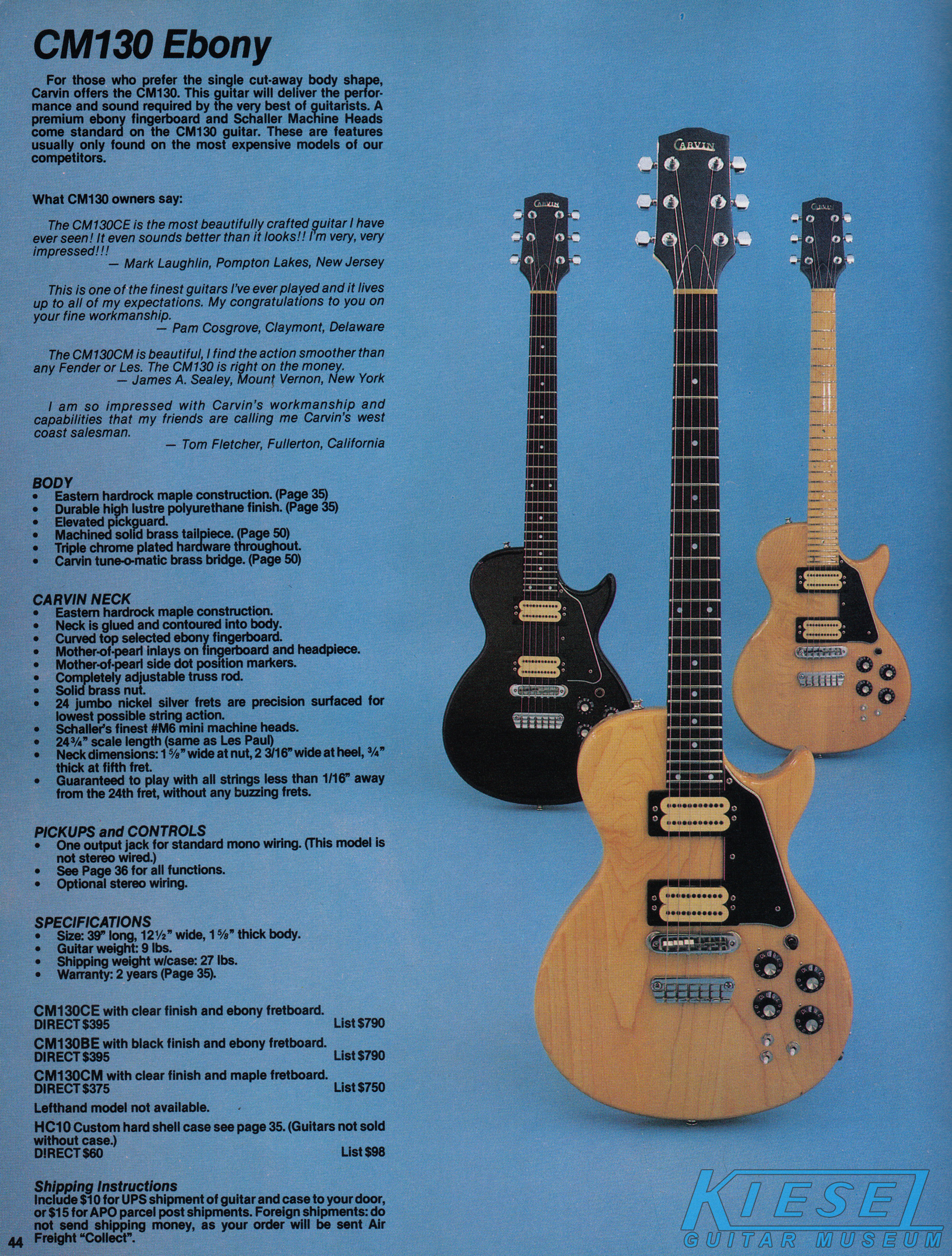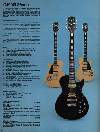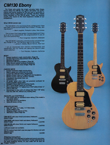 Carvin's singlecut Les Paul style models, the CM130 and CM140 continued to be strong sellers. Body construction, materials and electronics were the same, but the CM140 offered stereo wiring and block inlays (but no maple fingerboards). The base price of the CM130 was $395.00 (with an ebony fingerboard) and the base price of the CM140 was $485.00. The CM140 was available in a left-handed model; the CM130 was not. Gold plated hardware was offered on either.