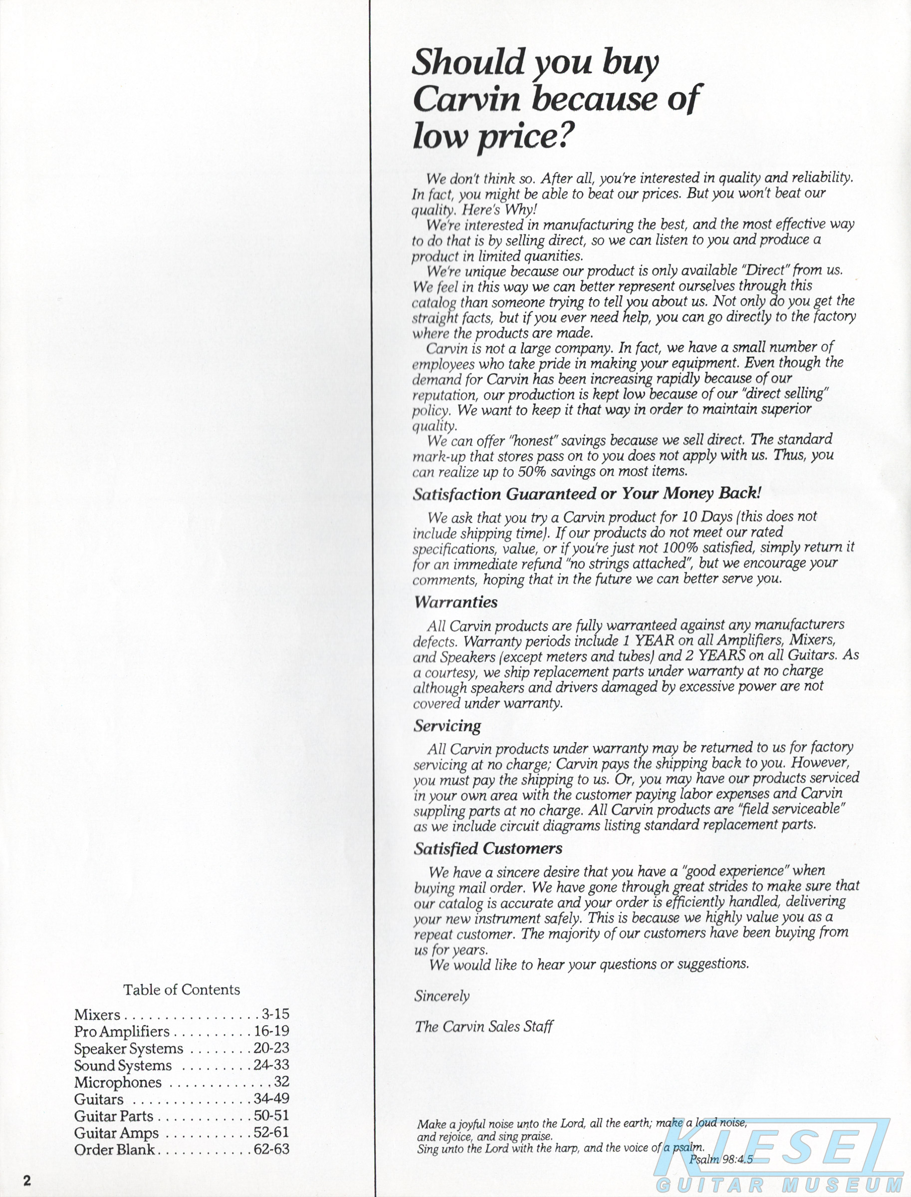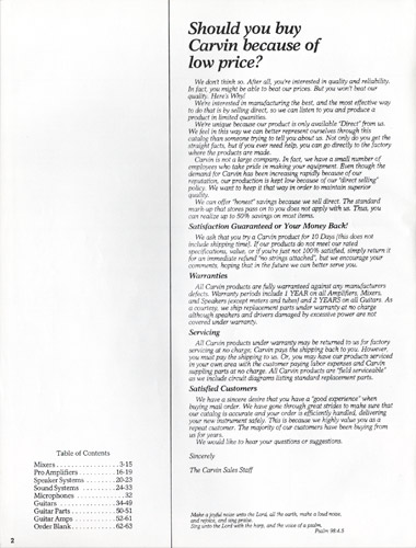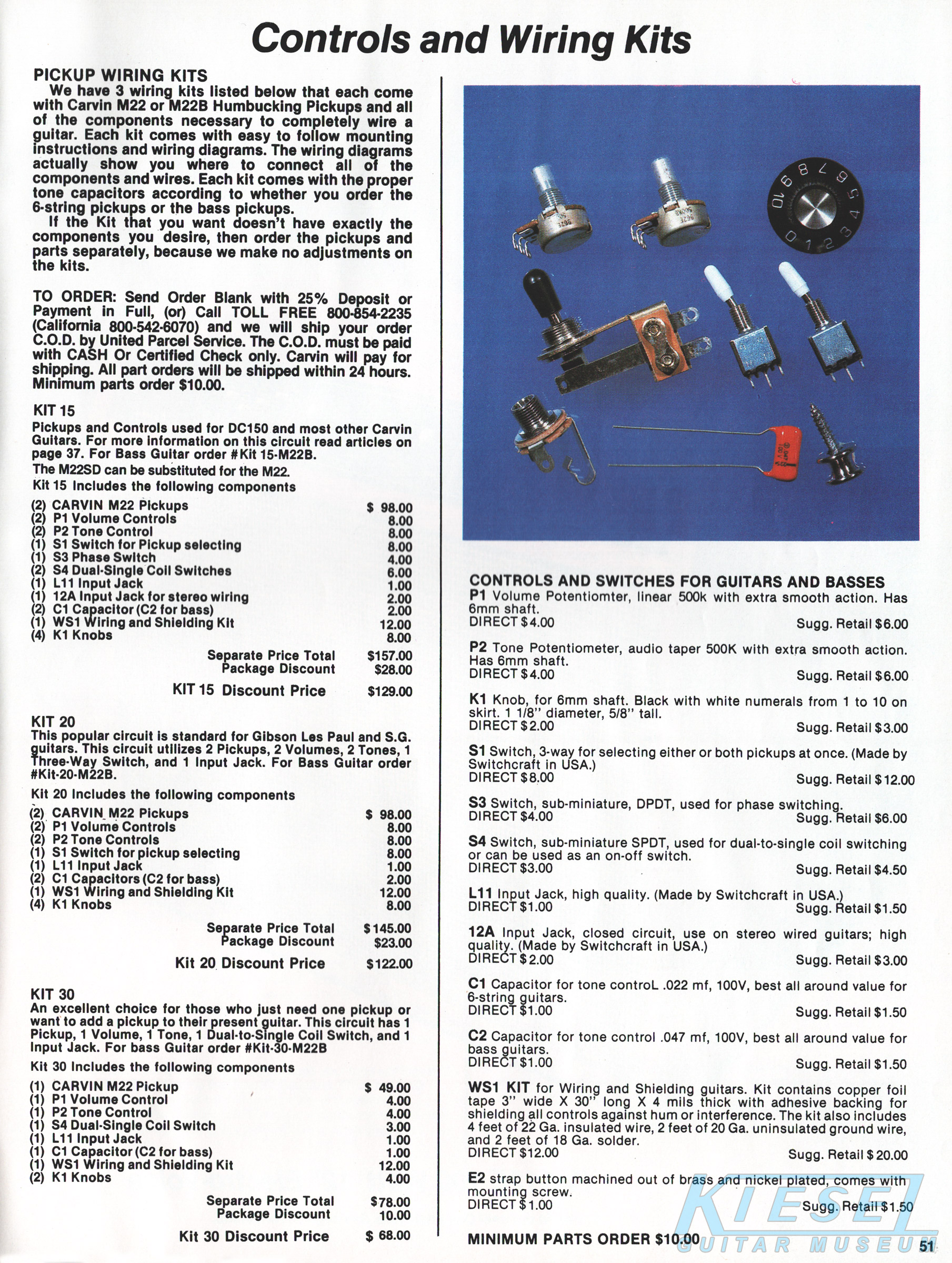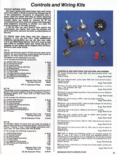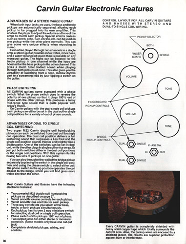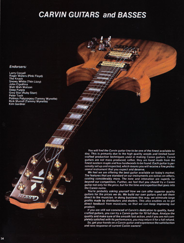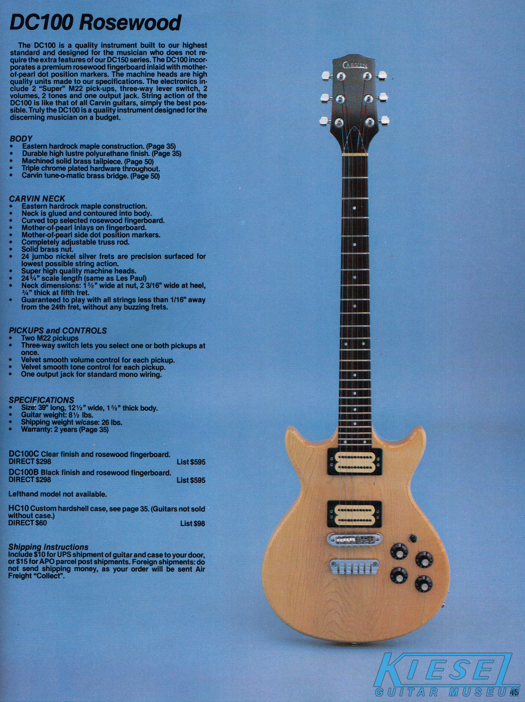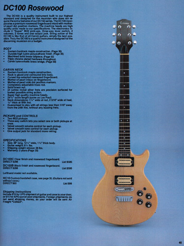 The DC150 was 5 years old in 1981, but showed no signs of fading in popularity. Like the DC200, it was available in black or natural, with ebony or maple fingerboard. Stereo wiring and phase/coil switches were standard. The DC150CM (clear finish/maple fingerboard) was $415.00, and the DC150BE (black/ebony) or DC150CE (clear/ebony) were $435.00. A left-handed model was offered for $30.00 more, and gold hardware was offered for $50.00. The DC100 was a no-frills guitar, and was a great value at only $298.00 in black or clear finishes. This is one of the few modern Carvins to have a rosewood fingerboard, and it sported no-frills electronics (but still used the M22 pickups used in other models). This is the only year the DC100 with a rosewood fingerboard was produced; in 1982, ebony would be used.