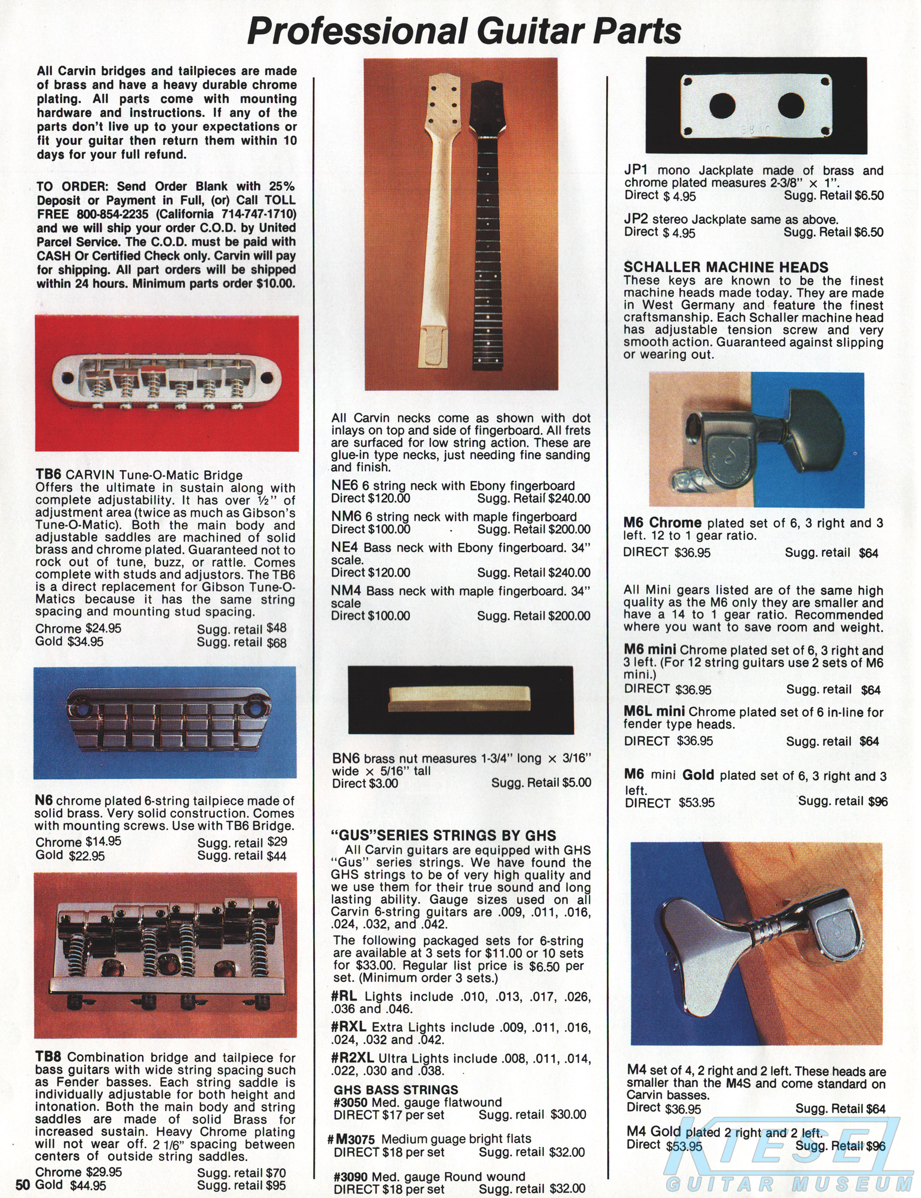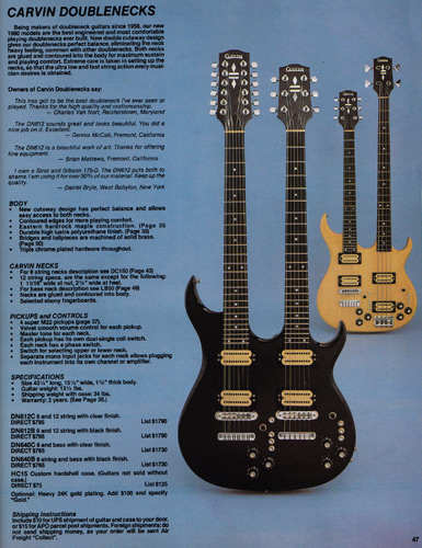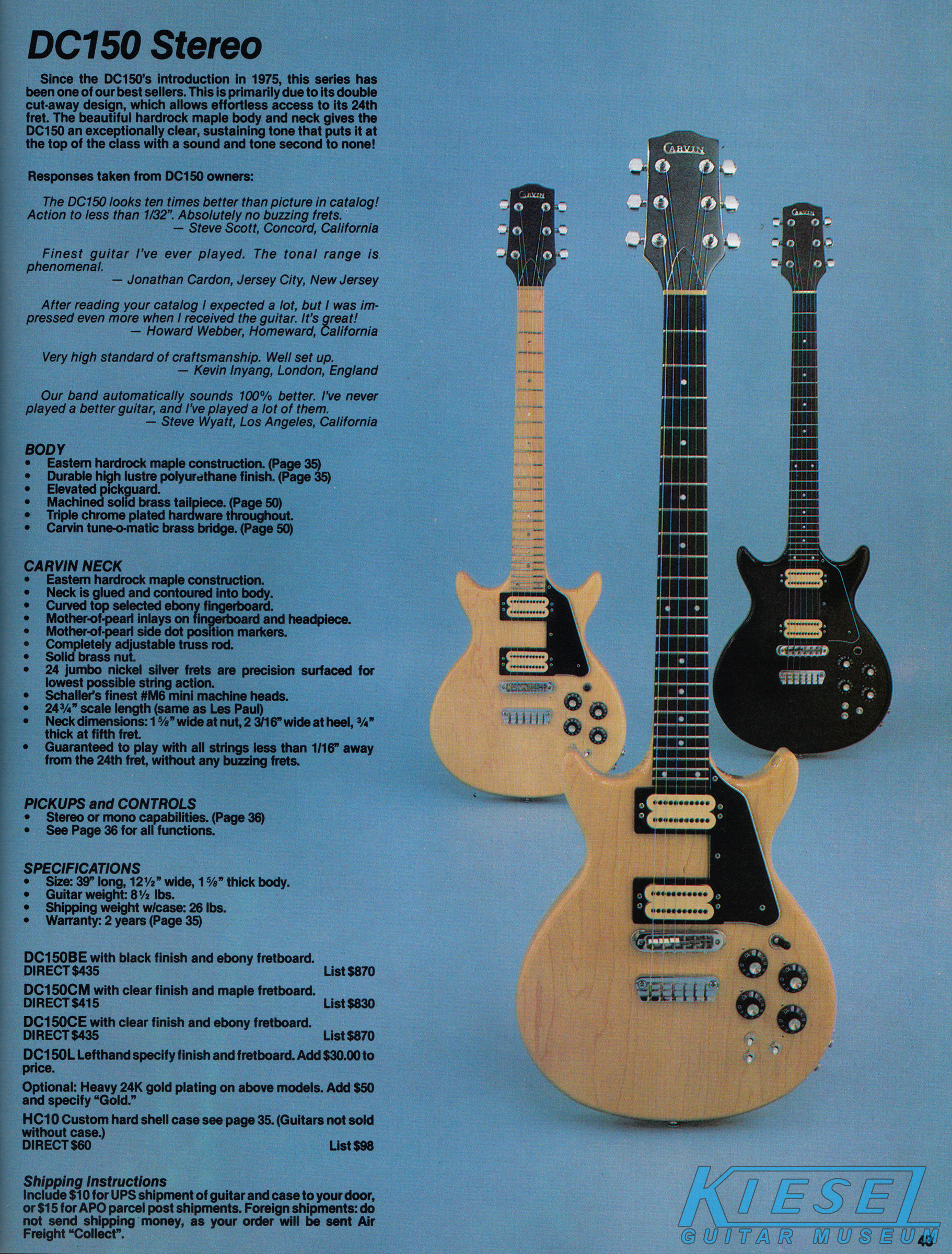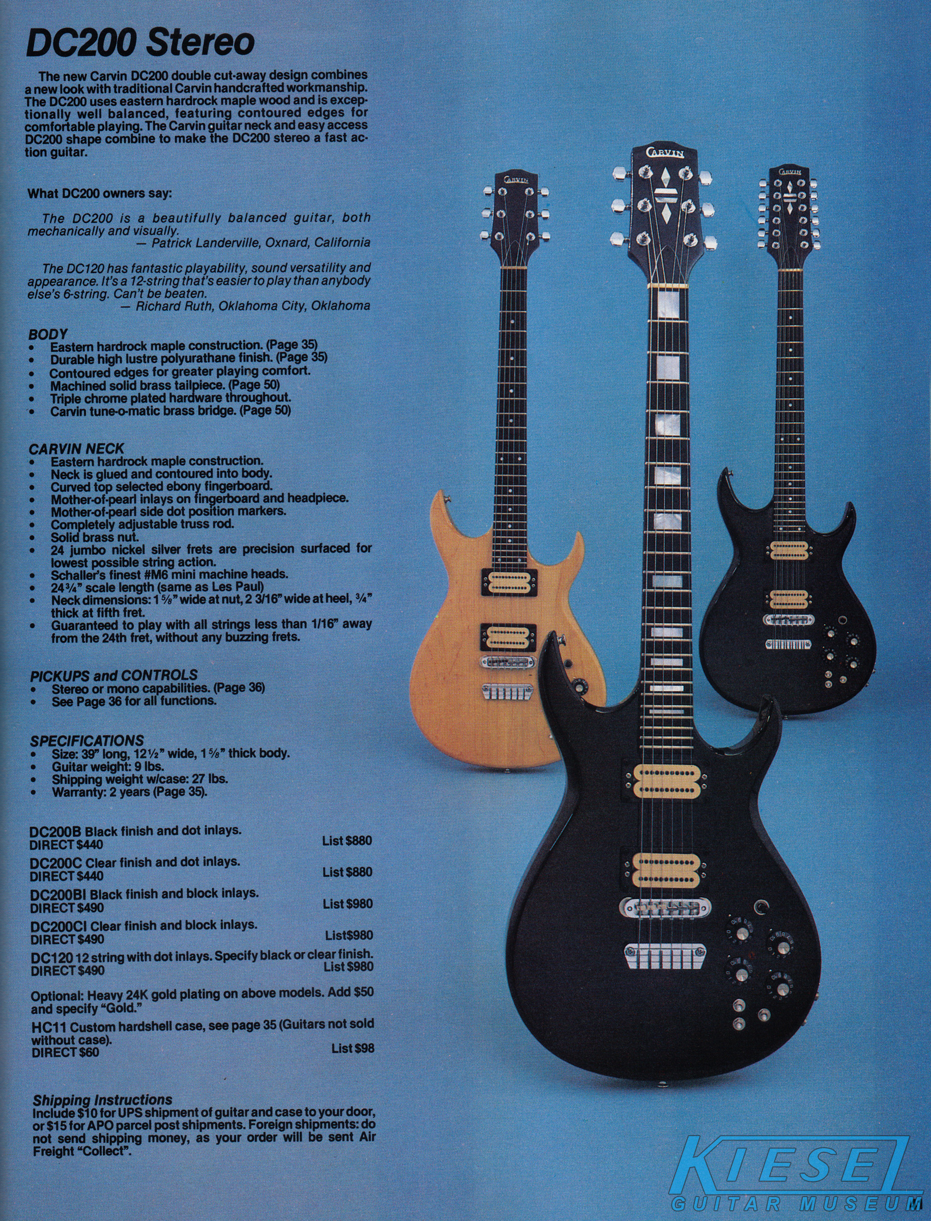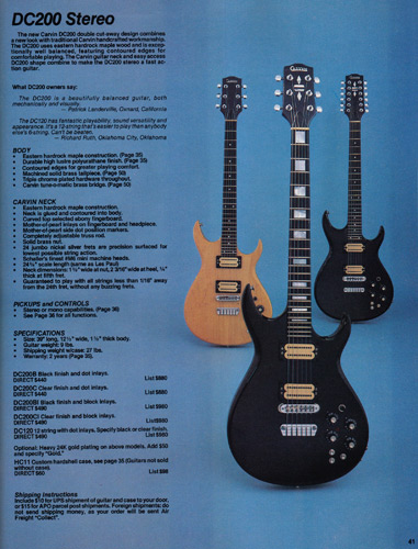 The new DC200 Stereo was also offered in Carvin's standard finishes, which at the time were either black or natural. The body was constructed of maple, and the standard fingerboard was ebony, like most other Carvin guitars and basses in 1981. Maple fingerboards and left-handed models were not offered. The DC200B, with black finish and dot inlays, was $440.00. The DC200C, with clear finish and dot inlays, was also $440.00. The DC200BI (black with block inlays) and DC200CI (clear with block inlays) were $490.00. The DC120 12-string was $490 in black or clear, with dot inlays. Gold hardware was available for $50.00.