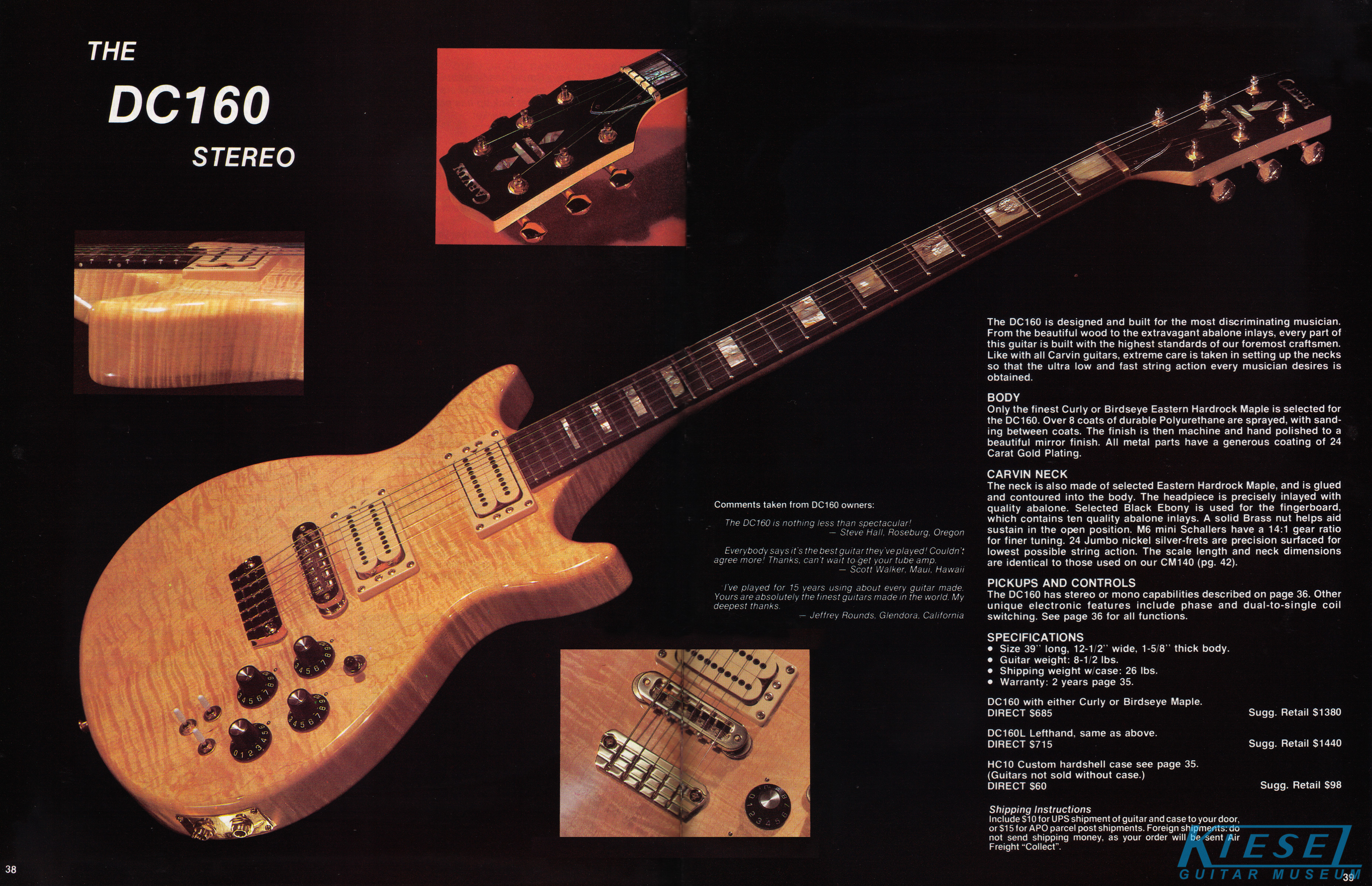 The DC160 Stereo was still the flagship instrument, even though it was now sharing that title with the DC200 Koa. This model was made from either curly or birdseye maple, with ebony fingerboard, standard gold hardware, standard block inlays, and phase switching and coil splitters on M22 pickups with dual volume and dual tone controls. The DC160, in curly or birdseye maple, was $685.00, and the left-handed model was $715. The HC10 hardshell case was $60.00.