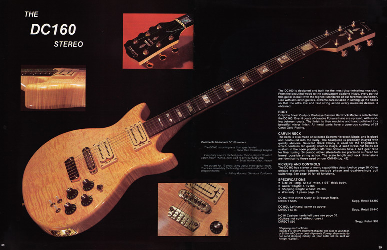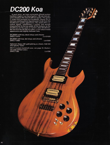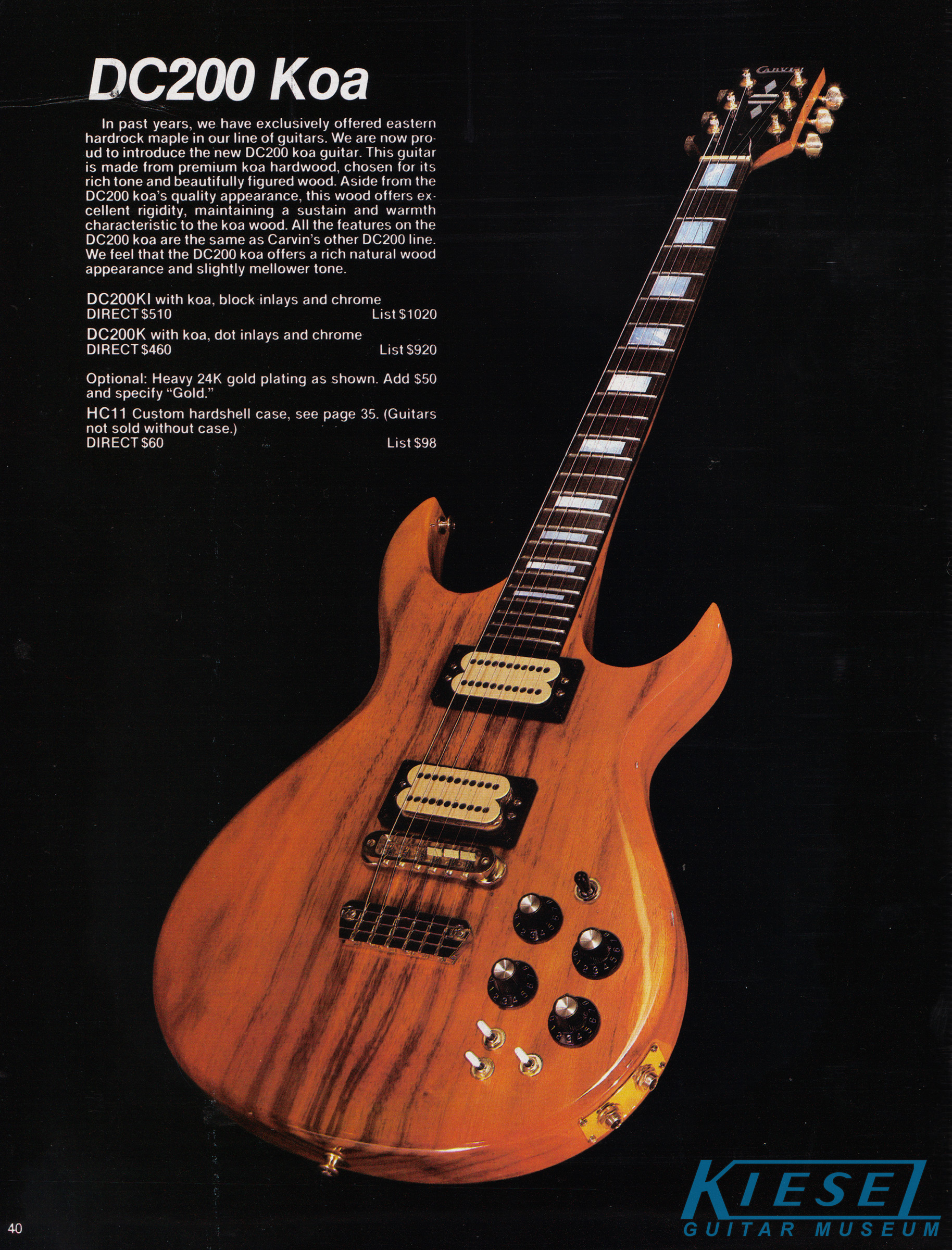 The DC200 Koa was one of Carvin's most revolutionary instruments, and would set the stage for much of what would come in the future. Many of the appointments were taken from the DC160, including stereo wiring, phase switching and coil splitters, as well as gold hardware and MOP block inlays. The koa wood is what really set this model apart from the rest, however, and what somewhat unusual for any 80s-era guitar. The scale length of the DC200 was 24.75", which was the same as a Les Paul. The catalog also showed two gorgeous photos of the DC200K, which is especially interesting considering the photo and editing technology of the time. The DC200K with block inlays and chrome hardware was $510.00. With dot inlays and chrome hardware, it was $460.00. Gold hardware could be added to either variant for $50.00. The HC11 hardshell case was an additional $60.00.