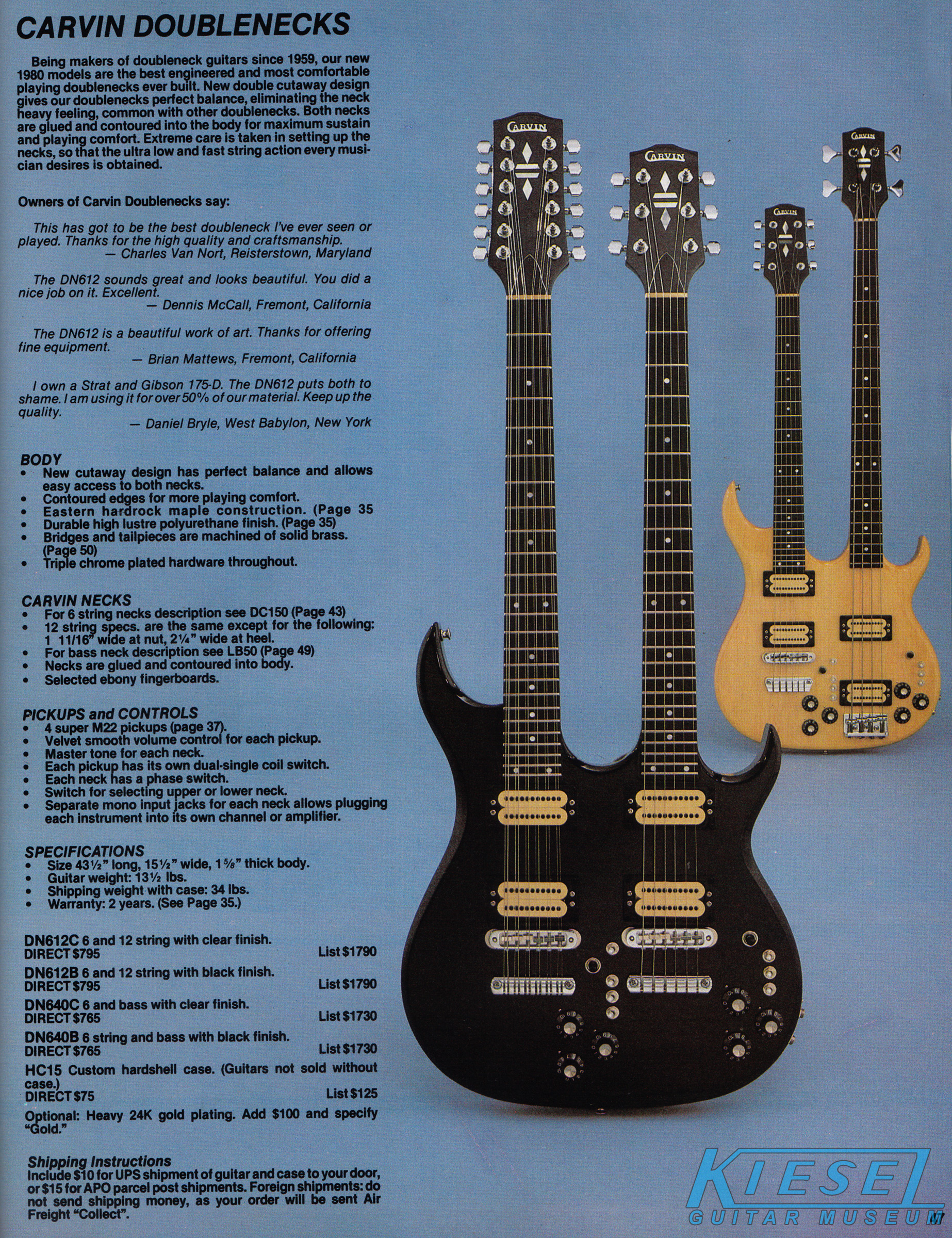 Also available in 1981 was the DN612 and DN640 doublenecks, which were basically the same as the 1980 model, with the exception of the control layout on the top neck. Take a look at the knobs on the '80 model - the guitar and bass volume/tone controls were a mirror image of each other, whereas the '81 (and later) used the same layout. This was the design that would remain for these models until neck-thru design was introduced in 1988. The DN640, in black or clear finish, sold for $765. The DN612, also available in black or clear finish, was $795. Gold hardware was an additional $100, and the HC15 case was $75. Left-handed models or maple fingerboards were not available.