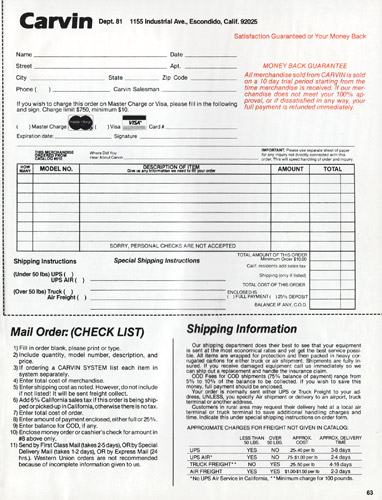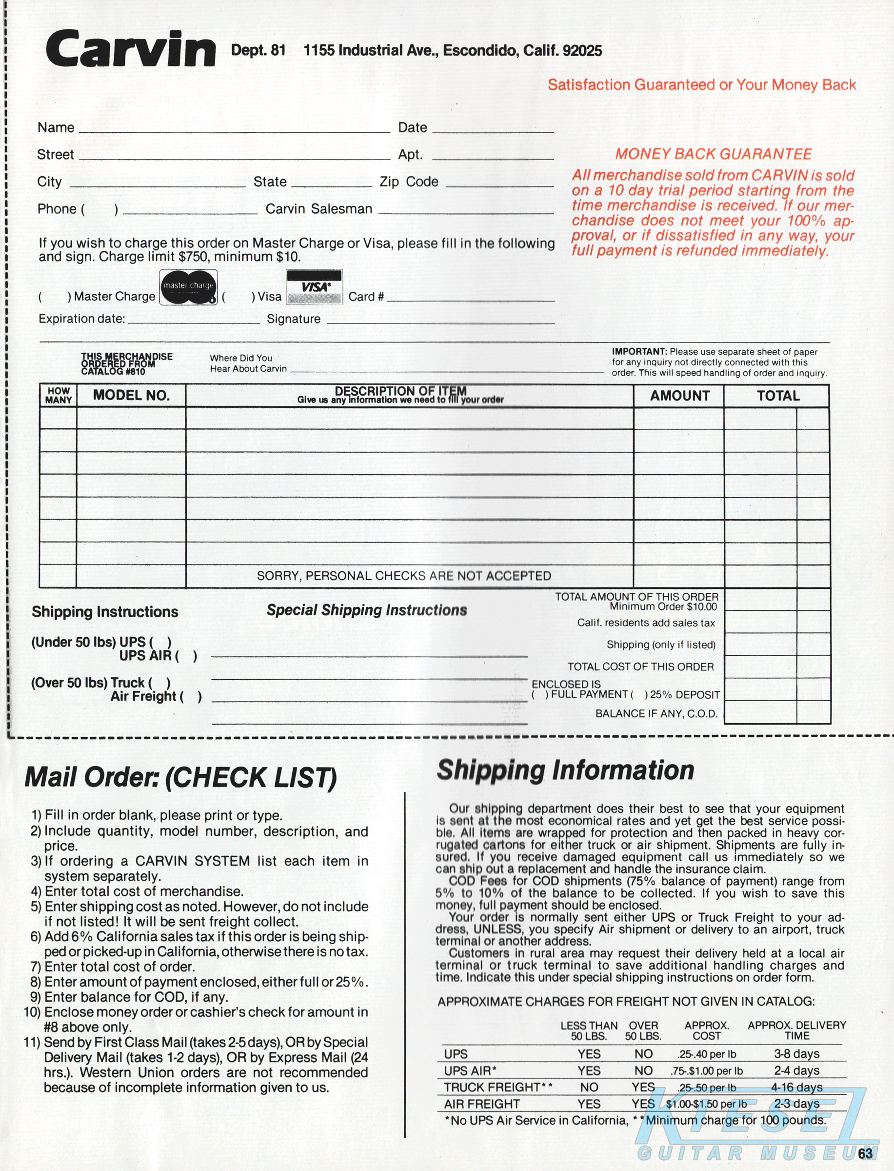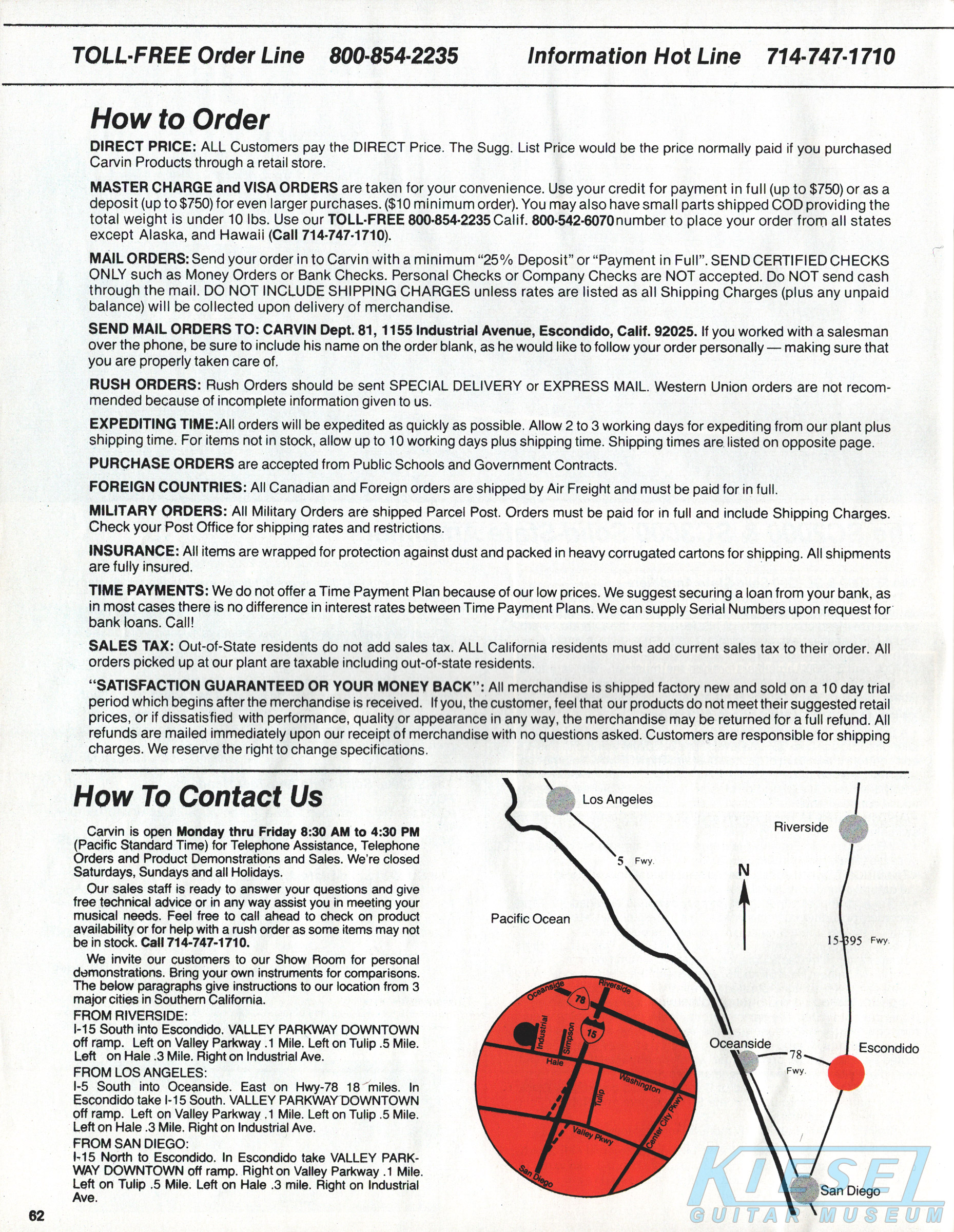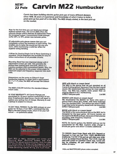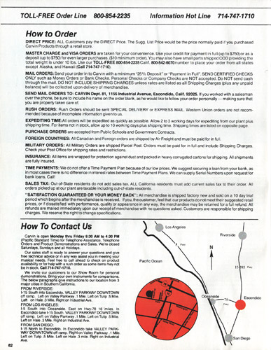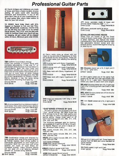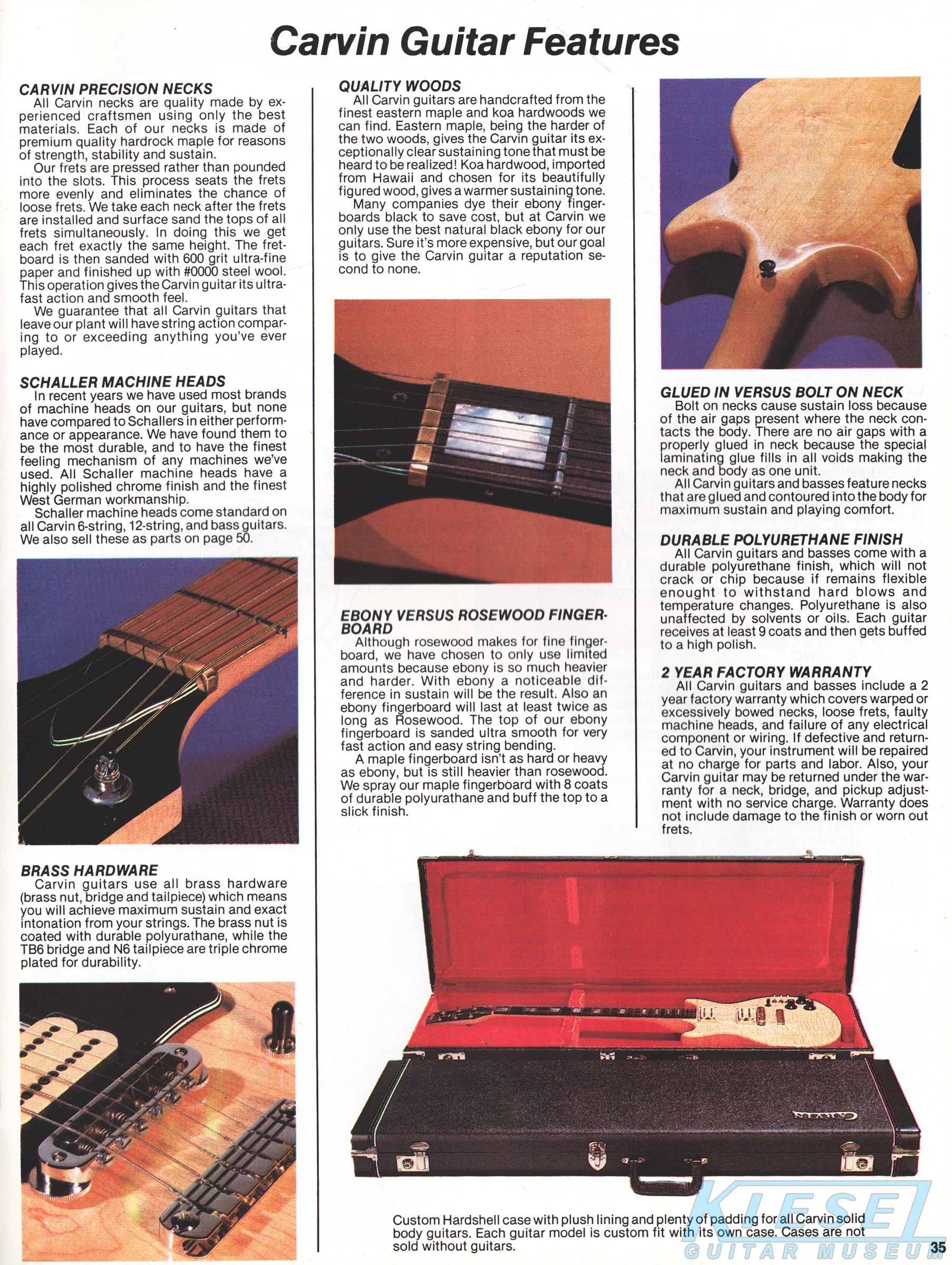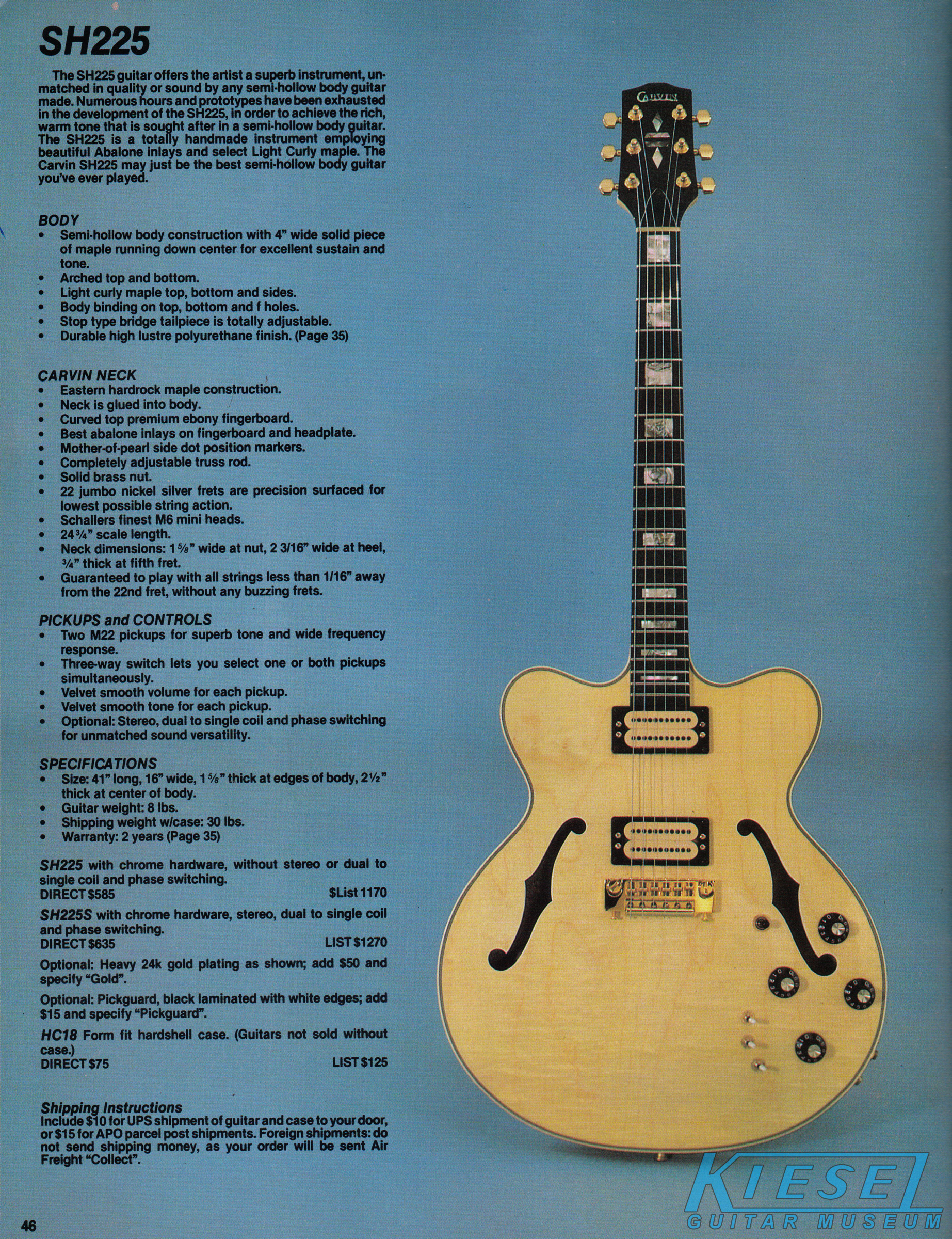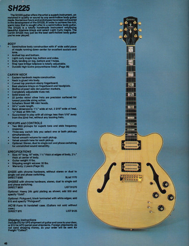 Also new for 1981 was the SH225. Although it's somewhat common knowledge today, it was not widely known in 1981 that Hofner made the bodies and necks for these instruments, and Carvin finished and assembled them. This semi-hollow Venetian (rounded) cutaway archtop was constructed with a maple neck, and light curly maple top, back and side, with ebony fingerboard and body binding. The electronics were the same as other Carvin models, and could be had with or without stereo wiring, phase and coil switches. Interestingly, a black plastic pickguard was optional. The basic SH225 was $585, and the SH225 Stereo was $635. Gold hardware was an additional $50.00, and the HC18 form-fit hardshell case was $75.00.