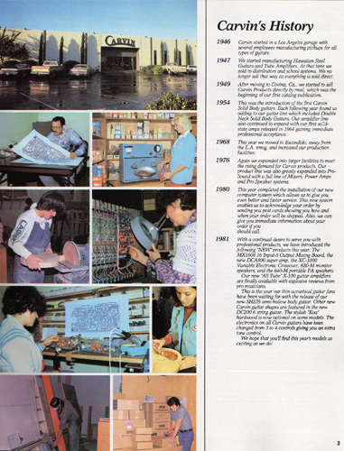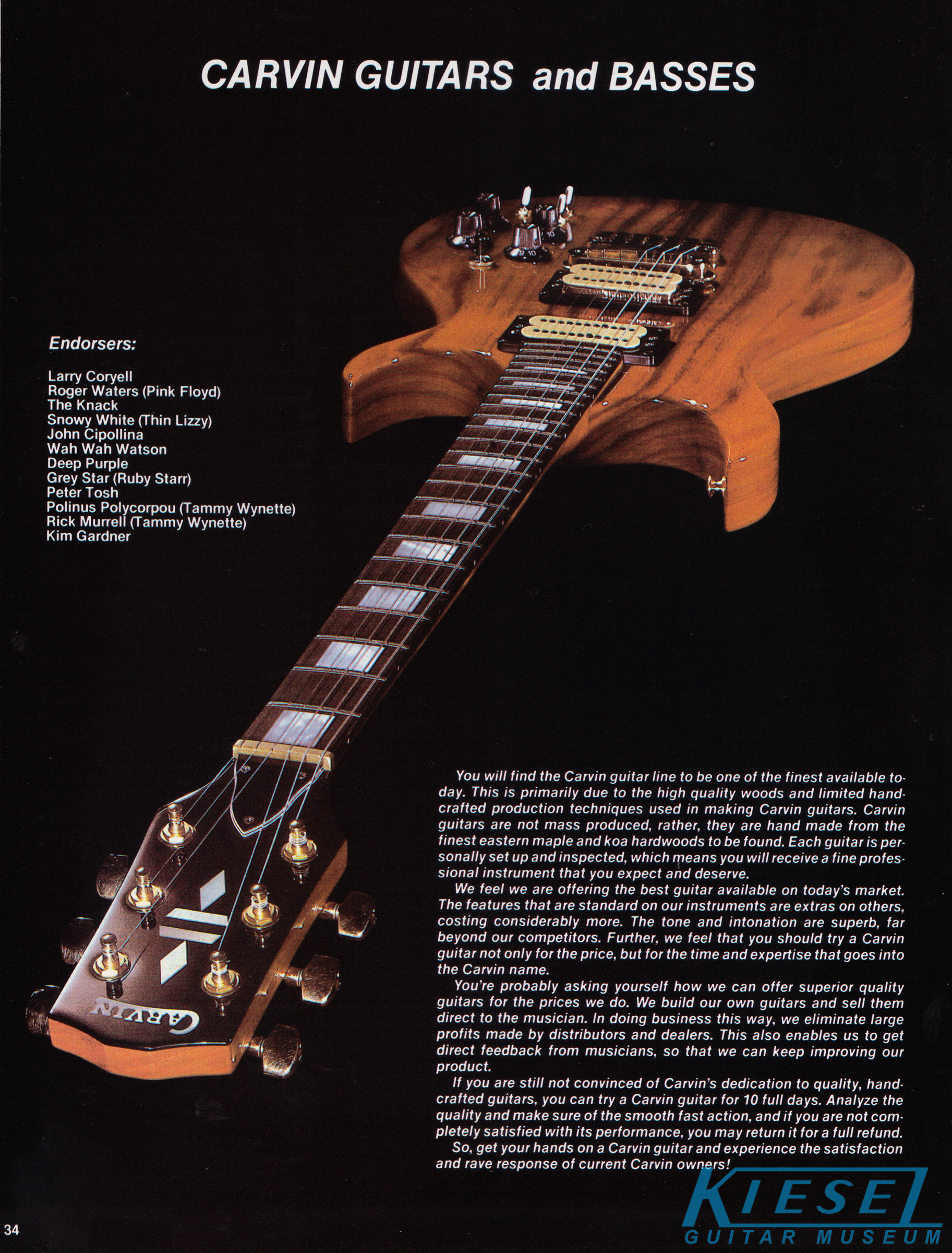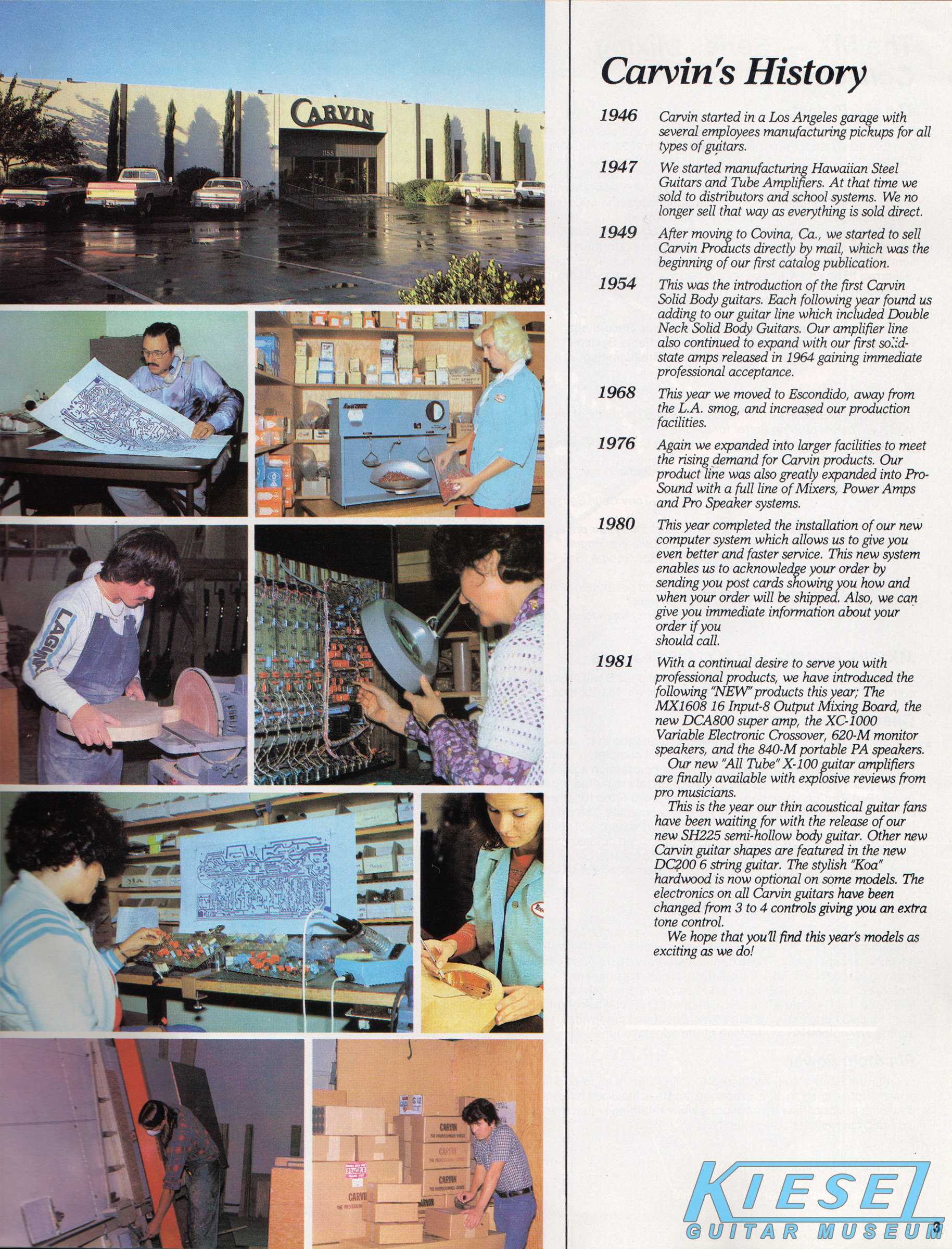 There were two profound and significant changes in 1981. First of all, the introduction of the "pointy" DC200 body shape. This extraordinarily popular shape would define Carvin of the 80's, and would still be in production 40 years later. Additionally, Carvin began offering Hawaiian koa wood on most models; their first foray into exotic woods. Although reasonably common today, this was way ahead of what most other manufacturers were doing in the early 80's. The body shape was previewed in 1980, as it was used on the newly-released doubleneck models, but the shape wouldn't be adopted on single neck guitars until 1981.