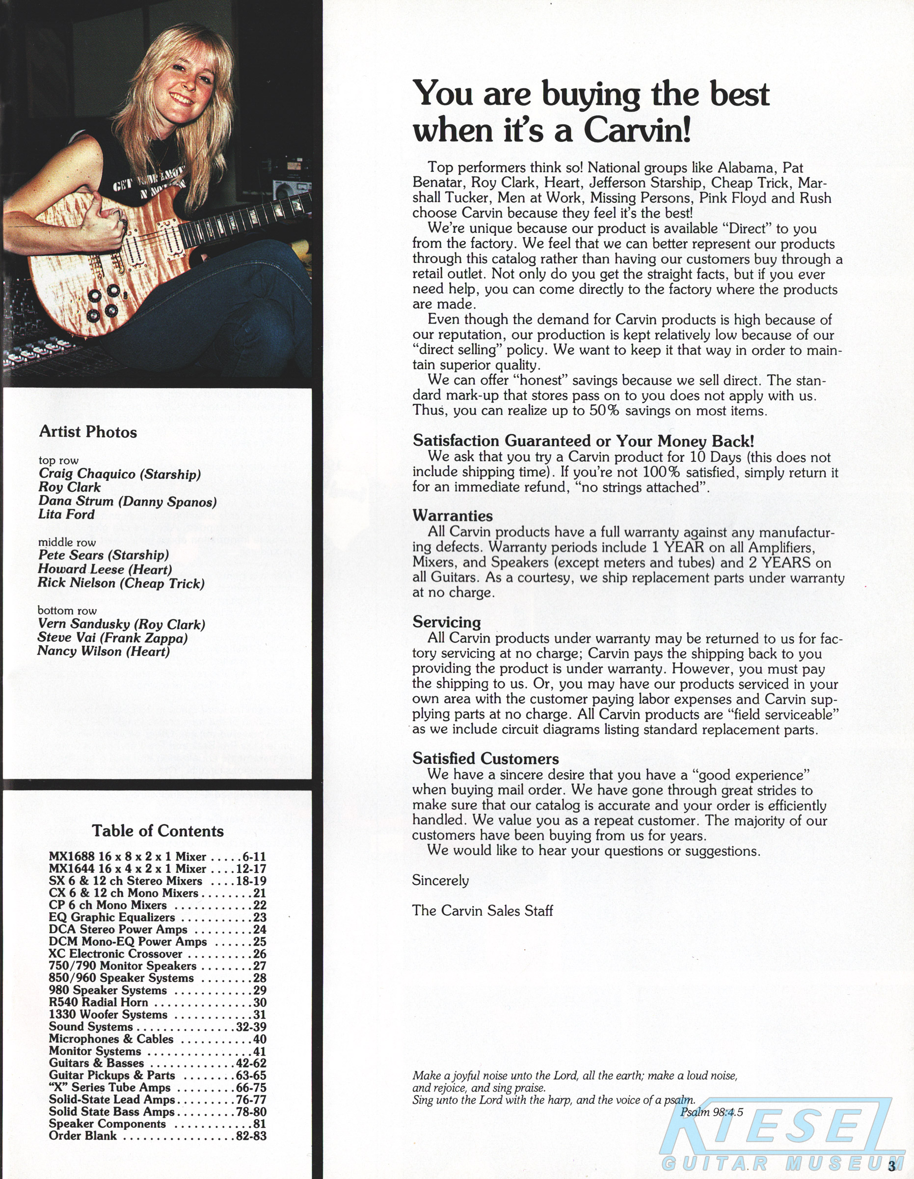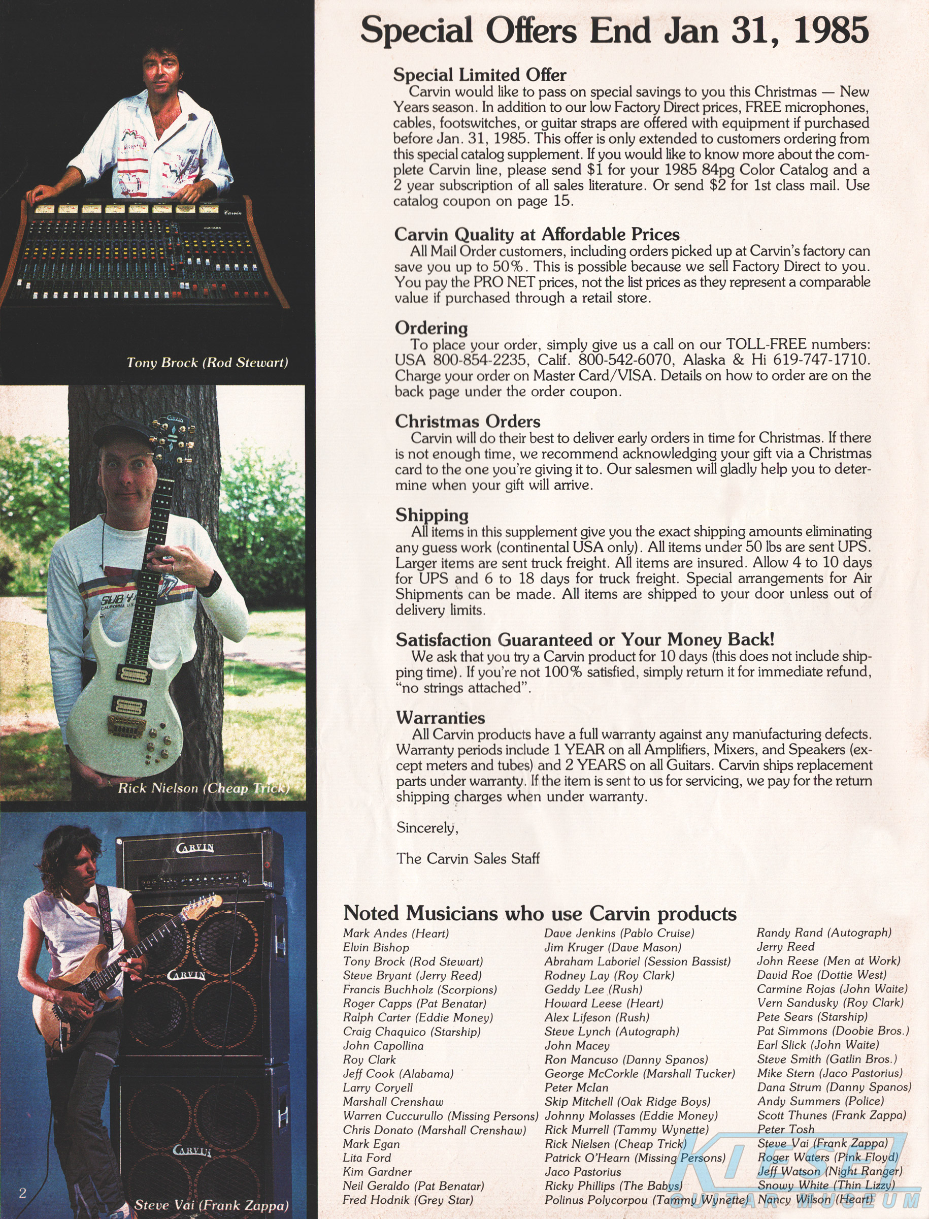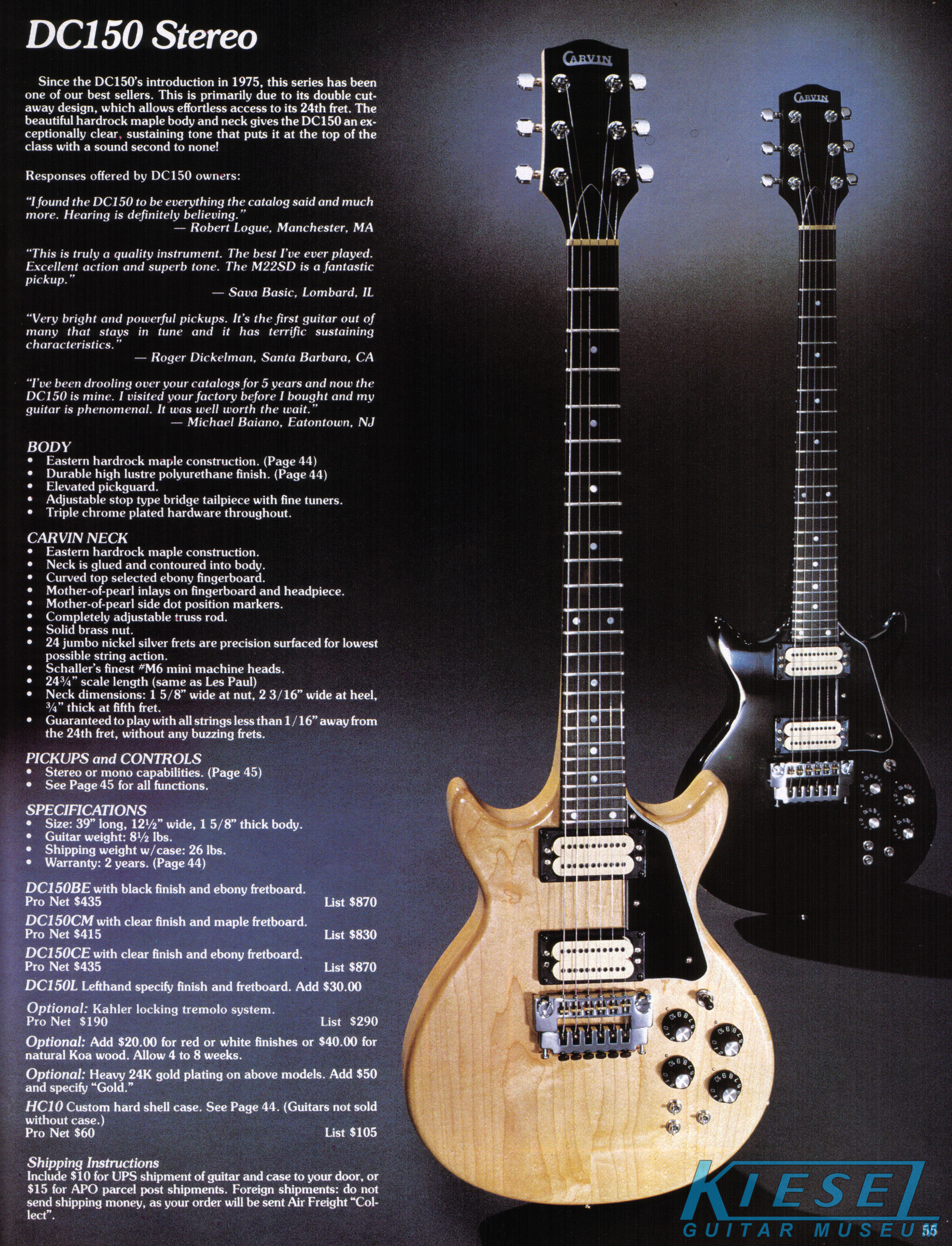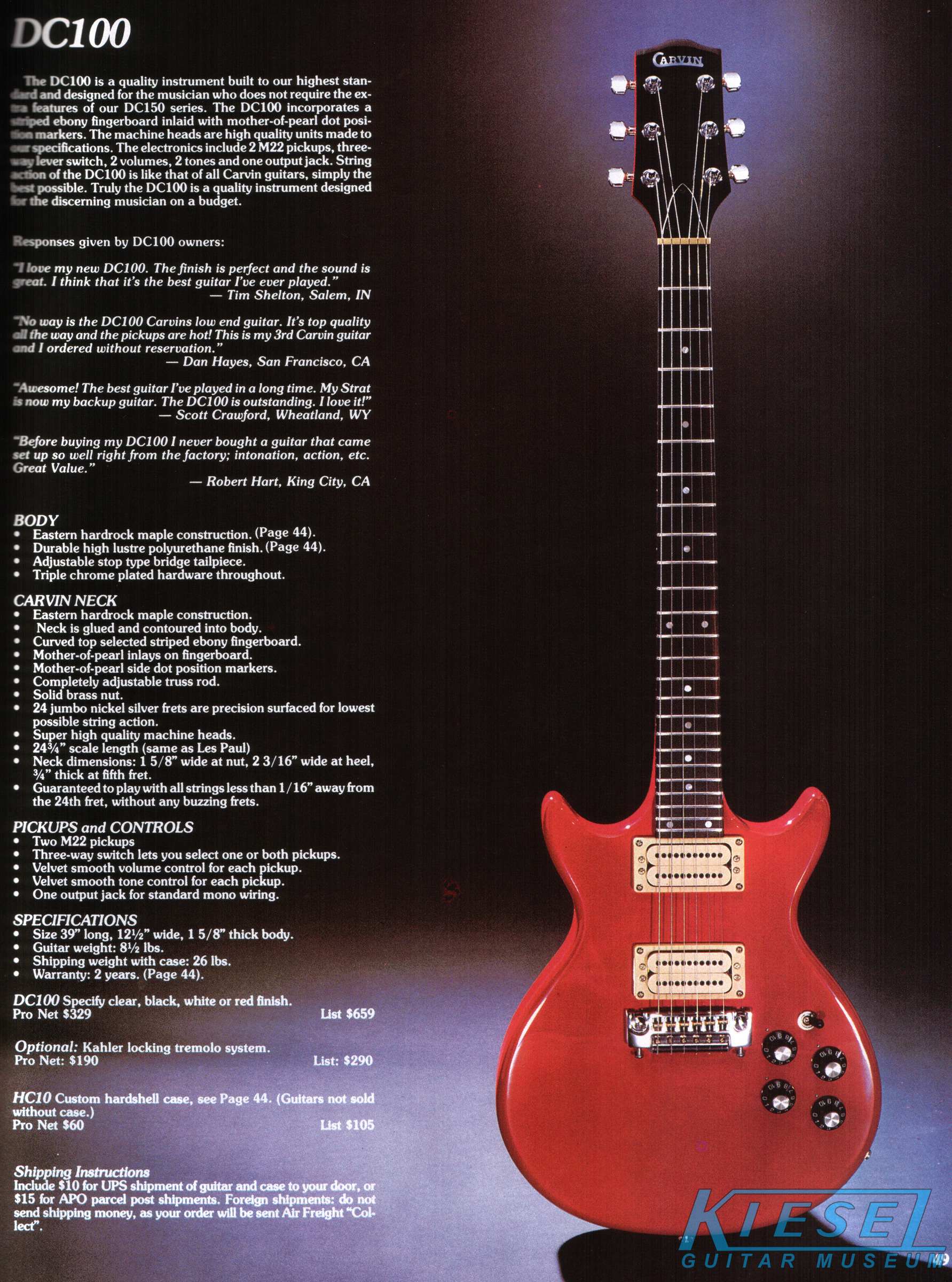 The DC100 was unchanged - both the catalog photo and the price. The Kahler Pro tremolo was offered as an option for an additional $190. Base price of the DC100 remained at $329, and the HC10 hardshell case was $60.
