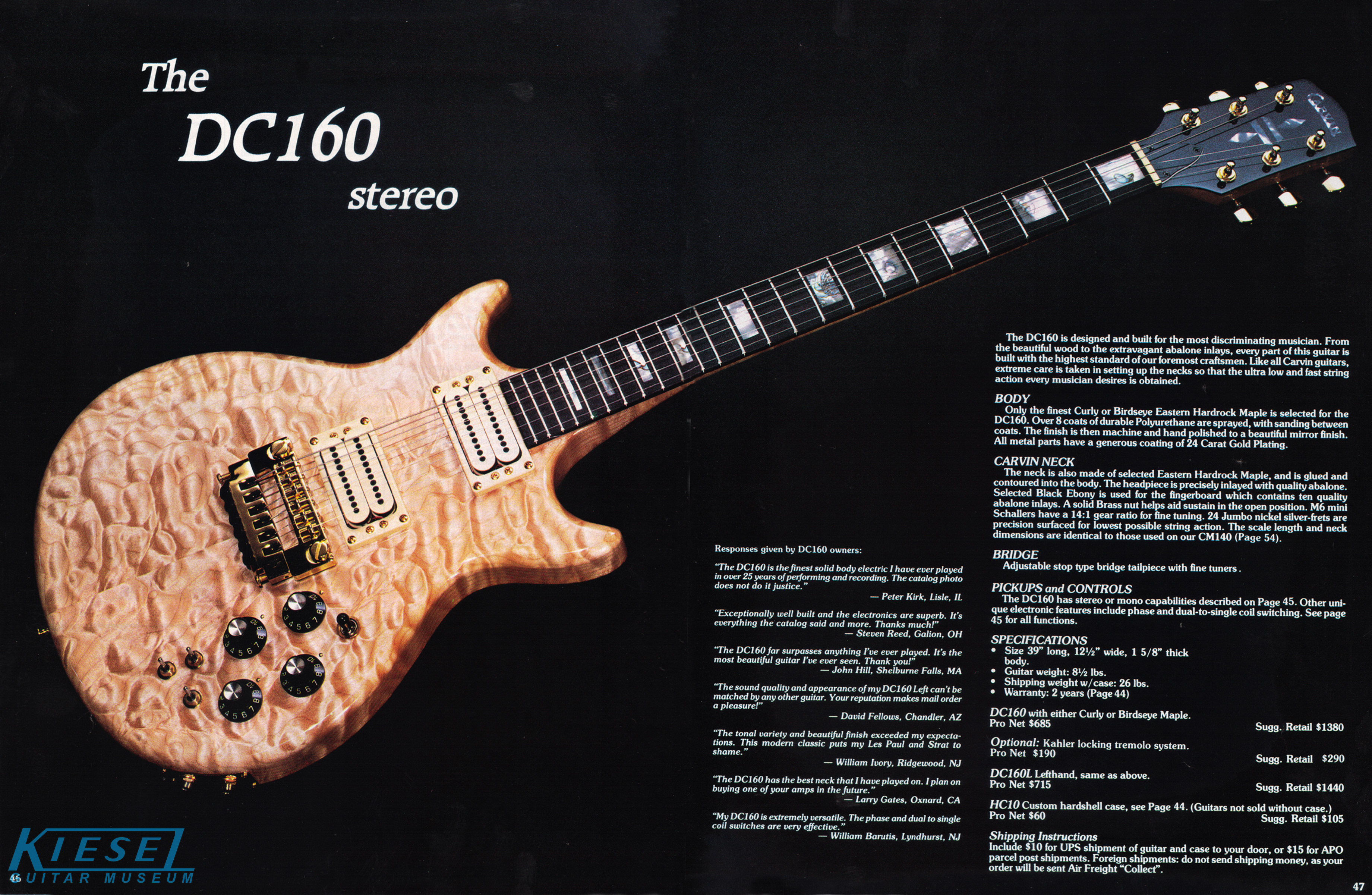 The DC160 was unchanged for 1984, but it did get a new catalog photo showing the FTB6 bridge that was introduced in 1983. The price of the DC160 remained $685, or $715 for a left-handed model. The optional Kahler Pro tremolo was an additional $190. The HC10 hardshell case was $60.