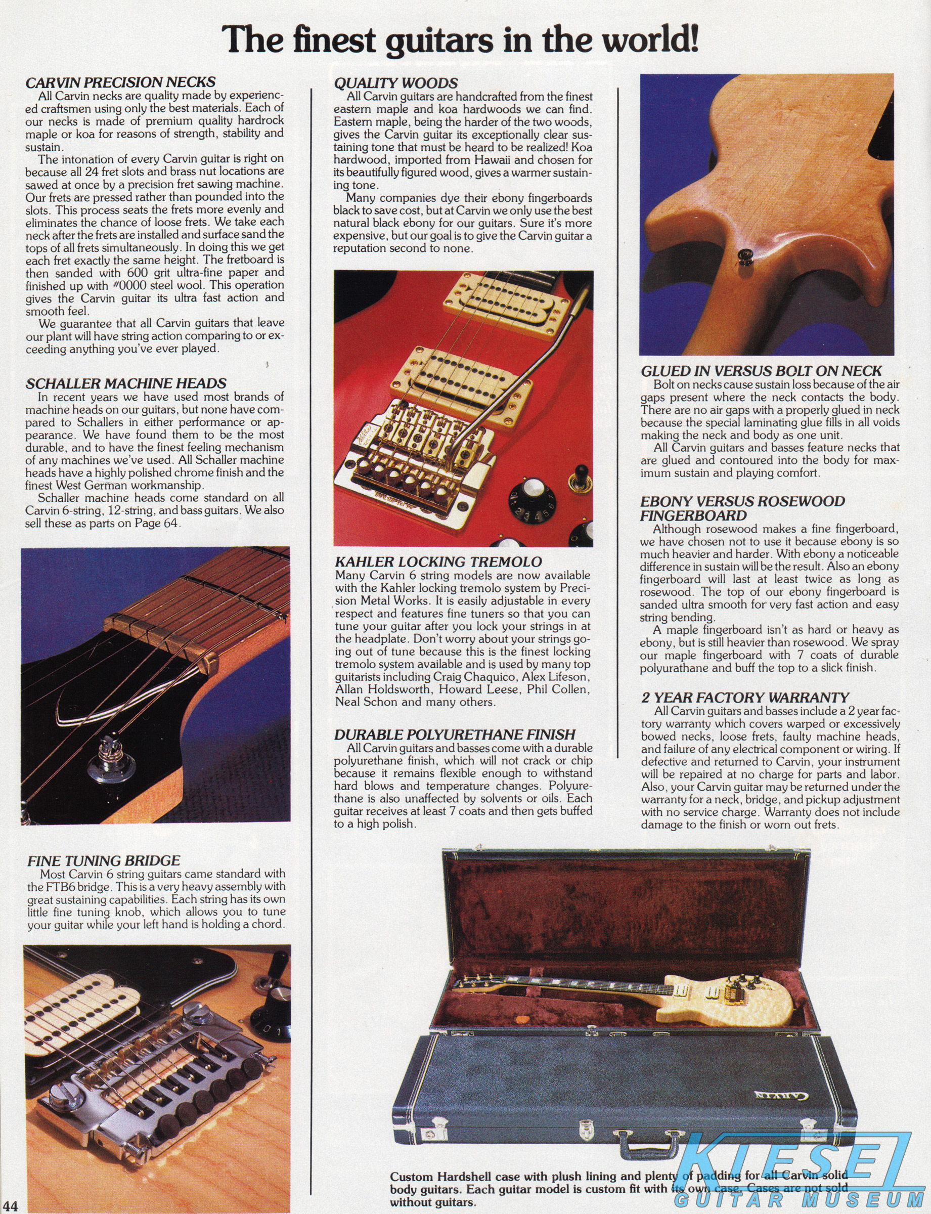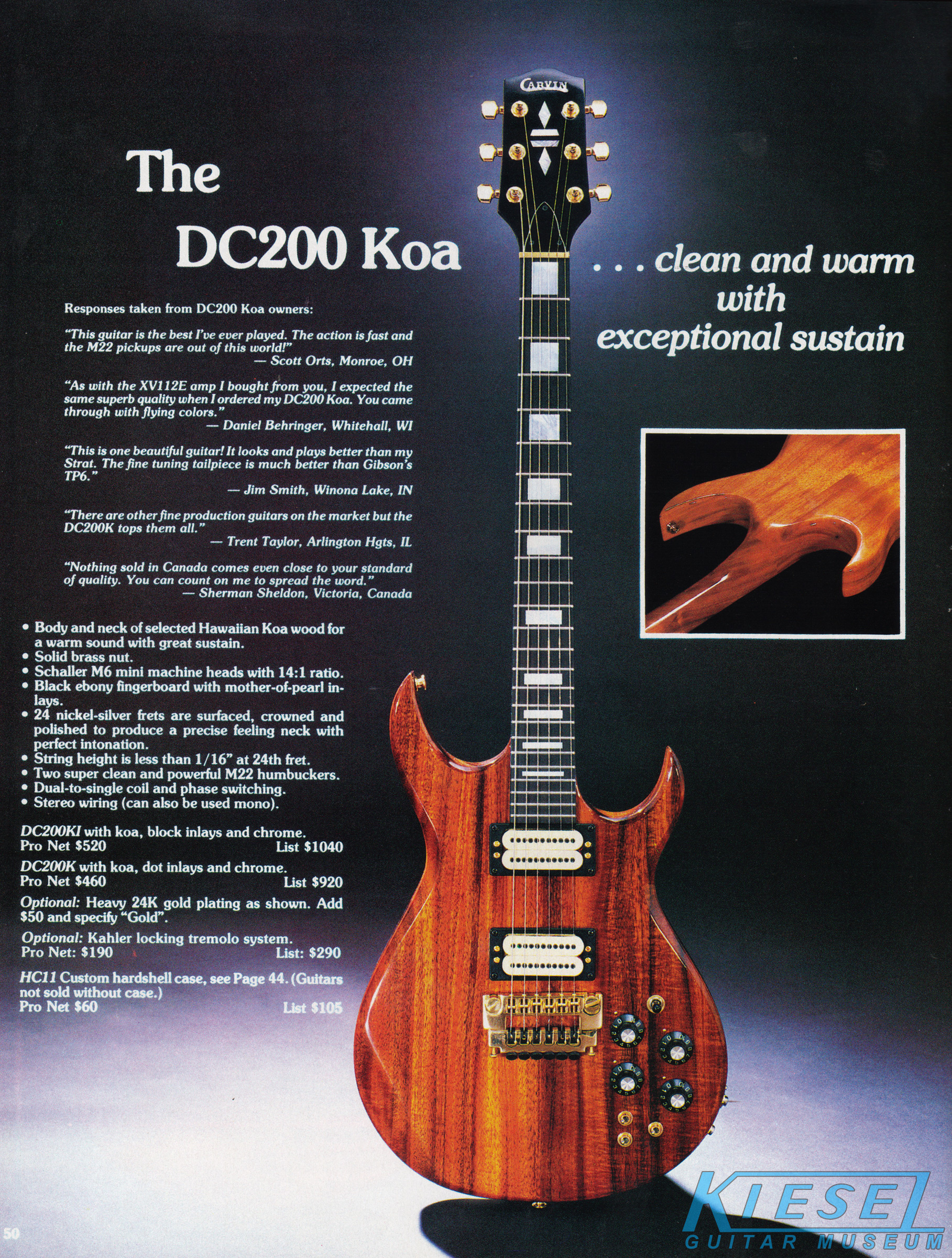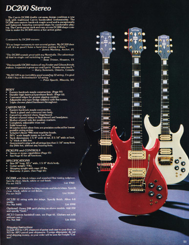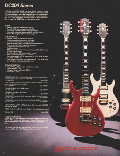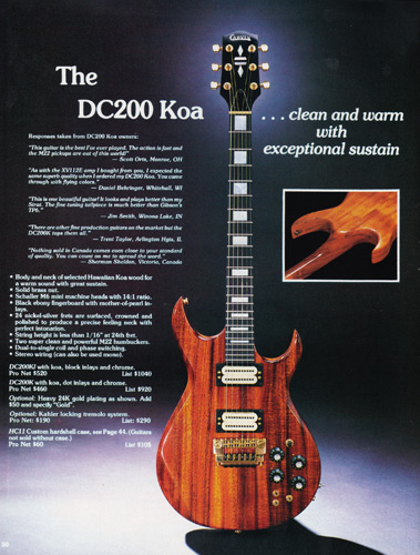 The DC200 Koa got a new catalog photo, but other than that, it remained the same as 1983, including the price. The DC200 Koa came standard with chrome hardware, MOP dot inlays, stereo wiring and the same electronics of the DC160. Gold hardware was a $50 option, and abalone block inlays were a $60 option. The base price of the DC200K was $460, and the HC11 hardshell case was $60.