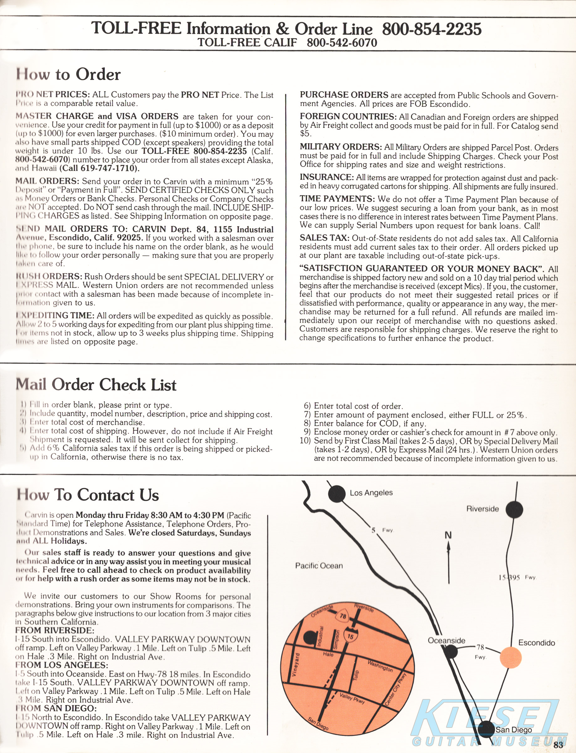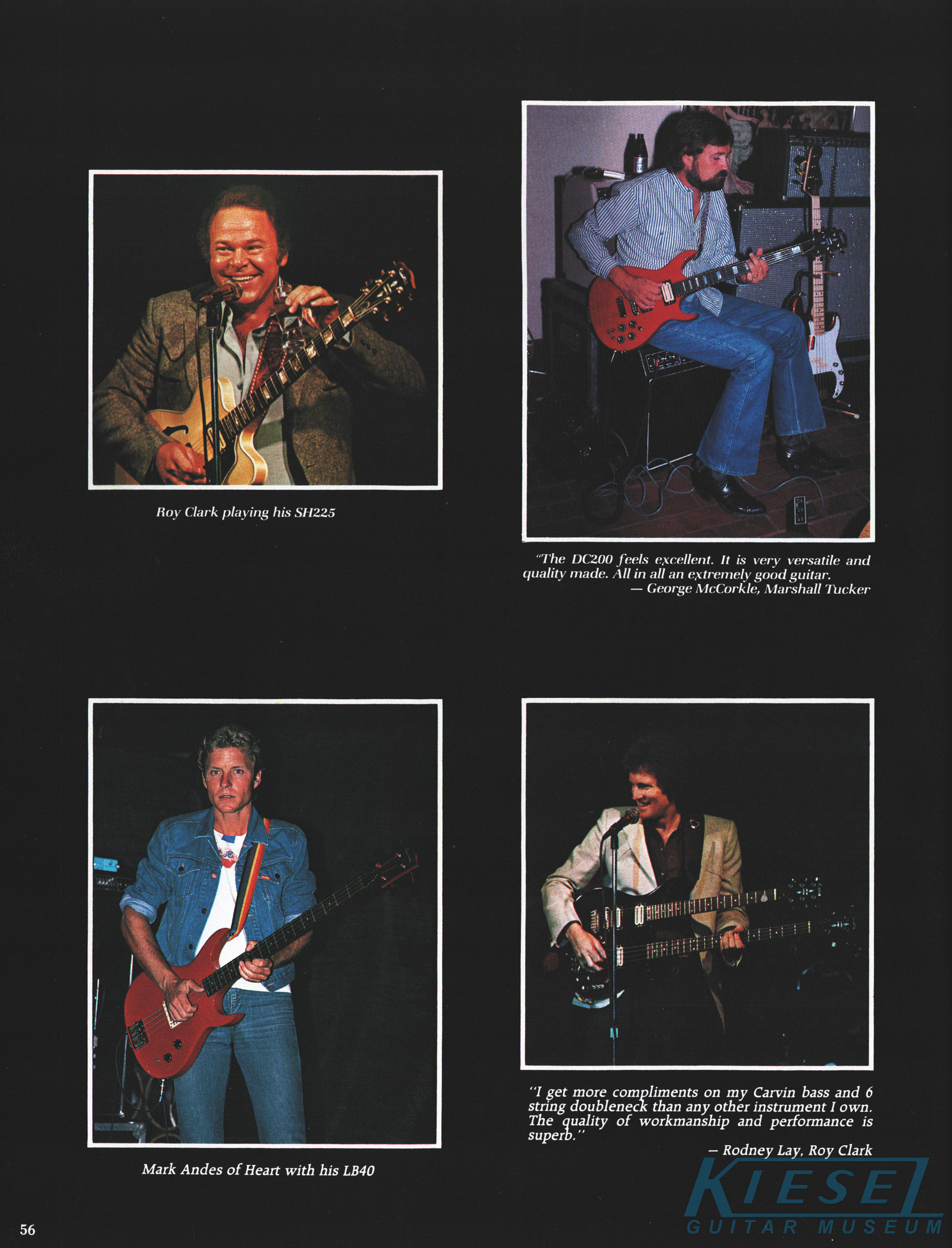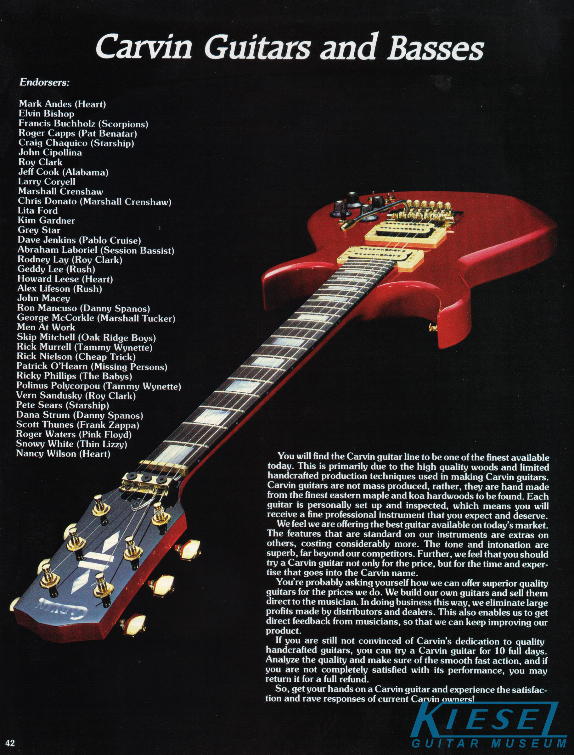 The DC200 Koa got a new catalog photo, but other than that, it remained the same as 1983, including the price. The DC200 Koa came standard with chrome hardware, MOP dot inlays, stereo wiring and the same electronics of the DC160. Gold hardware was a $50 option, and abalone block inlays were a $60 option. The base price of the DC200K was $460, and the HC11 hardshell case was $60.