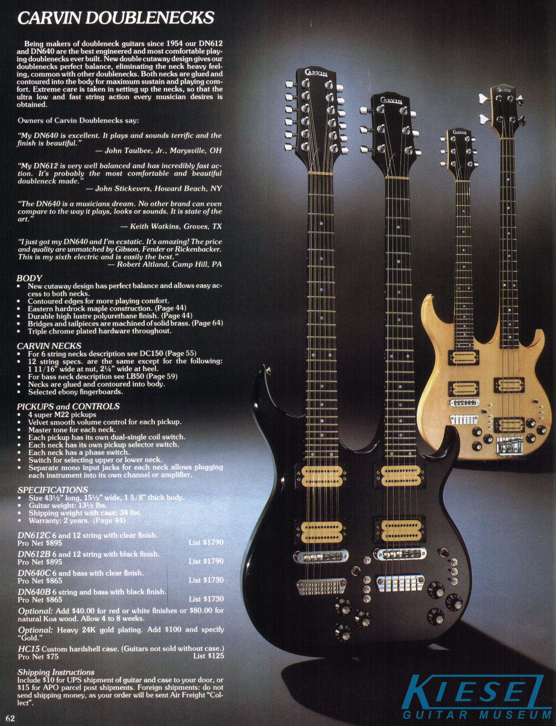 Carvin also continued the doubleneck tradition with the DN612 (6-string/12-string guitar) and DN640 (6-string guitar and 4-string bass). These