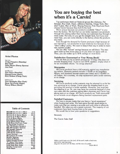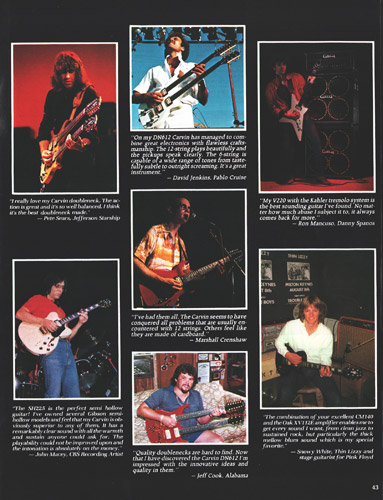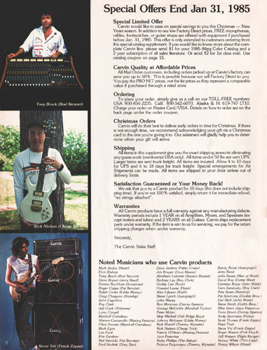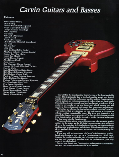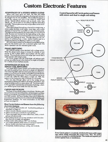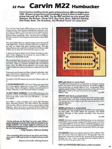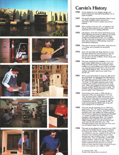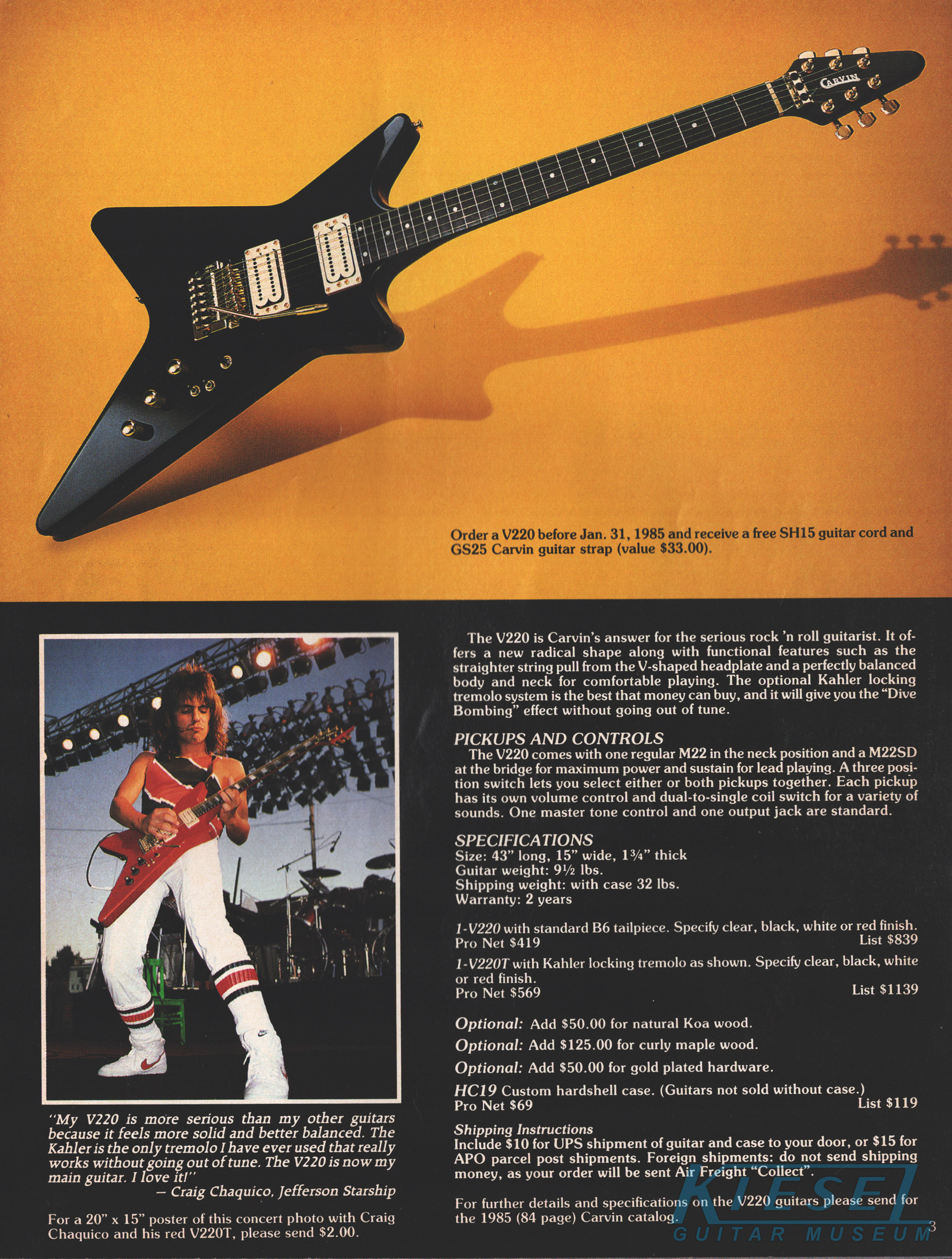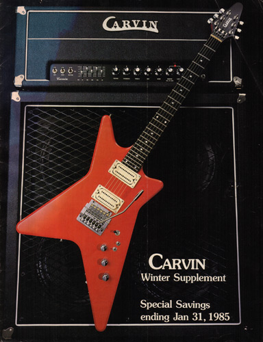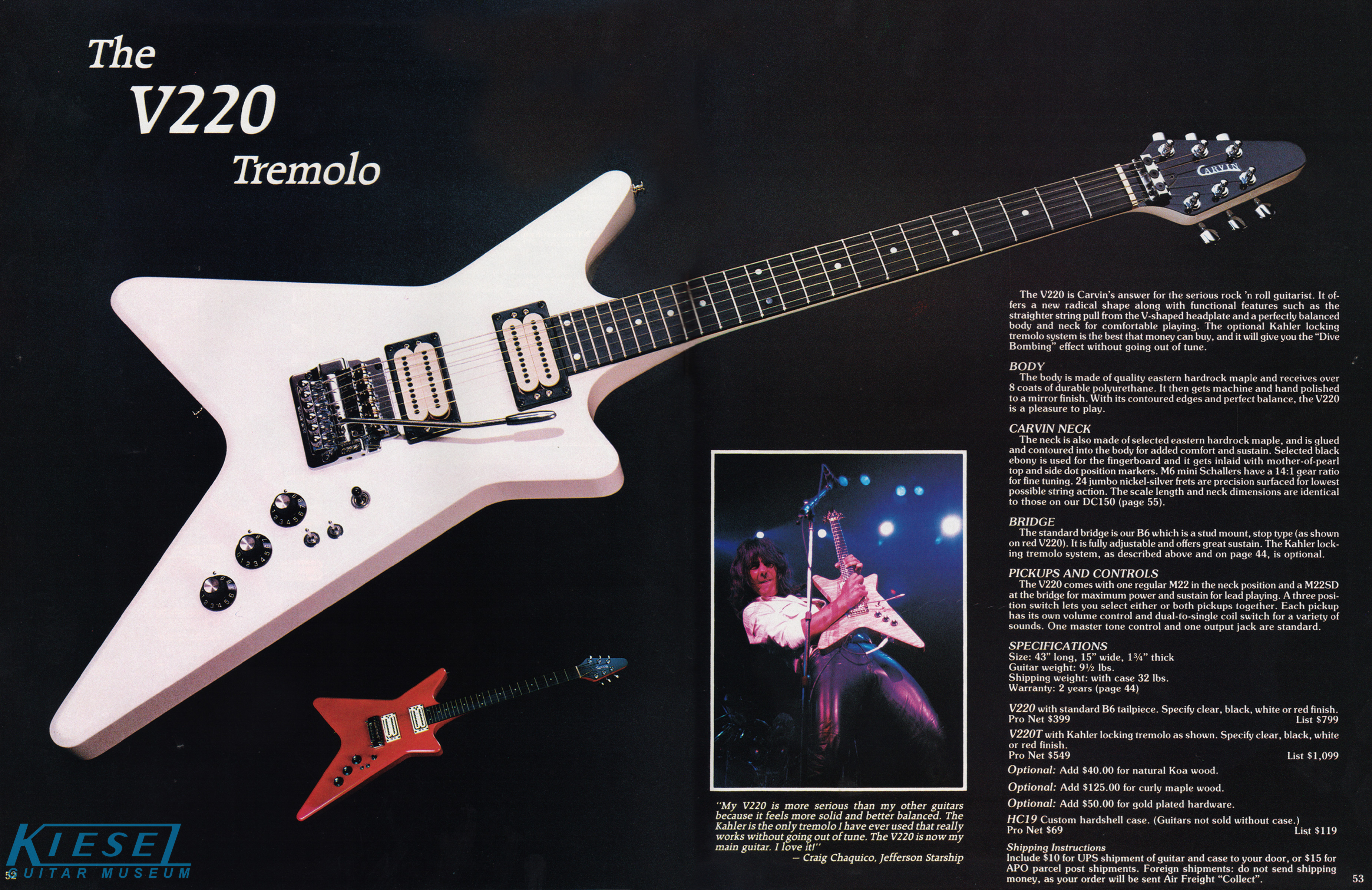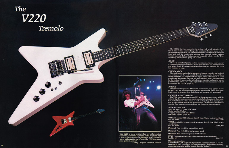 The V220 was a guitar that was ahead of it's time. It had a totally unique look, and was destined to become one of the most popular models Carvin had offered. With MTV and other music video outlets, the V220 was seen everywhere, and was made more popular by the resurgence of Jefferson Starship (now just called Starship), whose lead guitarist (and future Carvin signature model inspiration) Craig Chaquico was often seen with one of his many V220s. The body and set neck were hardrock maple, and was available in black, white, red or clear finishes. Curly (flamed) maple and koa were also offered. Electronics consisted of an M22 pickup in the neck position, and an M22SD pickup in the bridge position, with dual volume, single tone, coil splitters and a 3-way pickup selector switch. Chrome was standard on the Schaller mini M^ tuners and B6 bridge or Kahler tremolo. MOP dot inlays were standard on the 24-fret ebony fingerboard. Base price on the V220 was a very reasonable $399. With the Kahler Pro tremolo, it was $549. Koa wood was an additional $40, and curly maple was an additional $125. Gold hardware was $50. The HC19 hardshell case was $69.