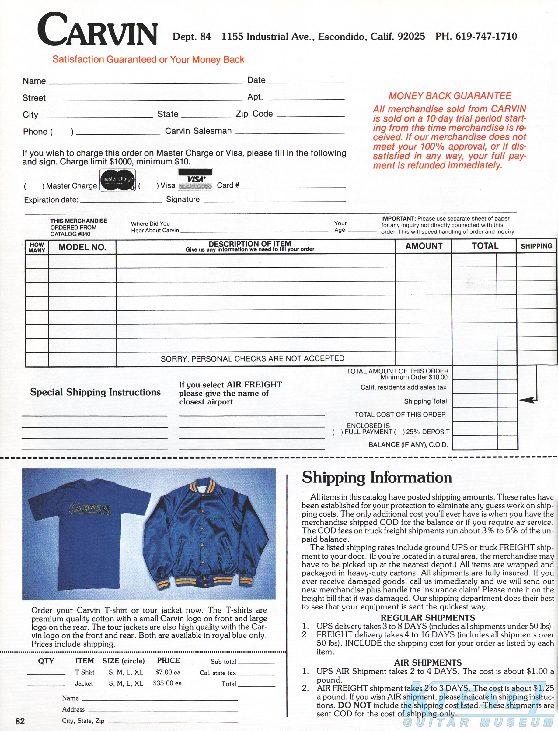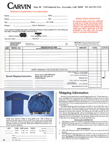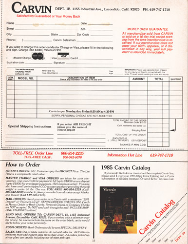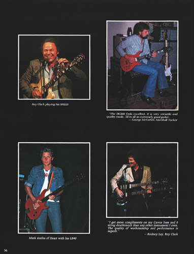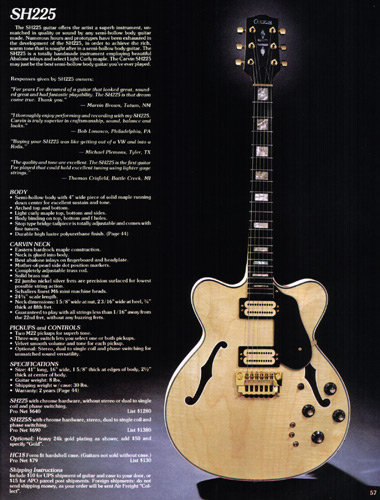 The SH225, made by Carvin from Hofner components, was unchanged for 1984. Standard features on this semi-hollow electric were dual M22 pickups, dual volume and tone controls, pickup selector switch, ebony fingerboard, abalone block inlays and natural finish. Also offered was the SH225S, which featured stereo wiring, and coil and phase switches. Gold hardware was an addition $50, and a black laminated pickguard could be added for $15. Base prices increased $20, to $640 for the SH225, and $690 for the SH225S. The HC18 form-fitted hardshell case was $79.